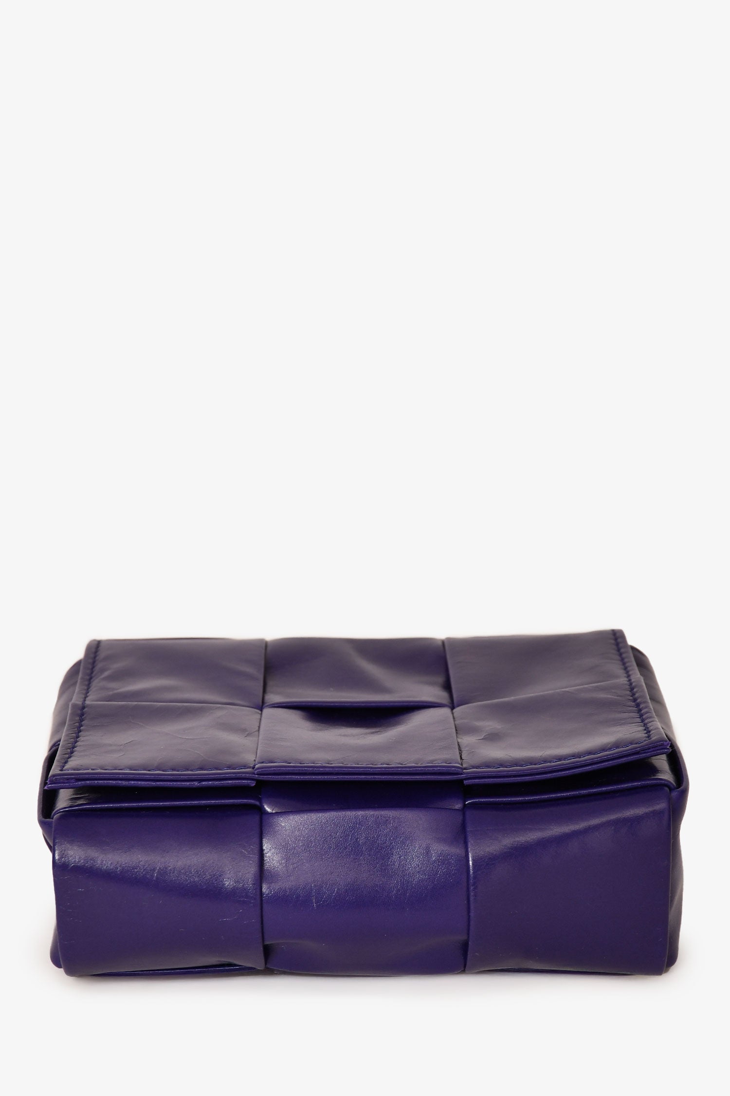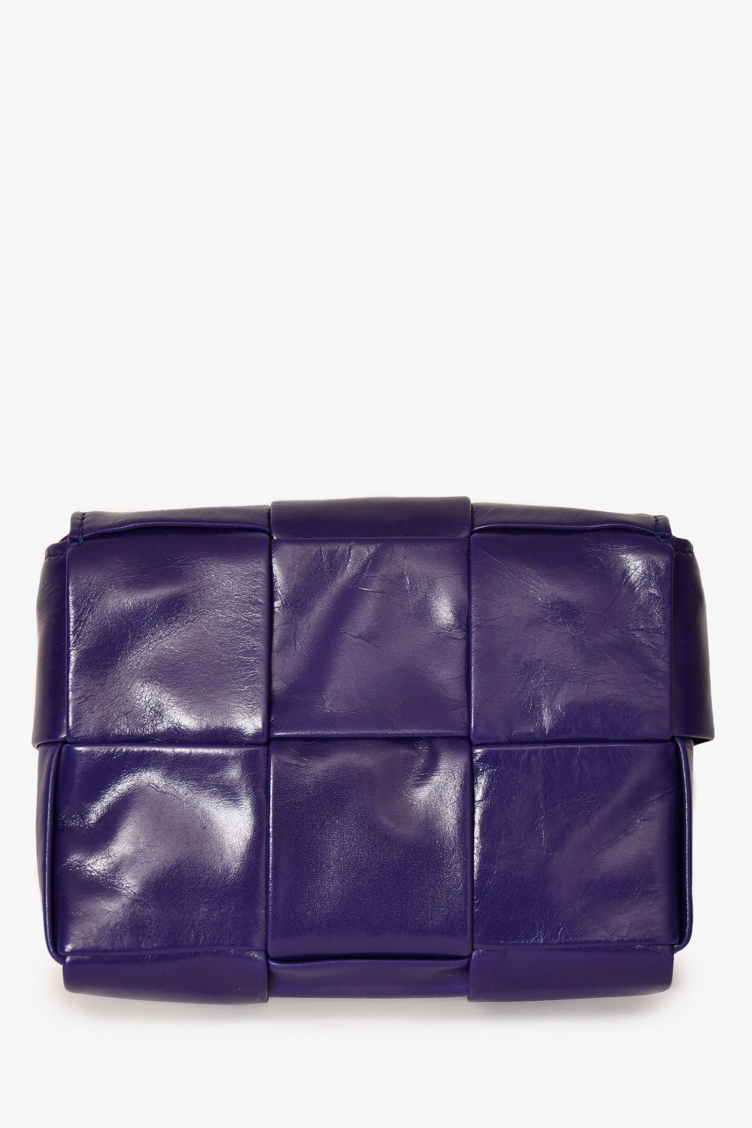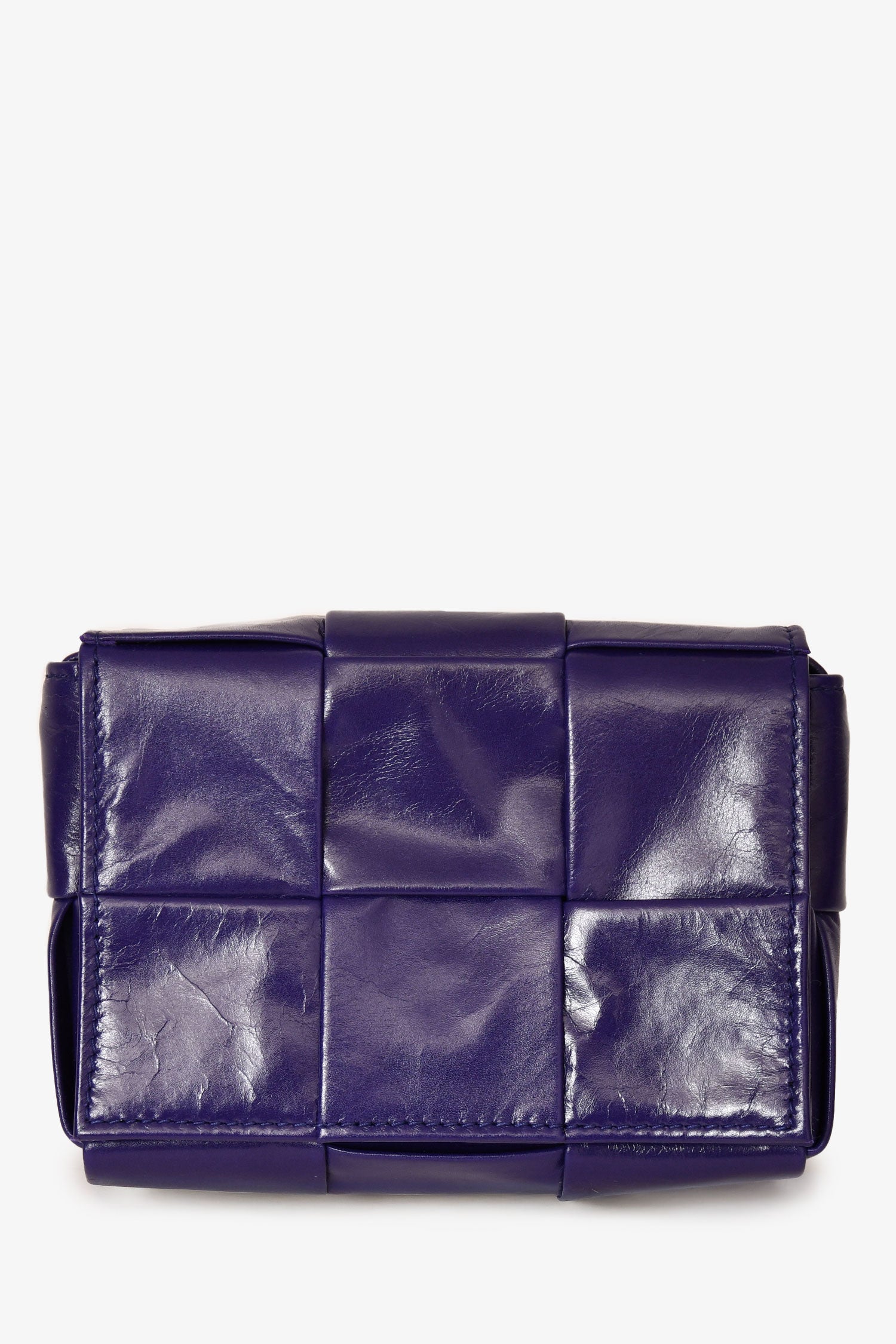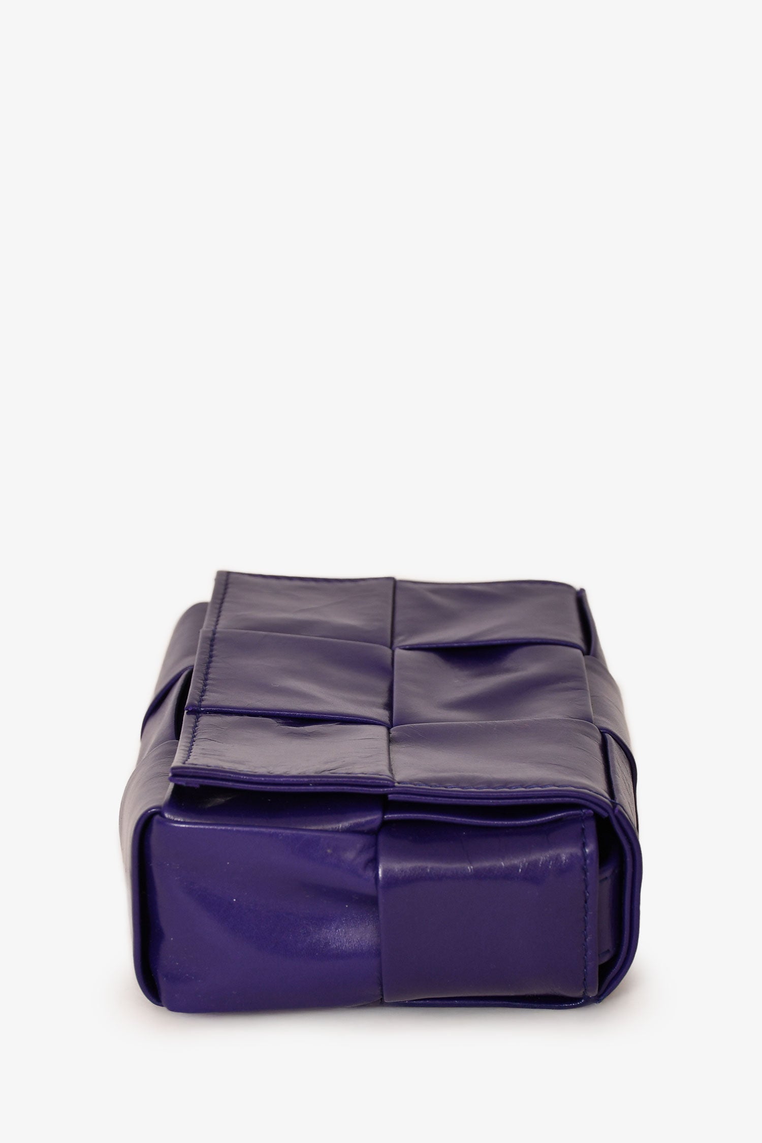 Bottega Veneta Purple Leather Mini Cassette Crossbody. Adjustable strap. Single interior wall slip pocket. Fold-over flap with magnetic closure. Tonal stitching. Comes with dust bag.