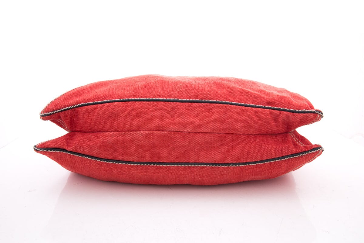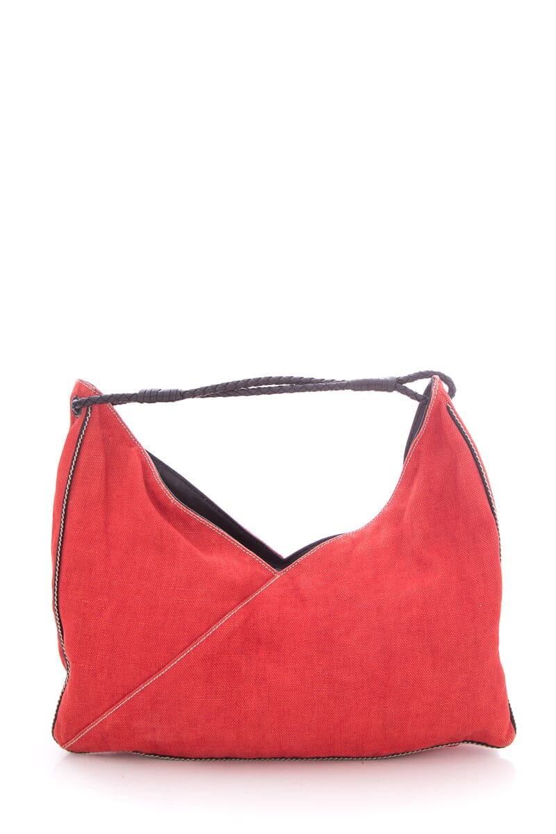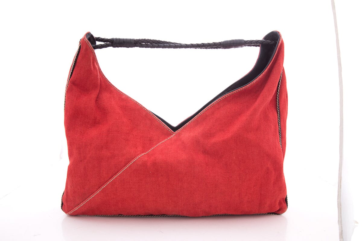 Bottega Veneta Red Handbag with Braided Strap and V-Shape. This item is in good condition; slight fading on corners and some marks on interior lining.