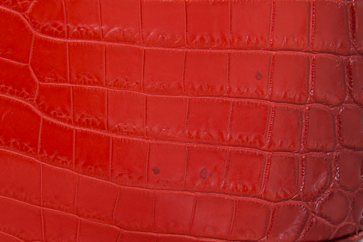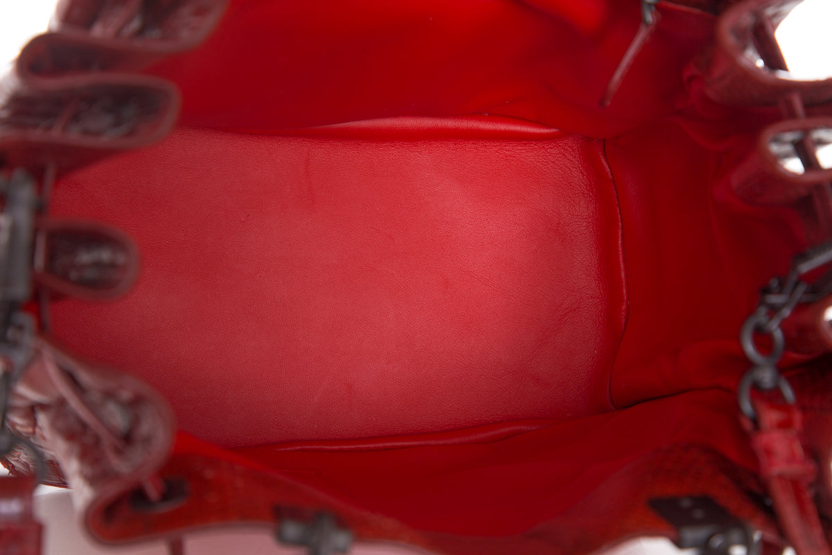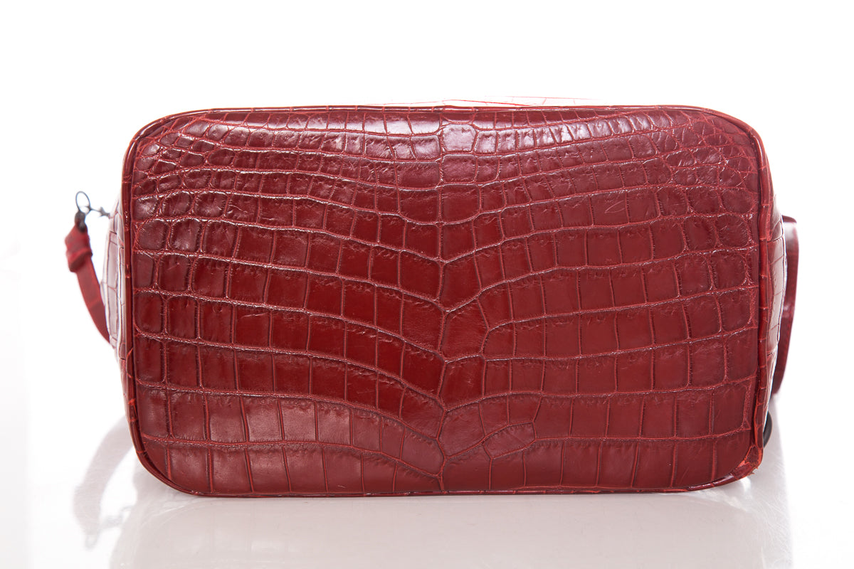 Bottega Veneta Spring / Summer 2016 Red Vesuvio Croc Bucket Shoulder Bag with brushed gun metal hardware , dual handle straps, and removable shoulder strap.