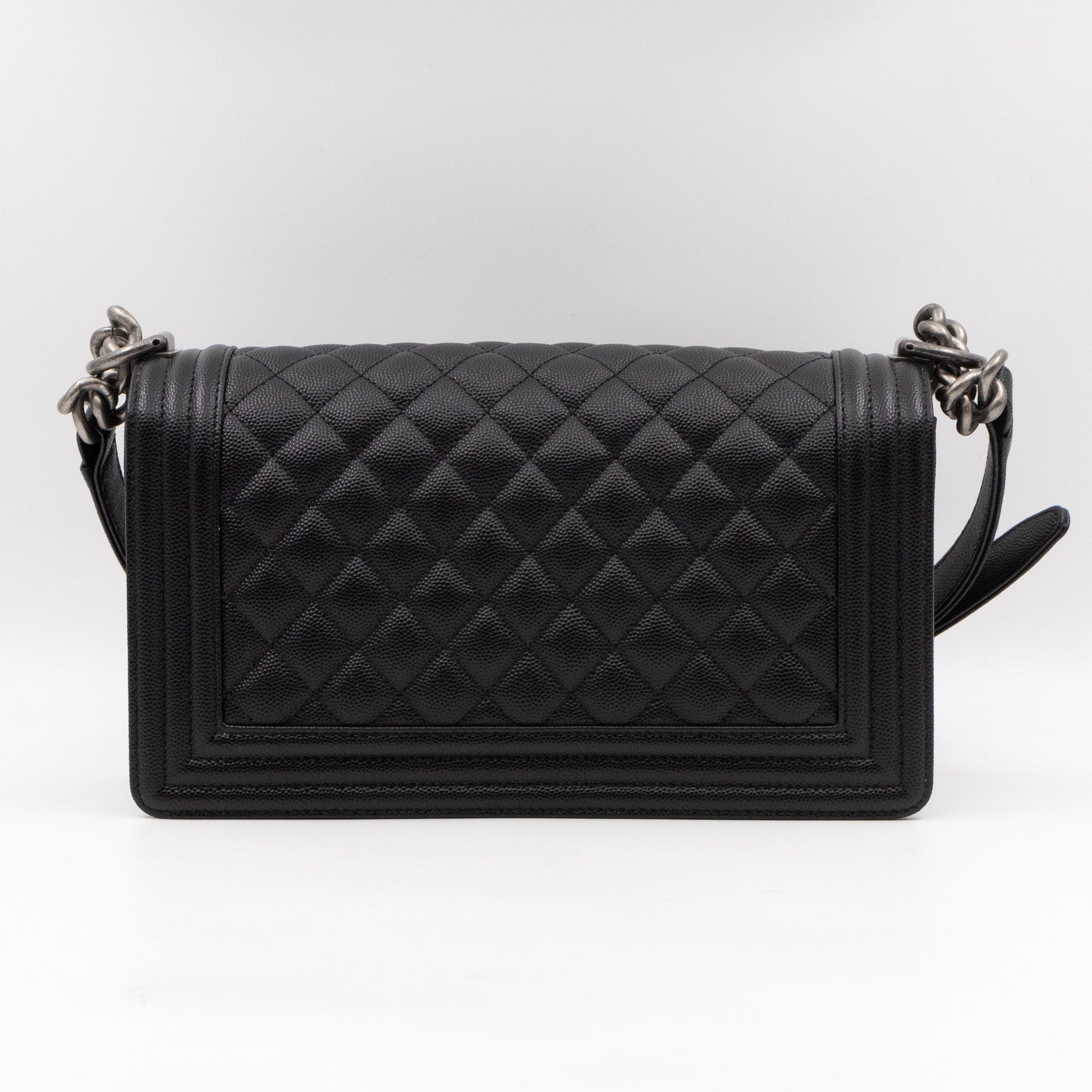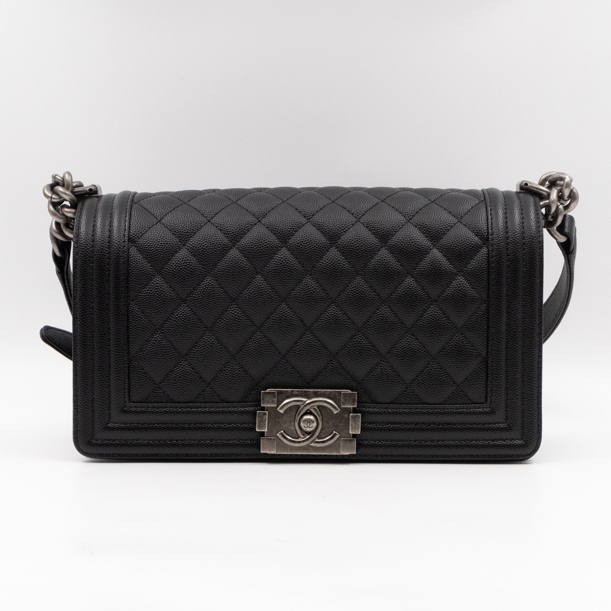 This is the Chanel Boy bag in the popular medium size, a great size for evening use. It is originally from Cambon street in Paris. Made with caviar leather in black, combined with beautiful ruthenium hardware. This is a nice daily bag for fans of Chanel Boy bags. Can be worn crossbody or on the shoulder. Retail price €6750.