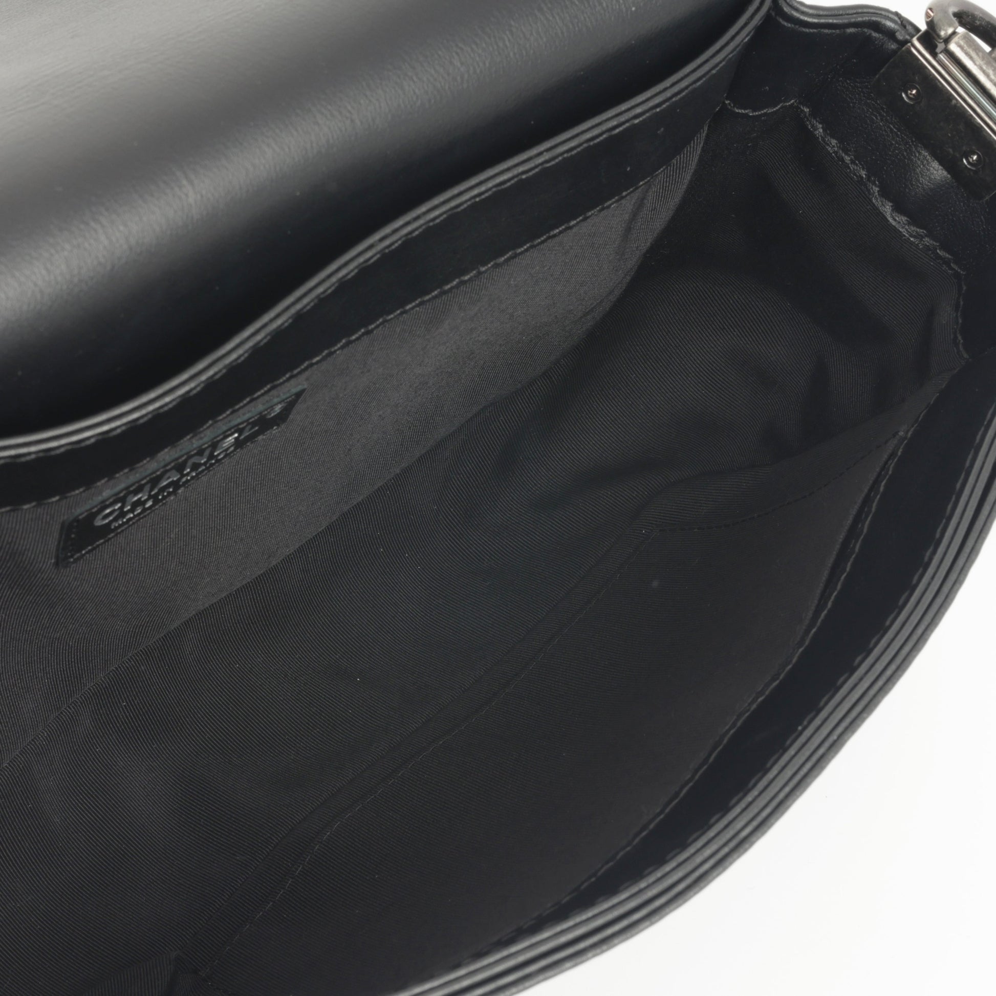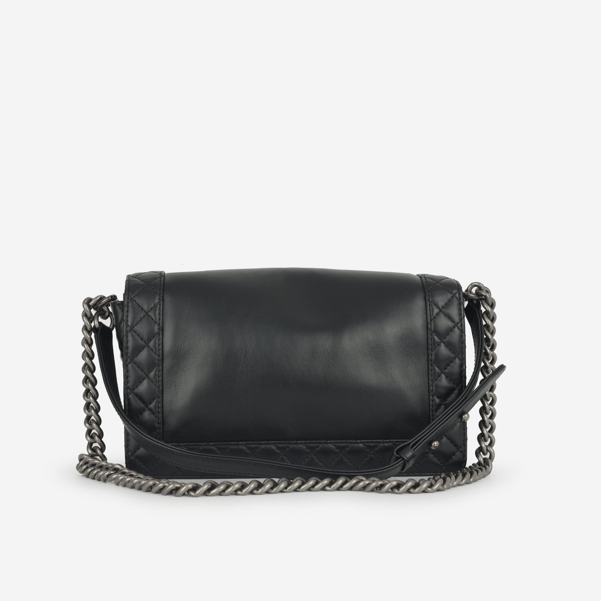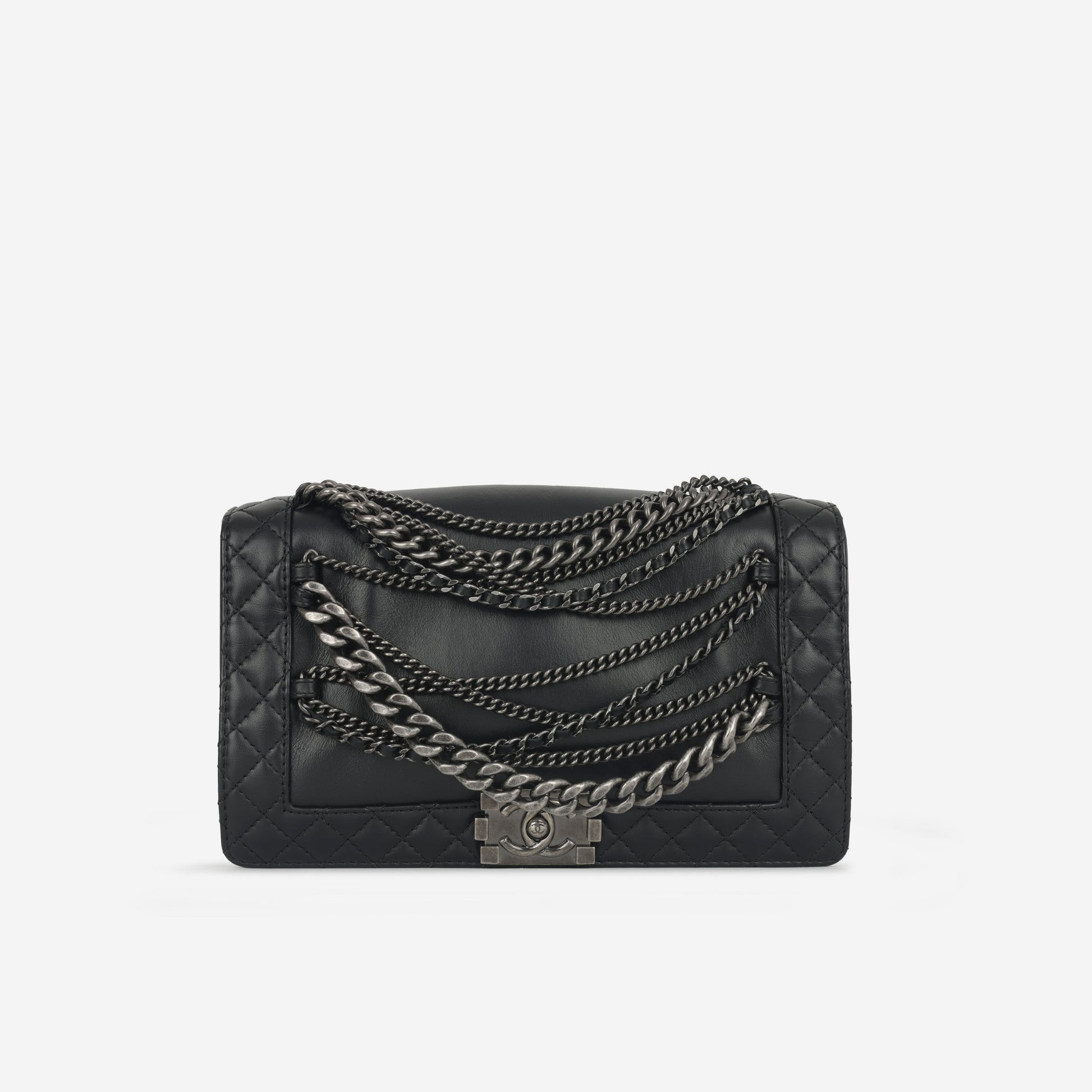 The New Medium boy bag in Enchained Black Lambskin is a bold reimagining of a classic design. Crafted from soft yet durable lambskin leather, its rich black hue is enhanced by the luxurious Ruthenium Hardware (RHW), giving it a sleek, modern edge. The bag’s signature chain detailing, with its bold and dynamic appearance, adds an extra layer of sophistication and structure.