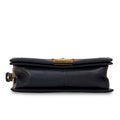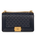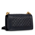 Chanel presents one of its highly-acclaimed and most sought after bags, the Chanel Boy Bag in size Old Medium in the wonderful and limited combination of Deep Navy Lambskin Leather and Antique Gold Hardware. As designed by Karl Lagerfeld, the Boy Bag collection was established to embody boyish charm and femininity.