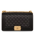 Chanel presents one of its highly-acclaimed and most sought after bags, the Chanel Boy Bag in size Old Medium in the wonderful and limited combination of Deep Navy Lambskin Leather and Antique Gold Hardware. As designed by Karl Lagerfeld, the Boy Bag collection was established to embody boyish charm and femininity.