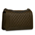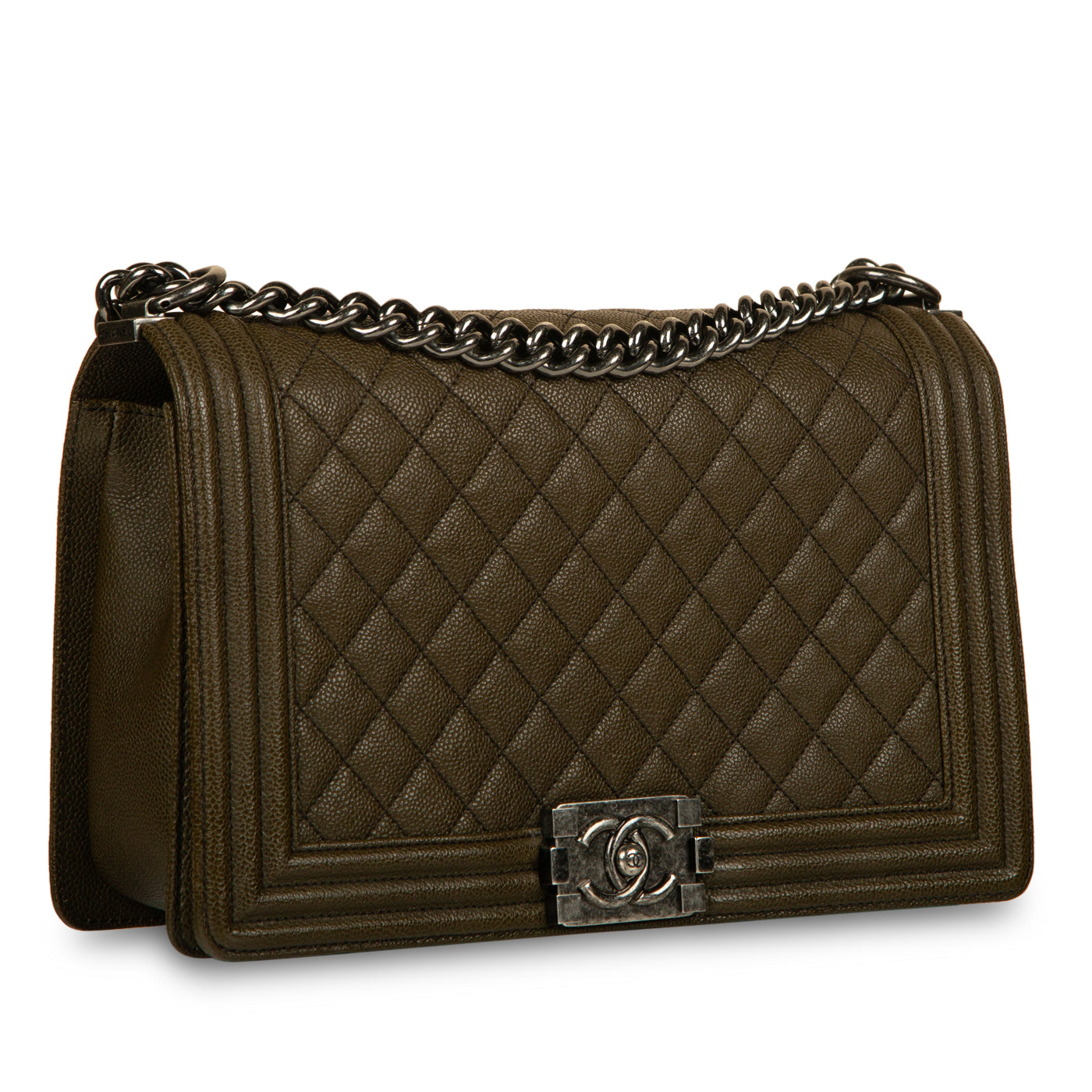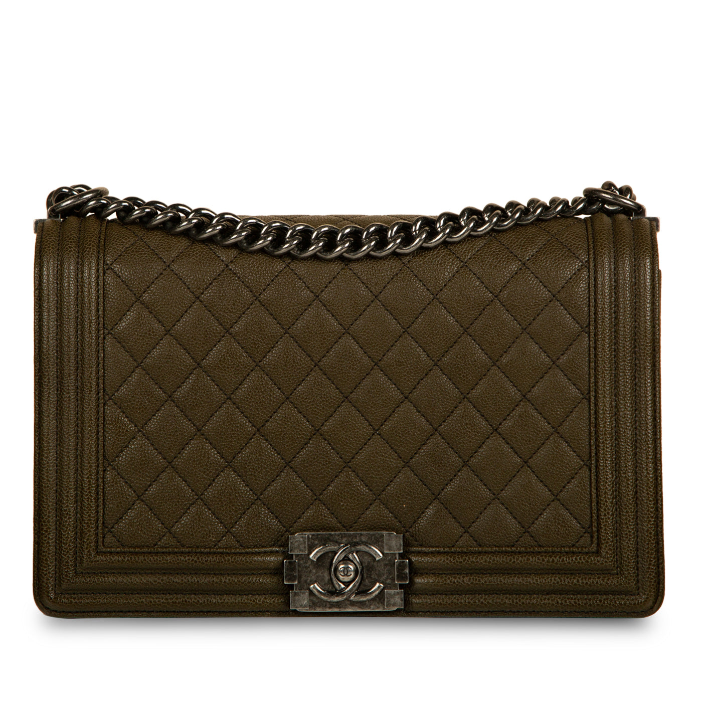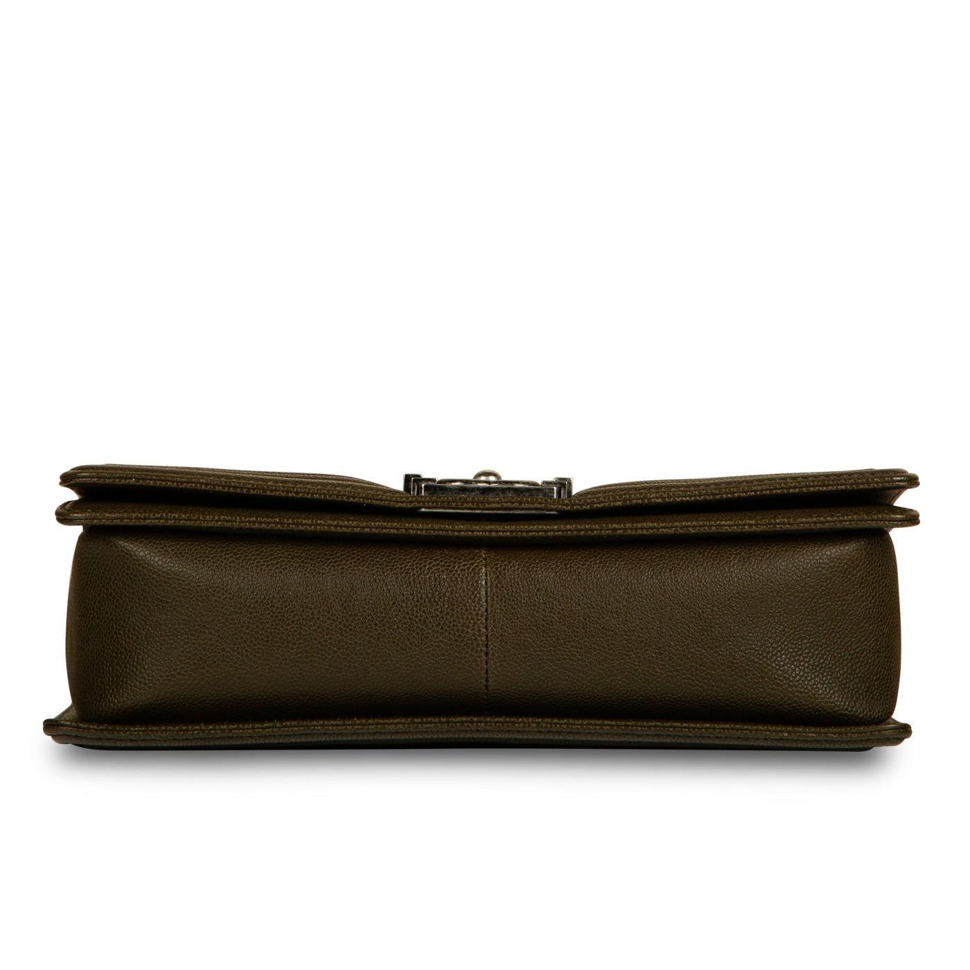 Chanel presents one of its highly-acclaimed and most sought after bags, the Chanel Boy Bag in size Old Medium in the wonderful Khaki Calfskin Leather and Antique Ruthenium Hardware. As designed by Karl Lagerfeld, the Boy Bag collection was established to embody boyish charm and femininity.