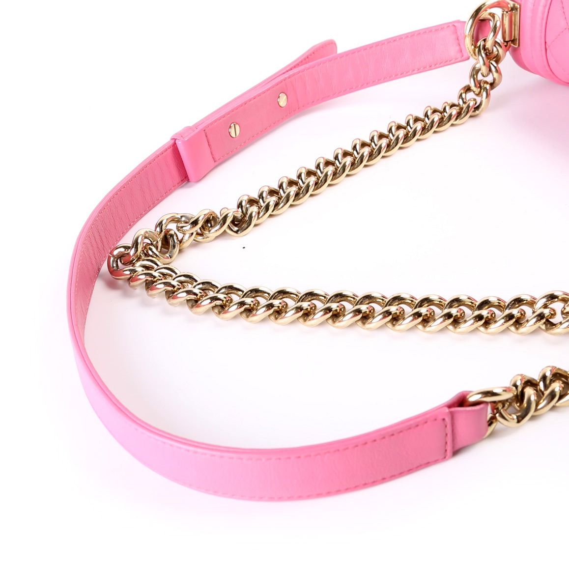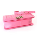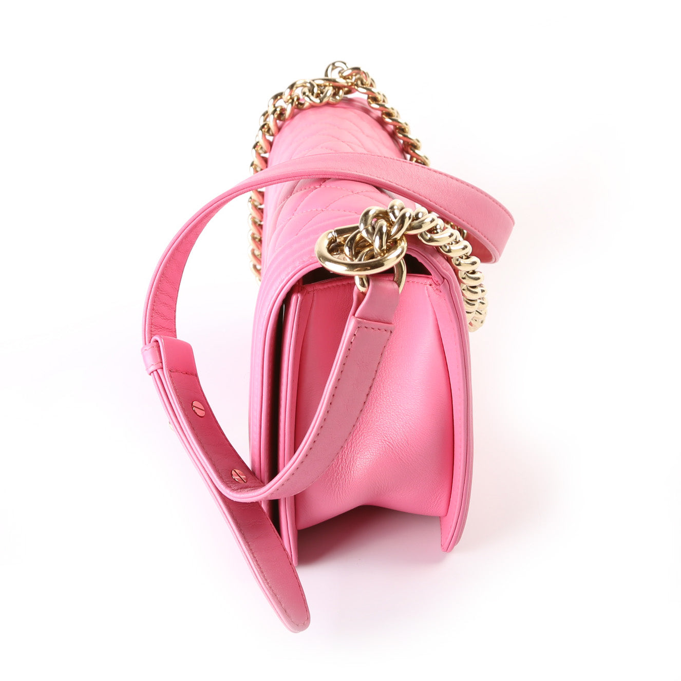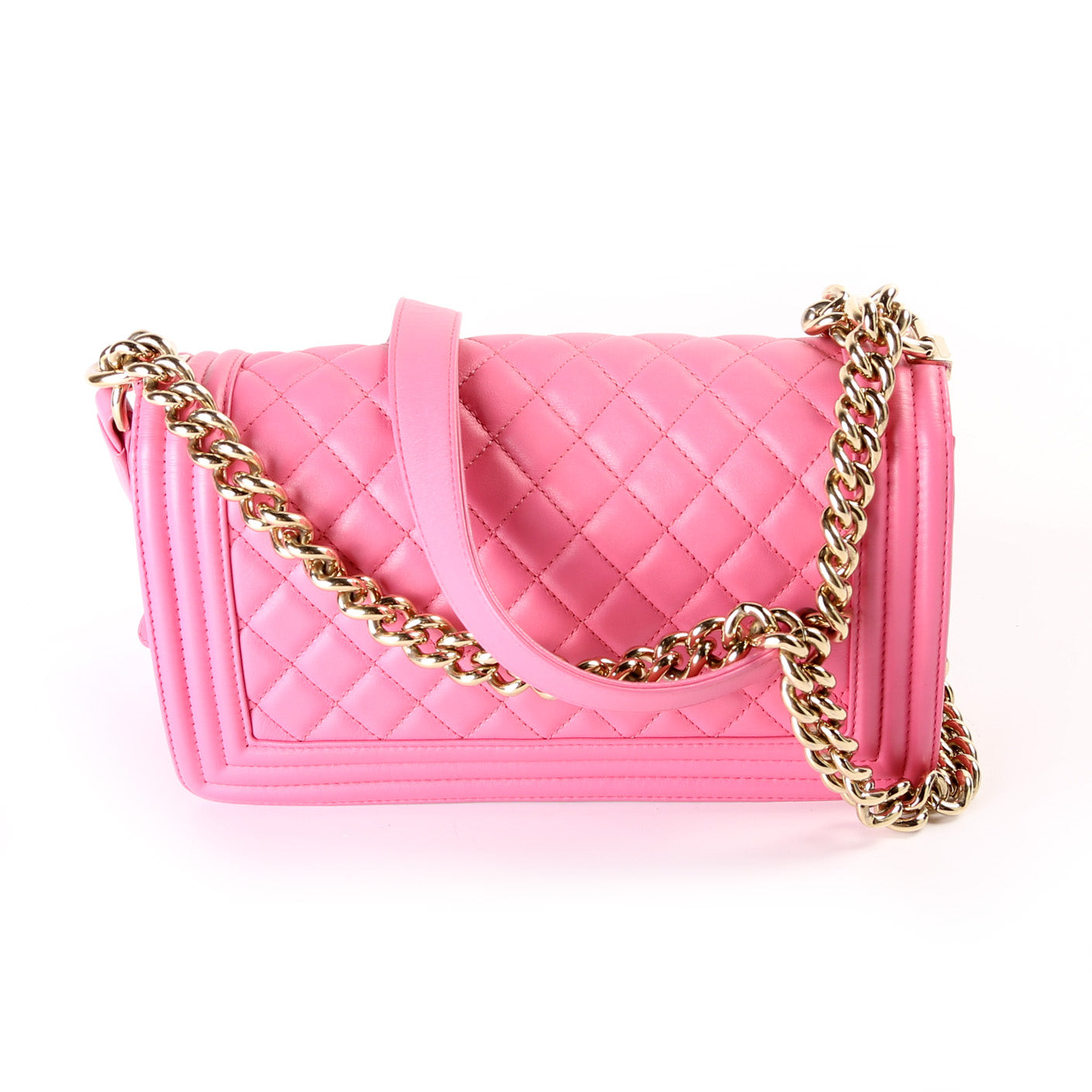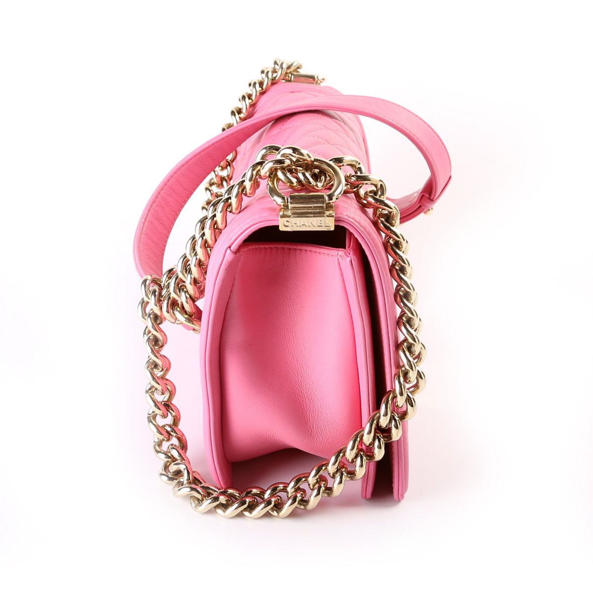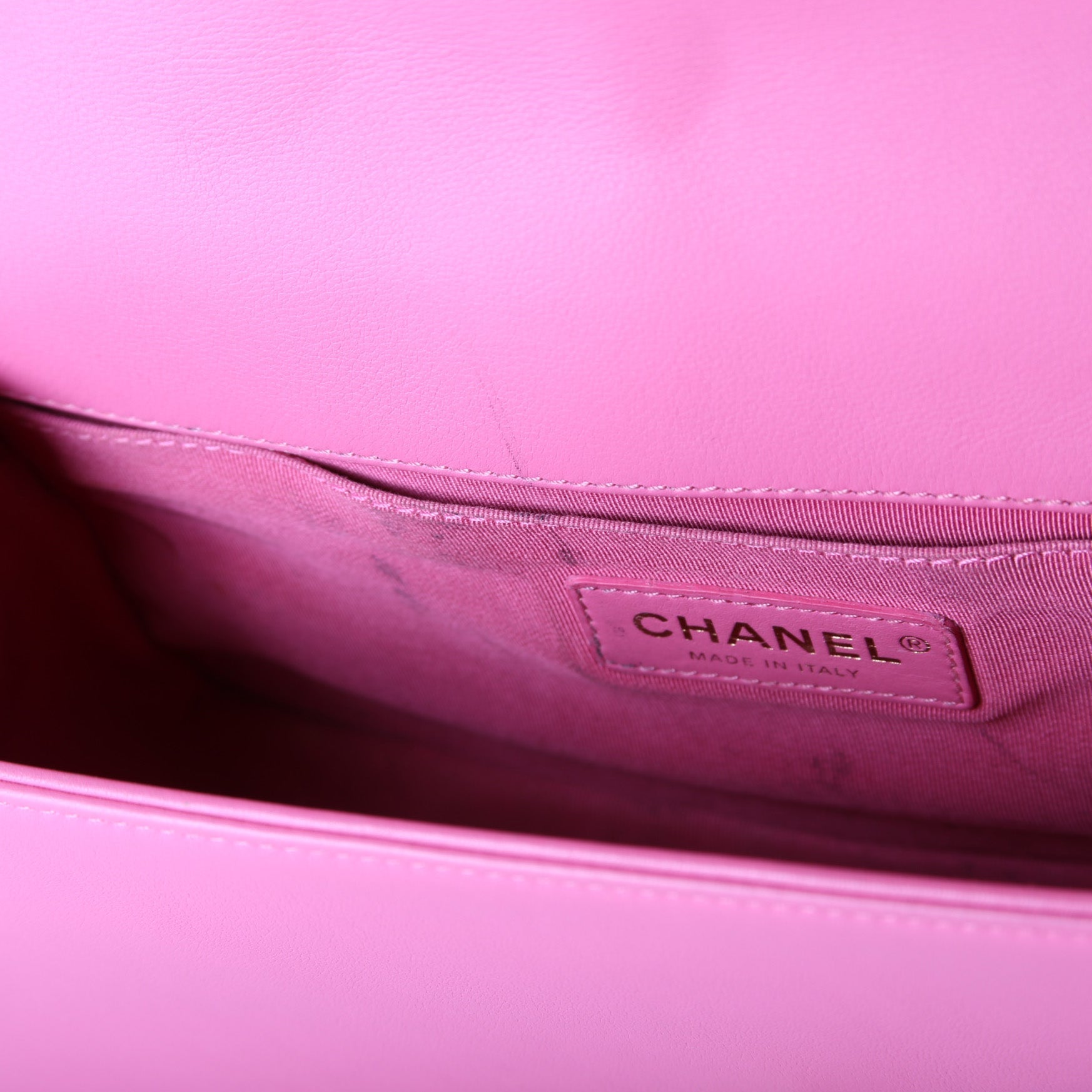 This Chanel Boy Flap Medium Newis eye catching bag. The exterior is in the classic Chanel Lambskin leather.