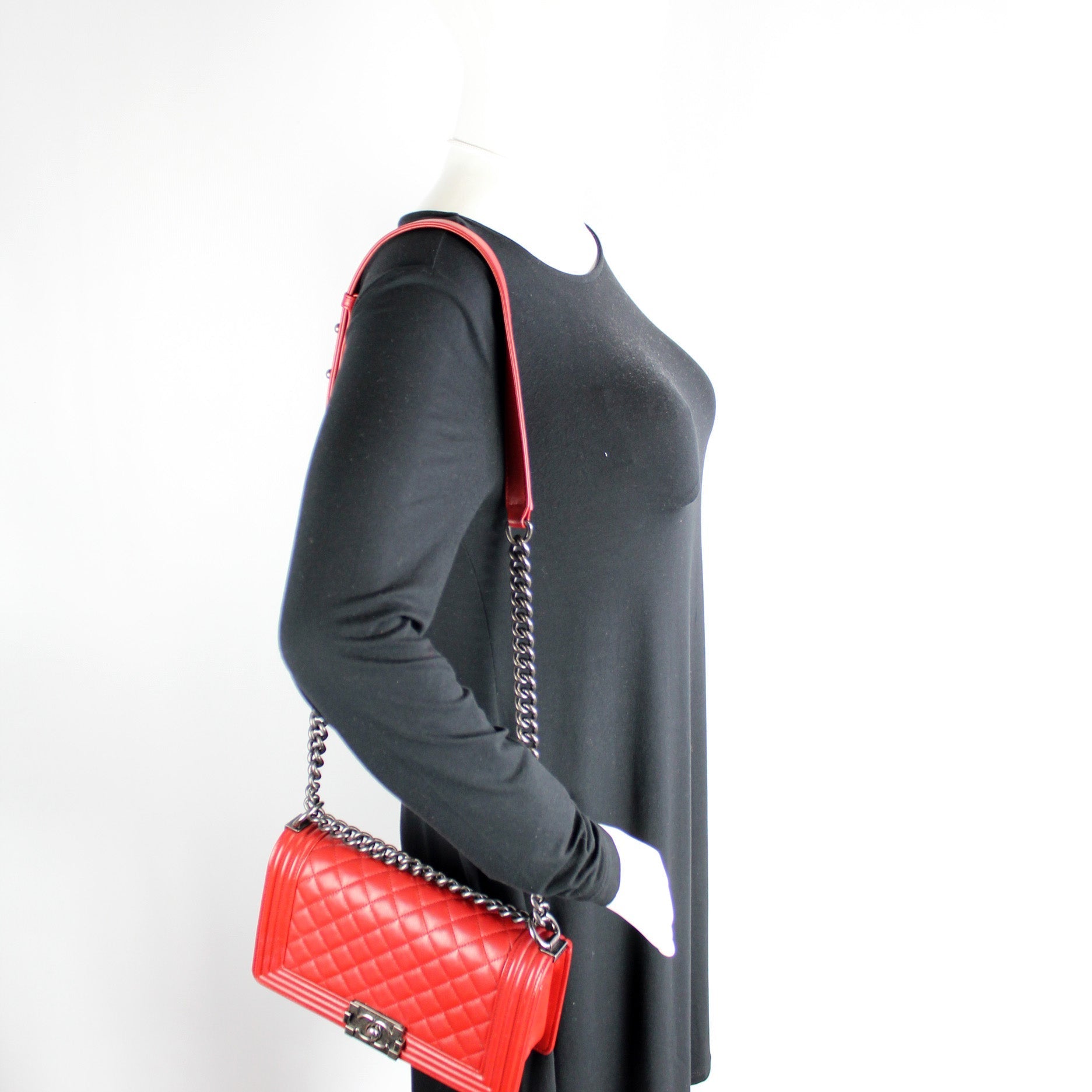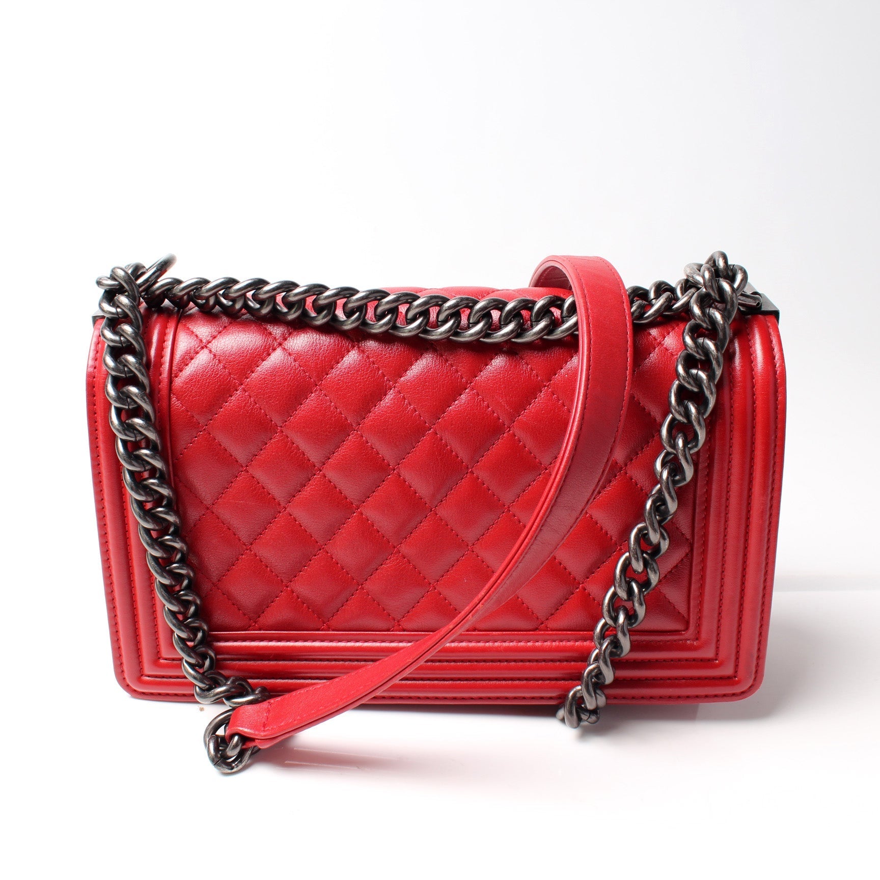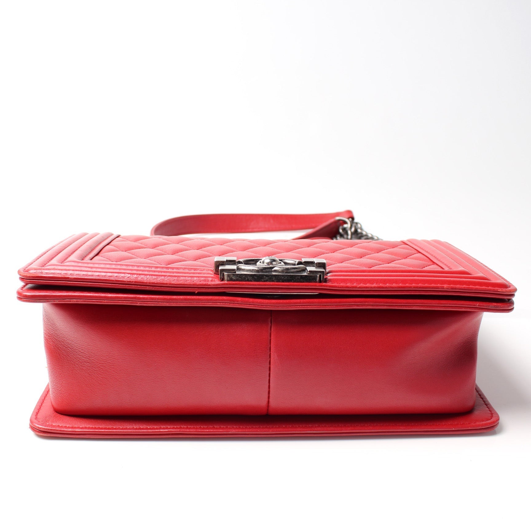 This Chanel Medium New Boy Flapis eye catching bag. The exterior is in the classic Chanel lambskin leather.