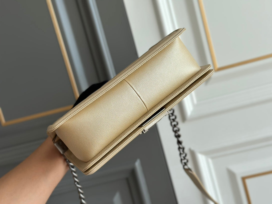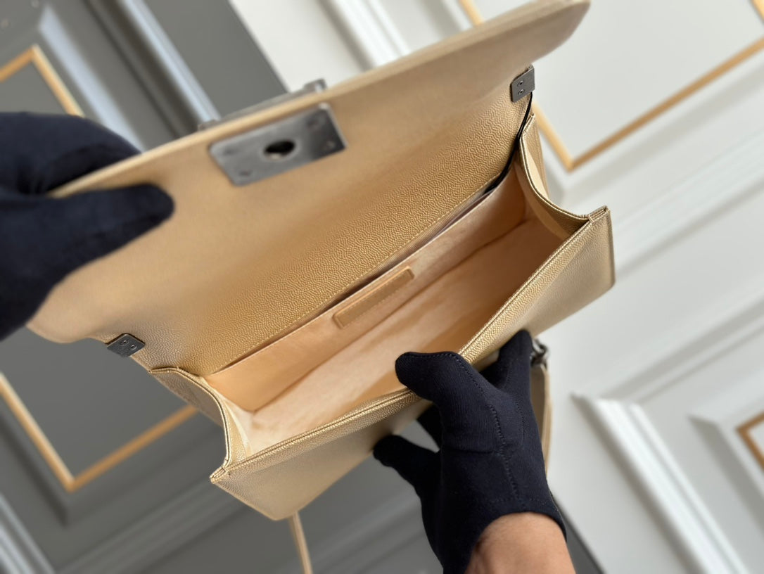 CHANEL boy medium 25 beige chevron caviar ruthenium hardware