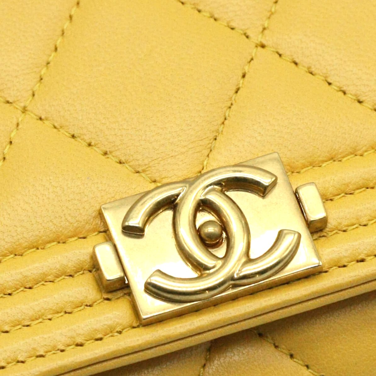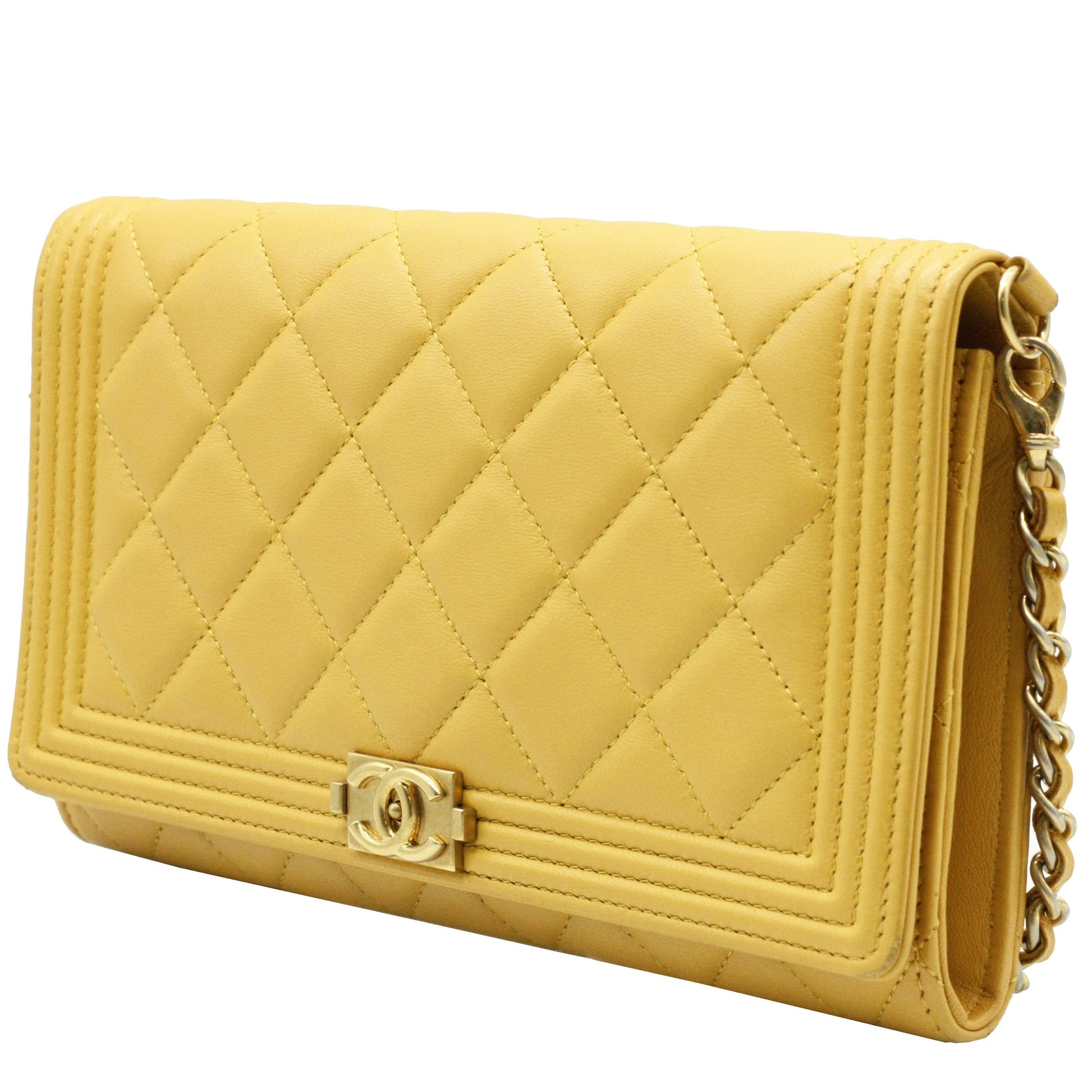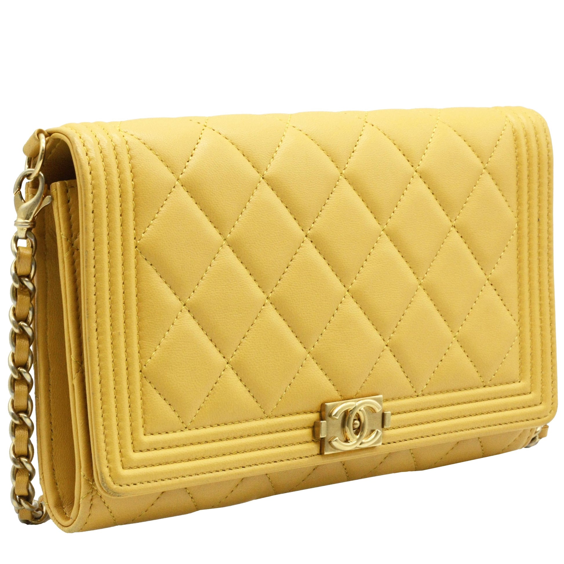| This stunning wallet on a chain is crafted of diamond quilted soft lambskin leather in yellow with a peripheral framing quilt. The bag features a leather threaded shoulder strap and a facing gold Chanel CC embellishment. The front facing flap opens to a matching fabric interior with pockets. This is an excellent bag for just the essentials for day or evening. | Exterior Material: Yellow diamond-quilted lambskin with antiqued gold-tone hardware, single chain-link and leather strap and snap closure at front flap. Interior Material: Tonal woven lining with dual compartments and three wall pockets; one with zip closure. Accessories: Card; Dust Bag; Bought Year: 2015 | ![]() |