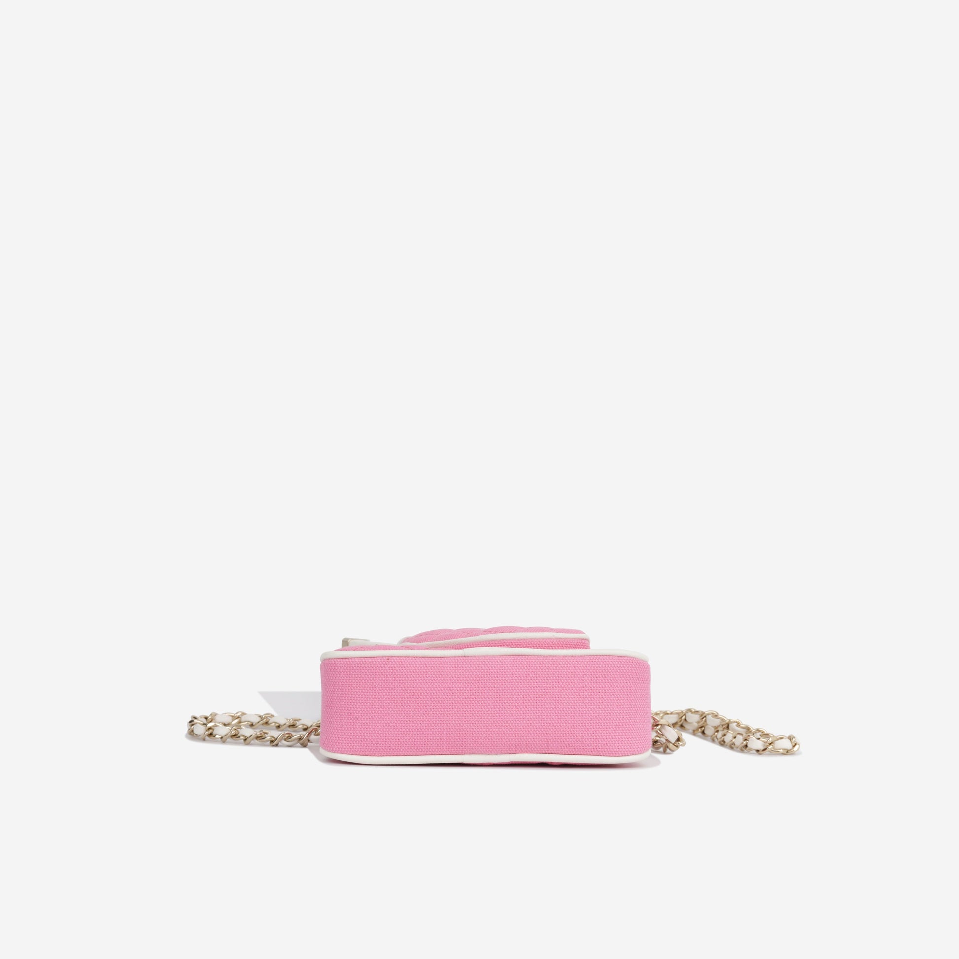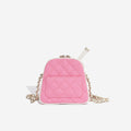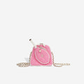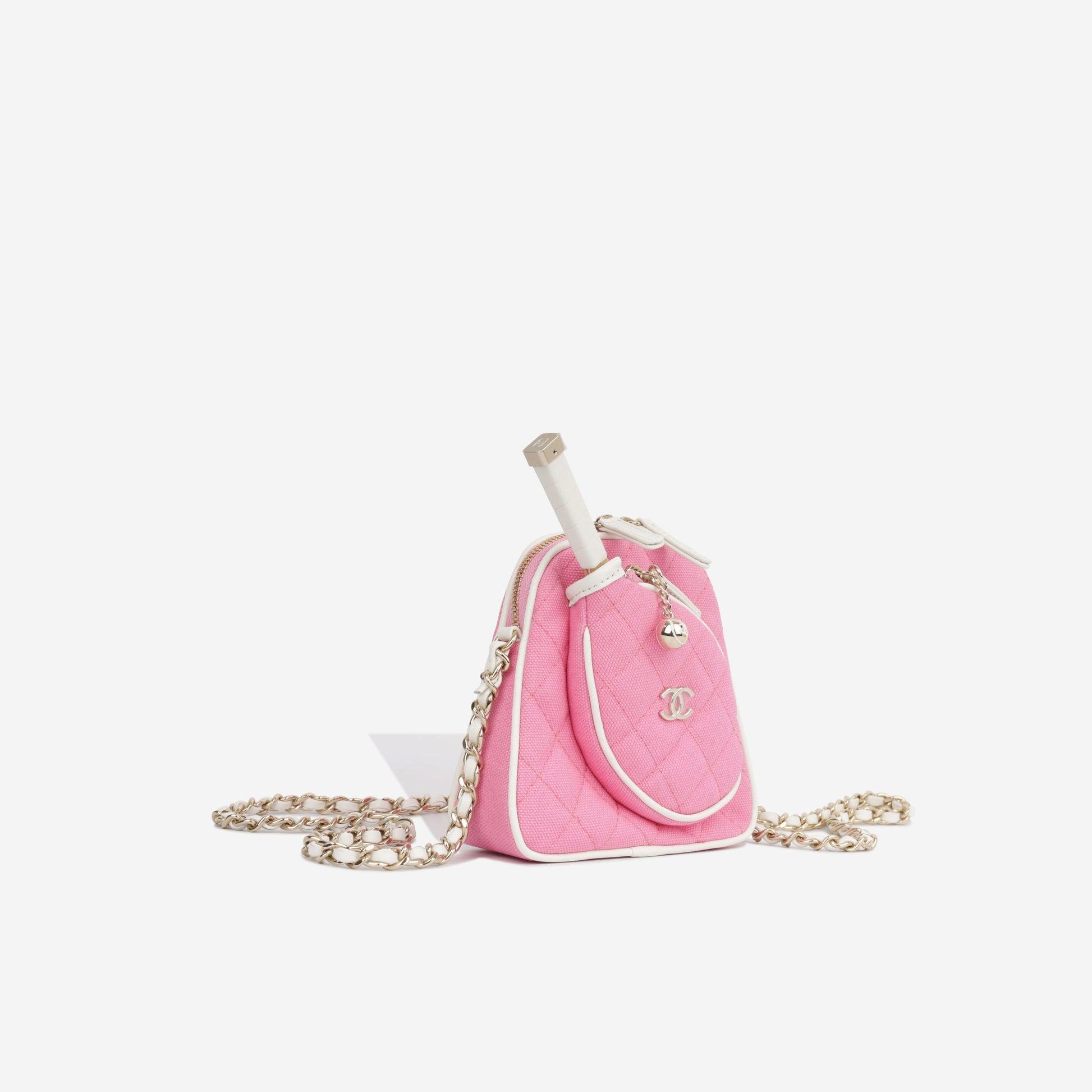 This adorable piece from Chanel's 2023 Cruise collection and showcased in Monte Carlo. The Racquet bag comes in a range of sizes for different purposes and features a pink canvas exterior and a delicate tennis racket shaped mirror. This bag is perfect for the collector. Functional to hold a few smaller items such as keys and airpods, this bag is perfect for giving that sporty summer feeling.