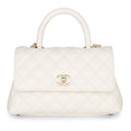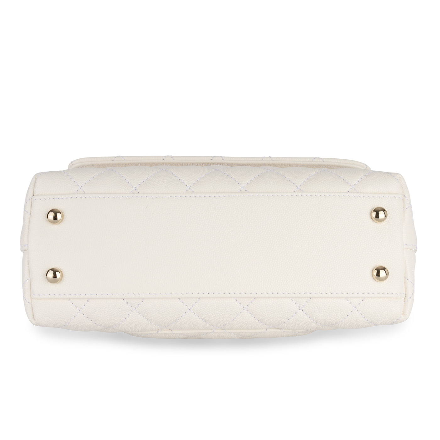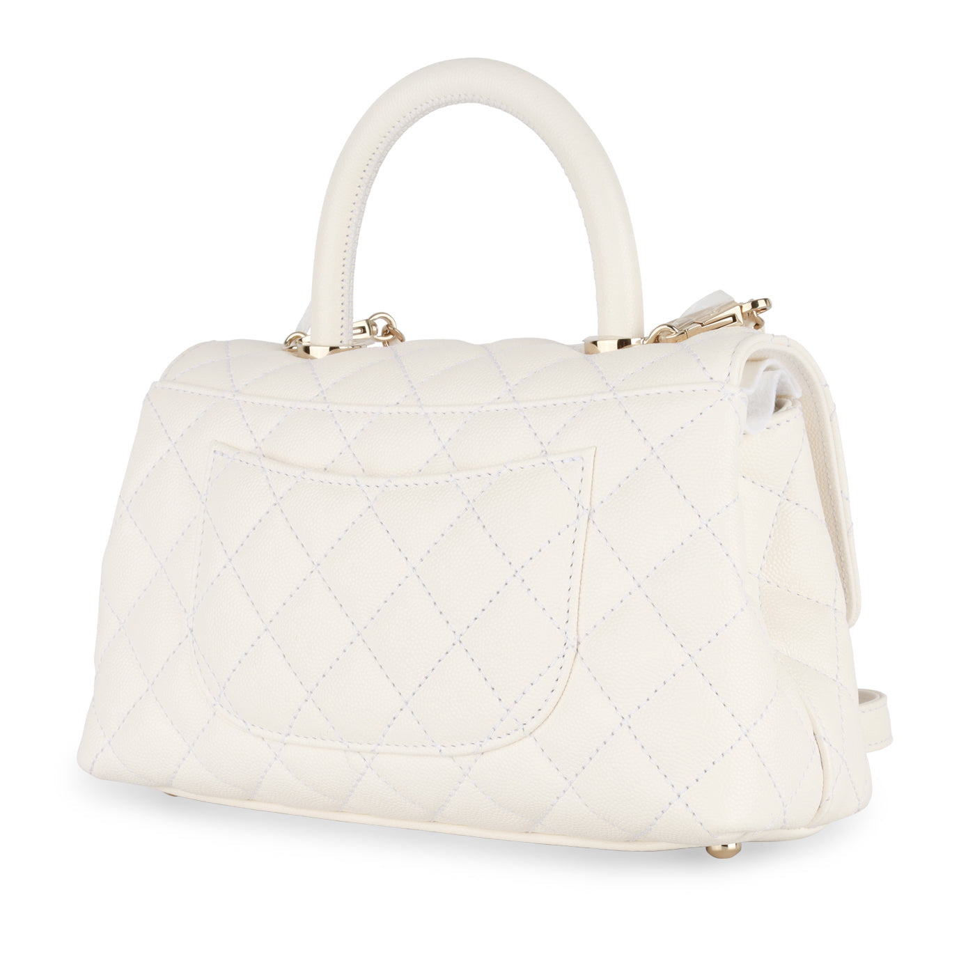 Crafted from quilted white caviar leather and romantic champagne gold hardware, Chanel presents the Small Coco Handle bag. The Coco is the perfect balance between timeless elegance with modern edginess. No matter the occasion, the Coco Top Handle can easily hold all your bare essentials from day to night while keeping you sleek and stylish.