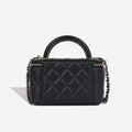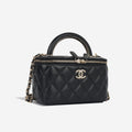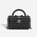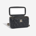 Primarily developed for storing your tiny beauty essentials and other small necessities, the vanity case has come a rather long way since its birth. With the “mini bag” remaining at the forefront of fashion accessory trends, this petite piece is the farthest thing from just a functional case. This vanity case is crafted in black lambskin leather and complimented with champagne gold toned hardware.
