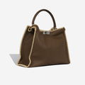 Fendi presents its iconic Peekaboo bag, yet this one is particularly unique with its delicate raffia edge detail. This bag is the perfect option for a person that likes a statement piece and has a lot to carry. In contrast to the original peekaboo, the lite version has one compartment and only one signature twist clasp. This Peekaboo is still playful, energetic and practical.