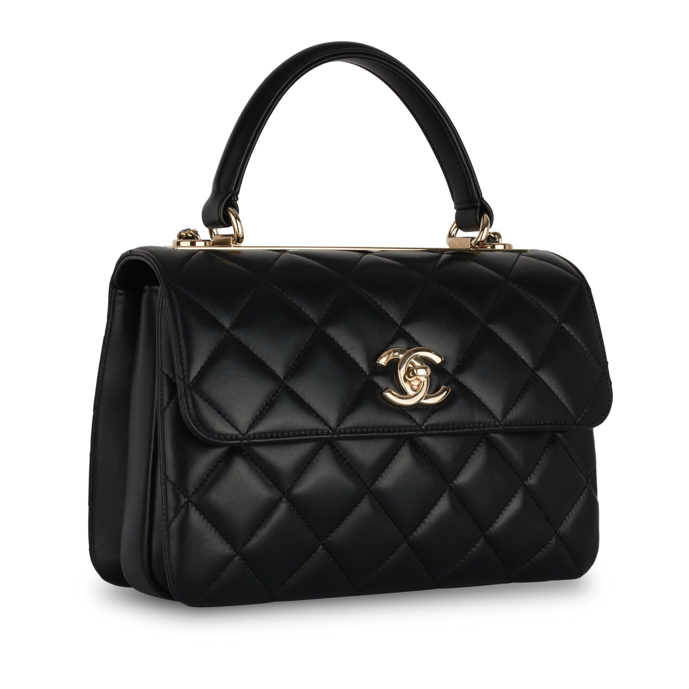 Oozing allure and sophistication, Chanel presents one of its most ravishing, highly acclaimed handbags, the Chanel Trendy CC Flap in Small. Crafted from black lambskin and punctuated with the fashion house’s coveted quilted design, the handbag features a sharp silhouette.