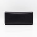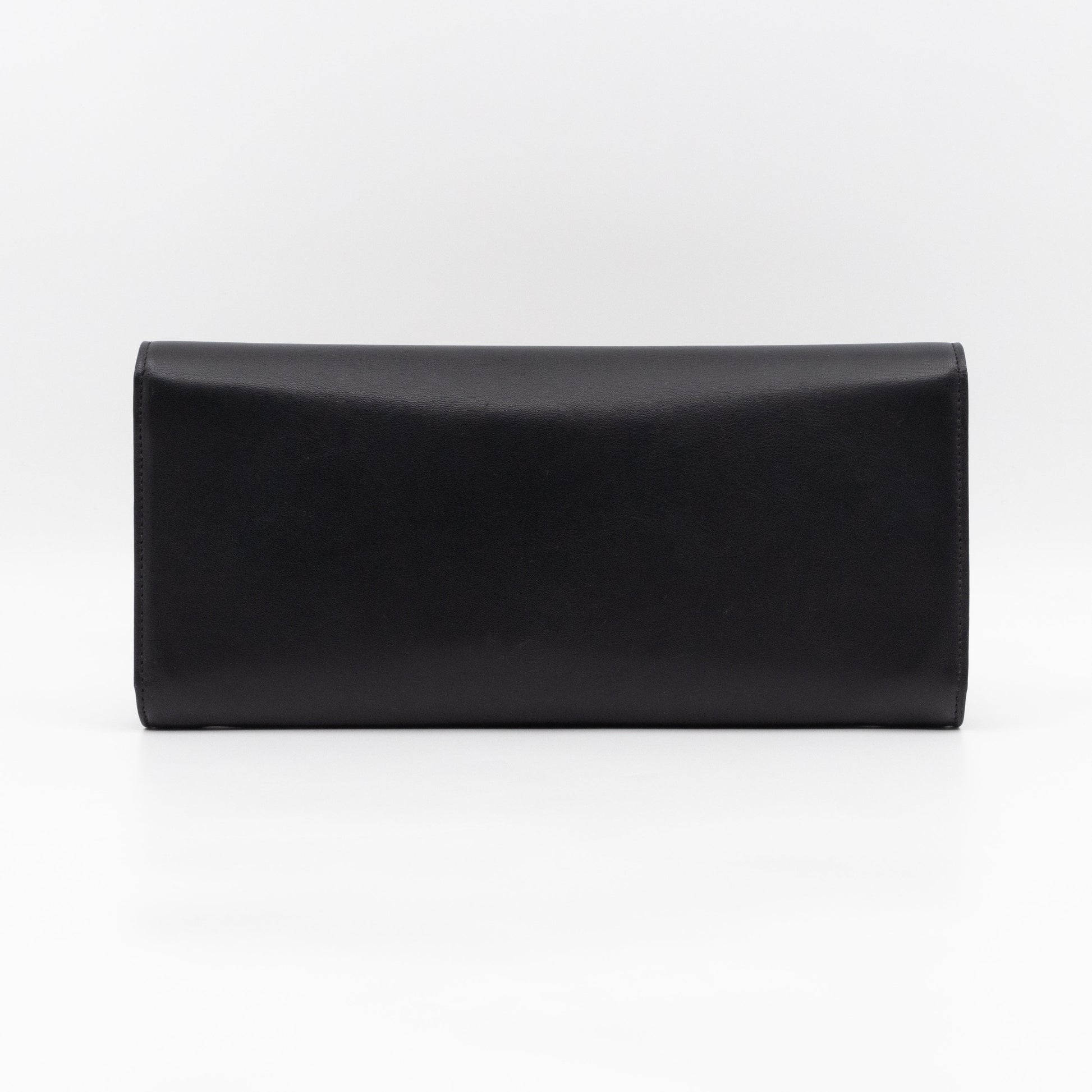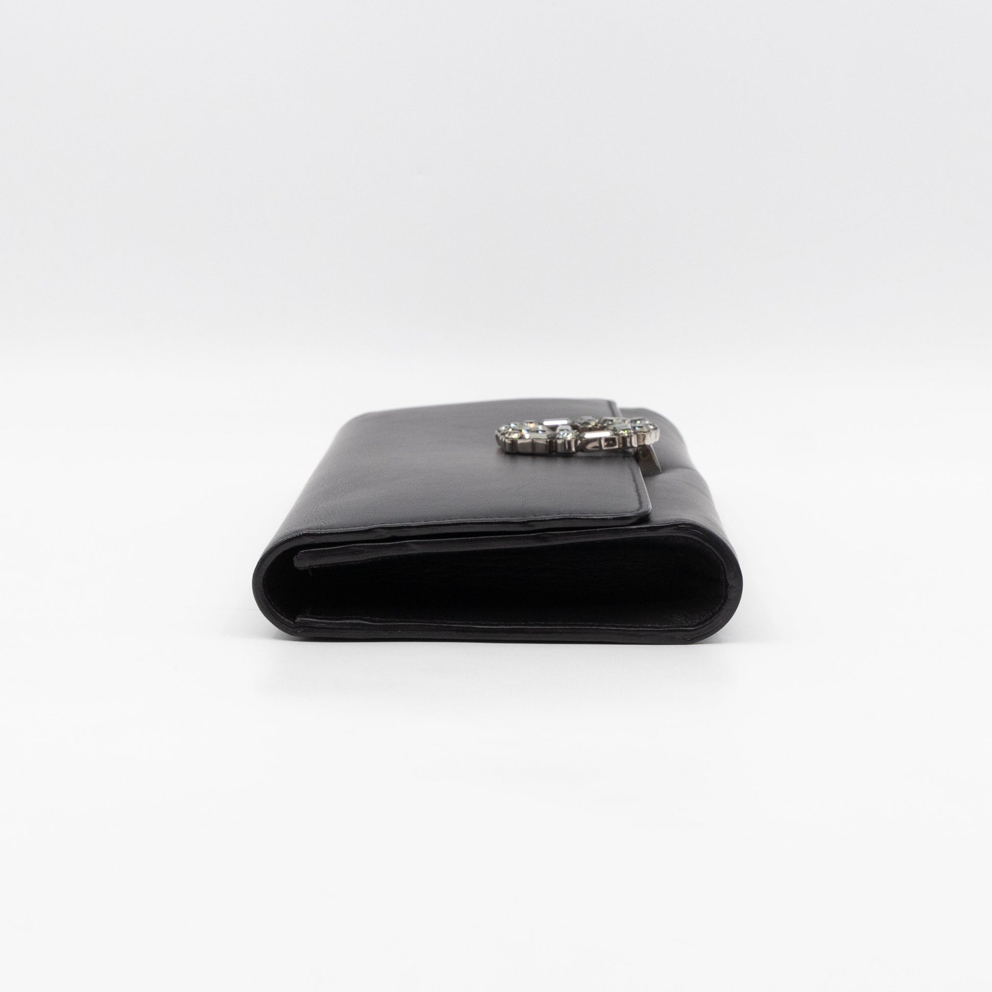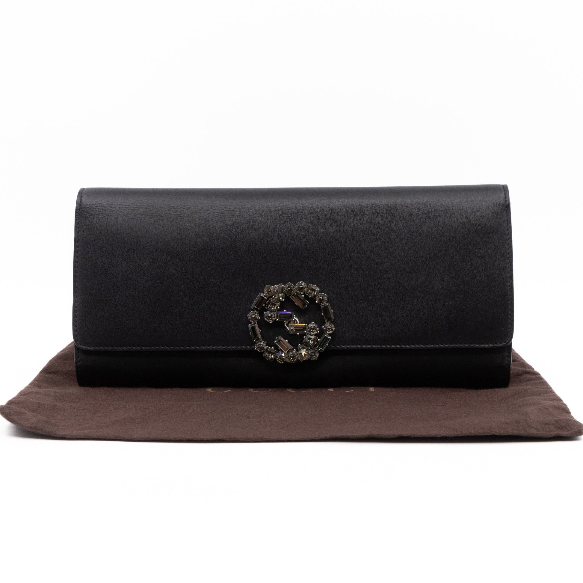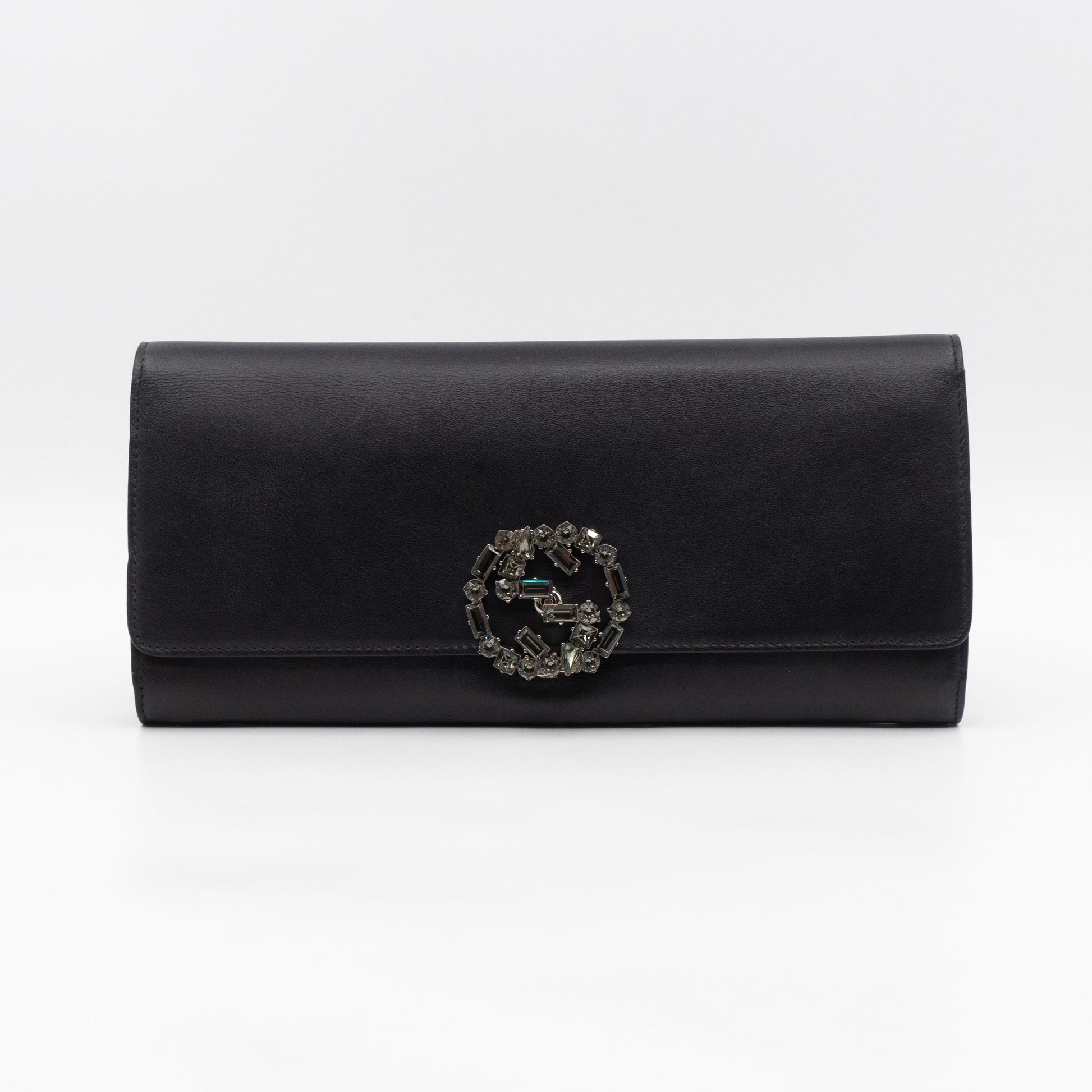 This is the Gucci Broadway Clutch with a special interlocking G crystal closure. Made in classic smooth black leather, brown leather inside lining. This long clutch easily fits you wallet, phone and other important items.