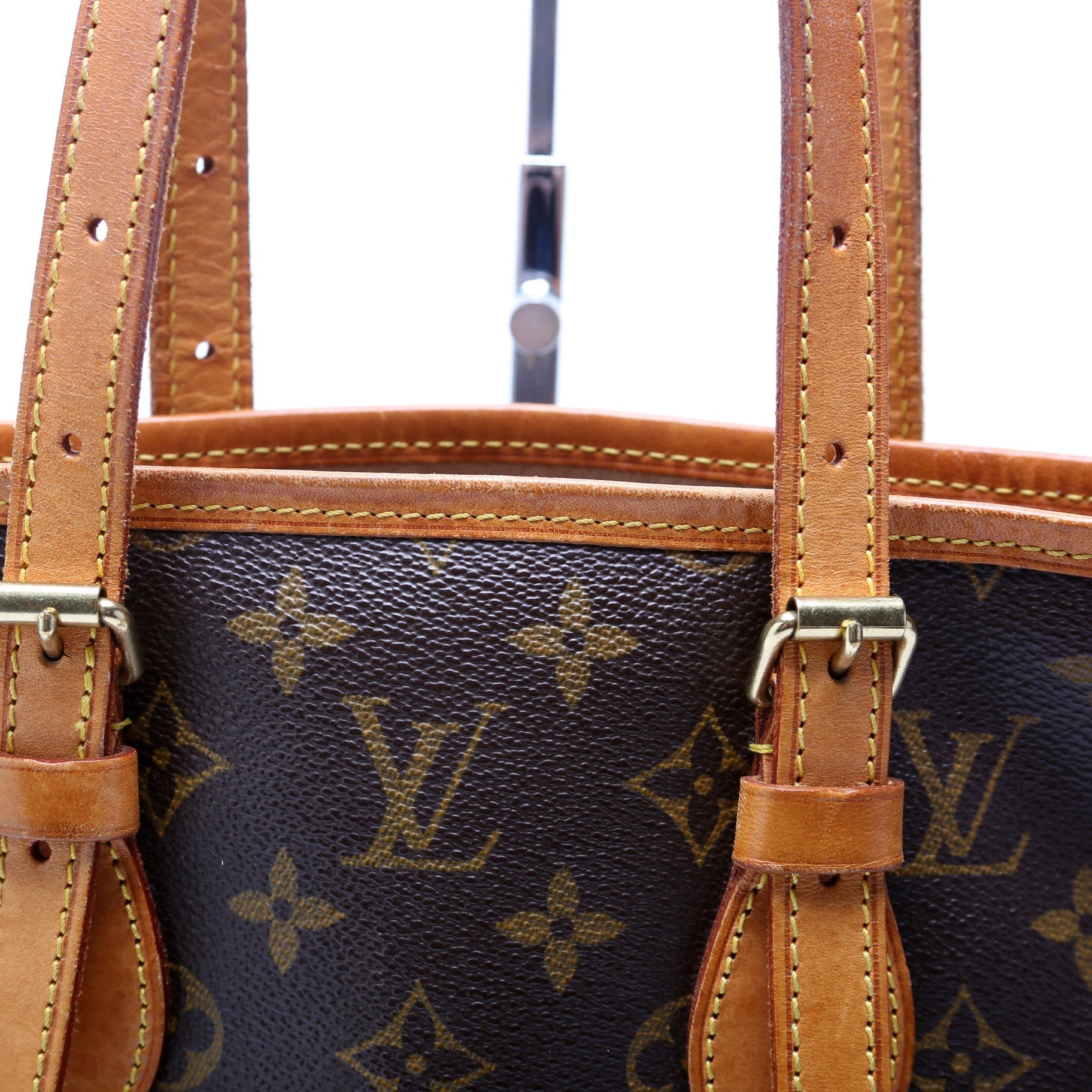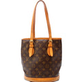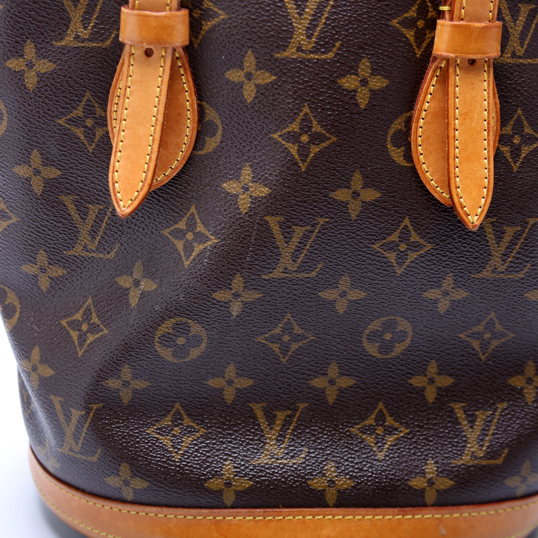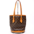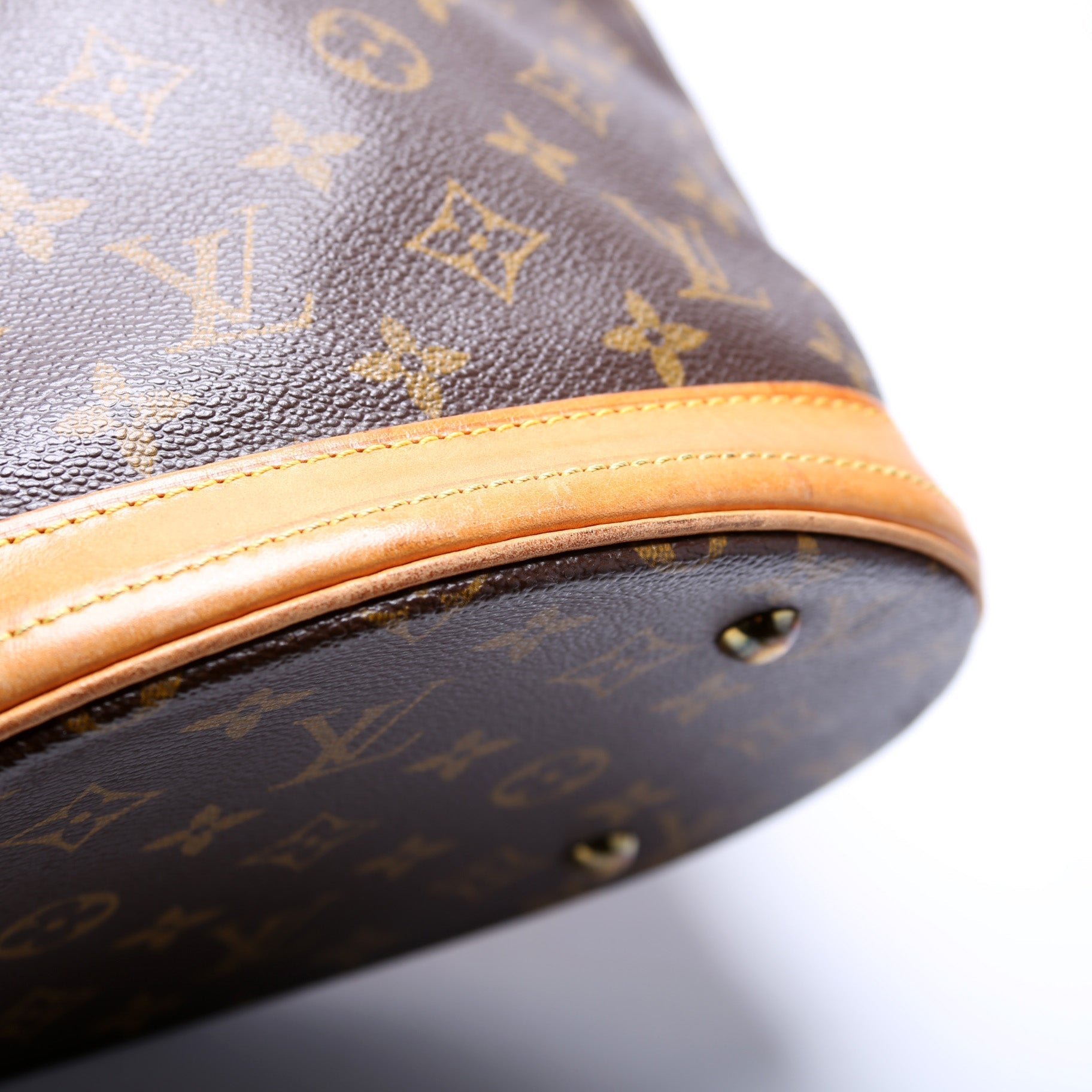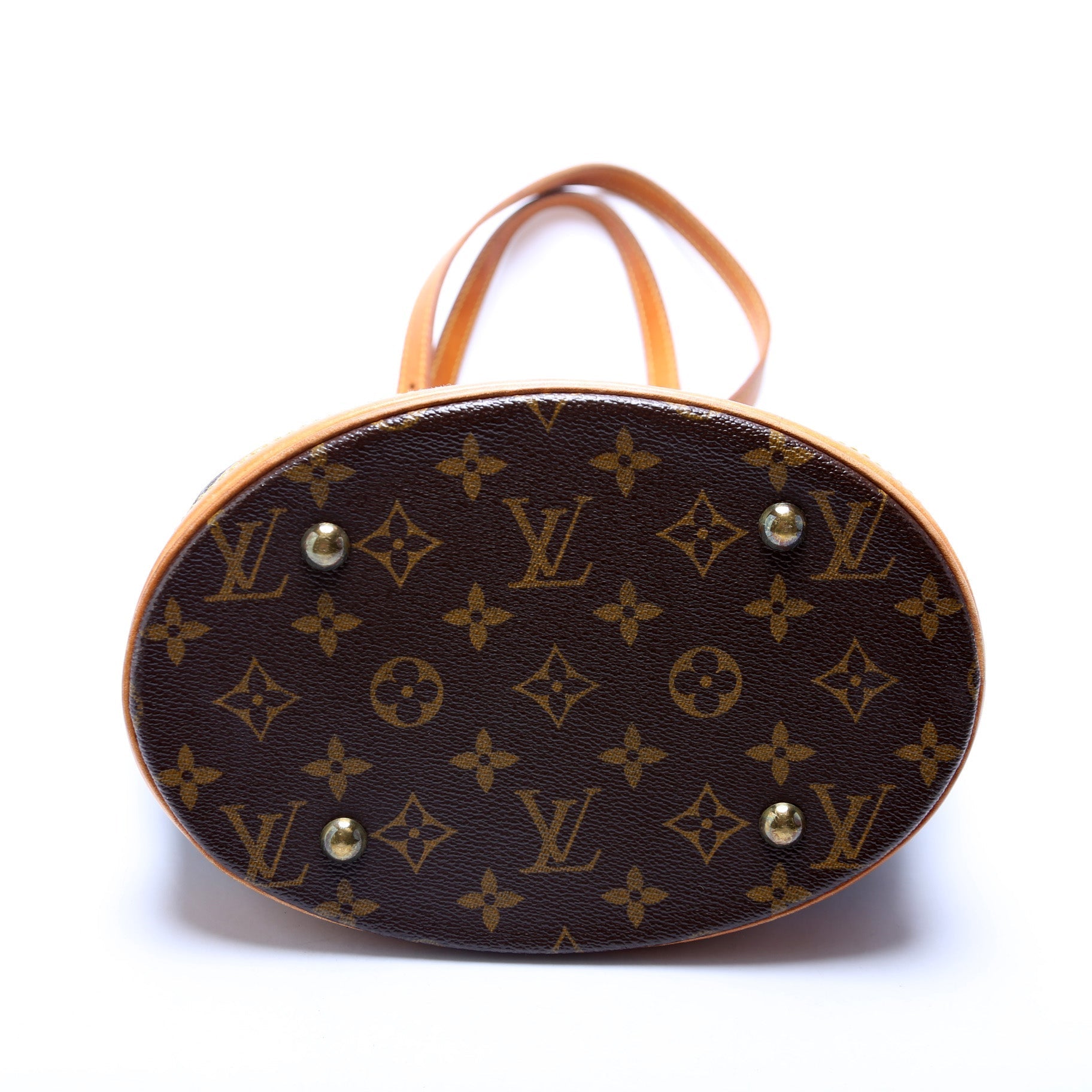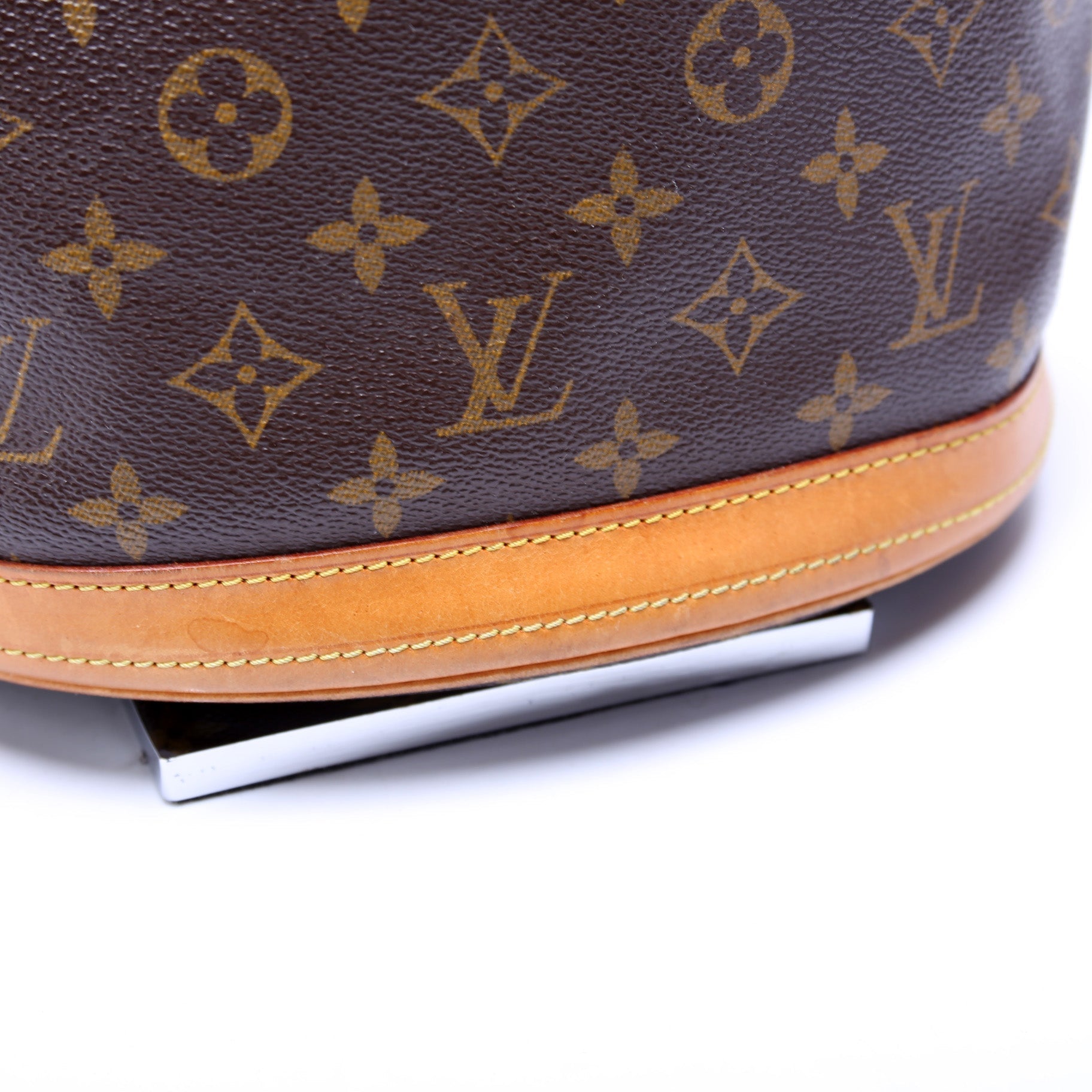 This Louis Vuitton Bucket PMis eye catching bag. The exterior is in the classic Louis Vuitton Monogram coated canvas.