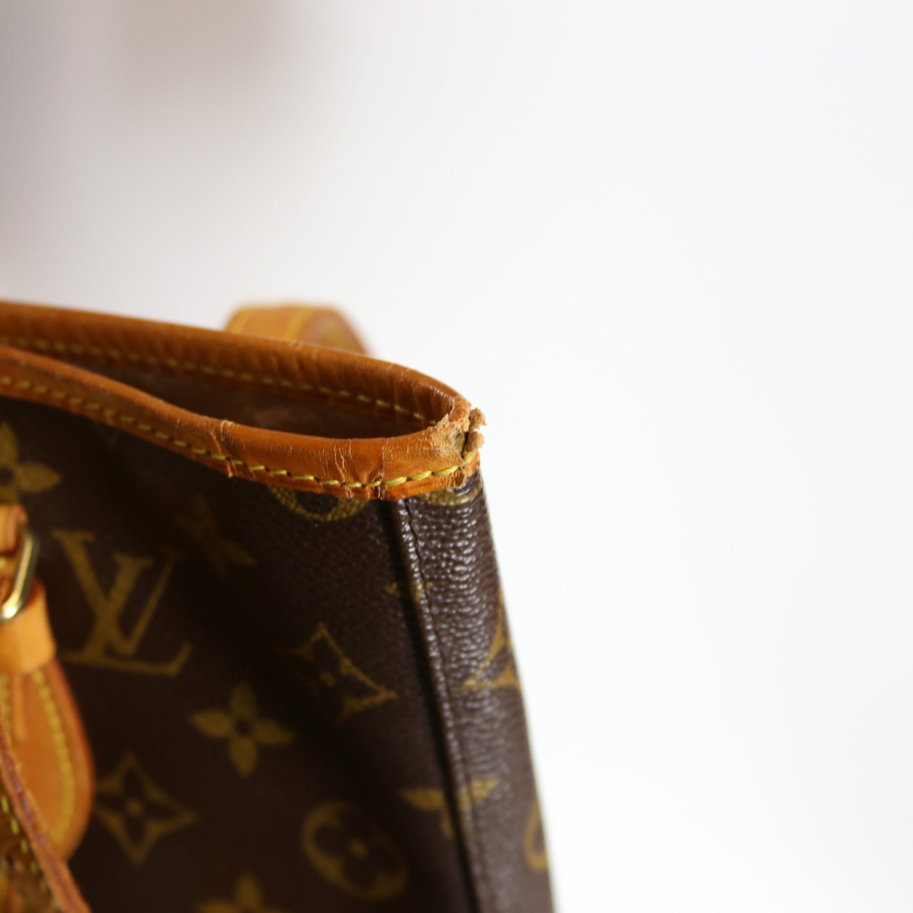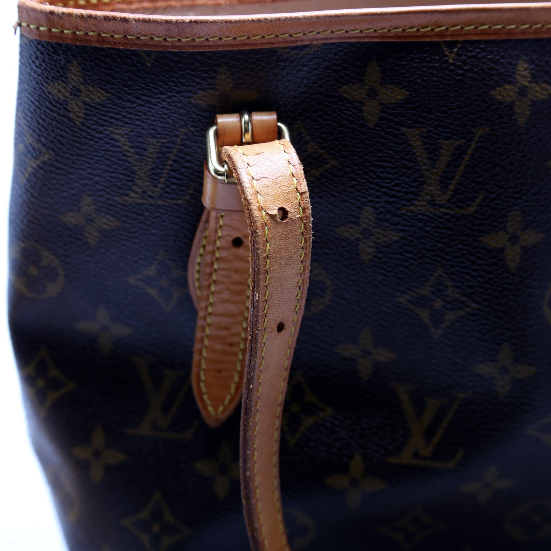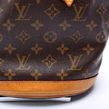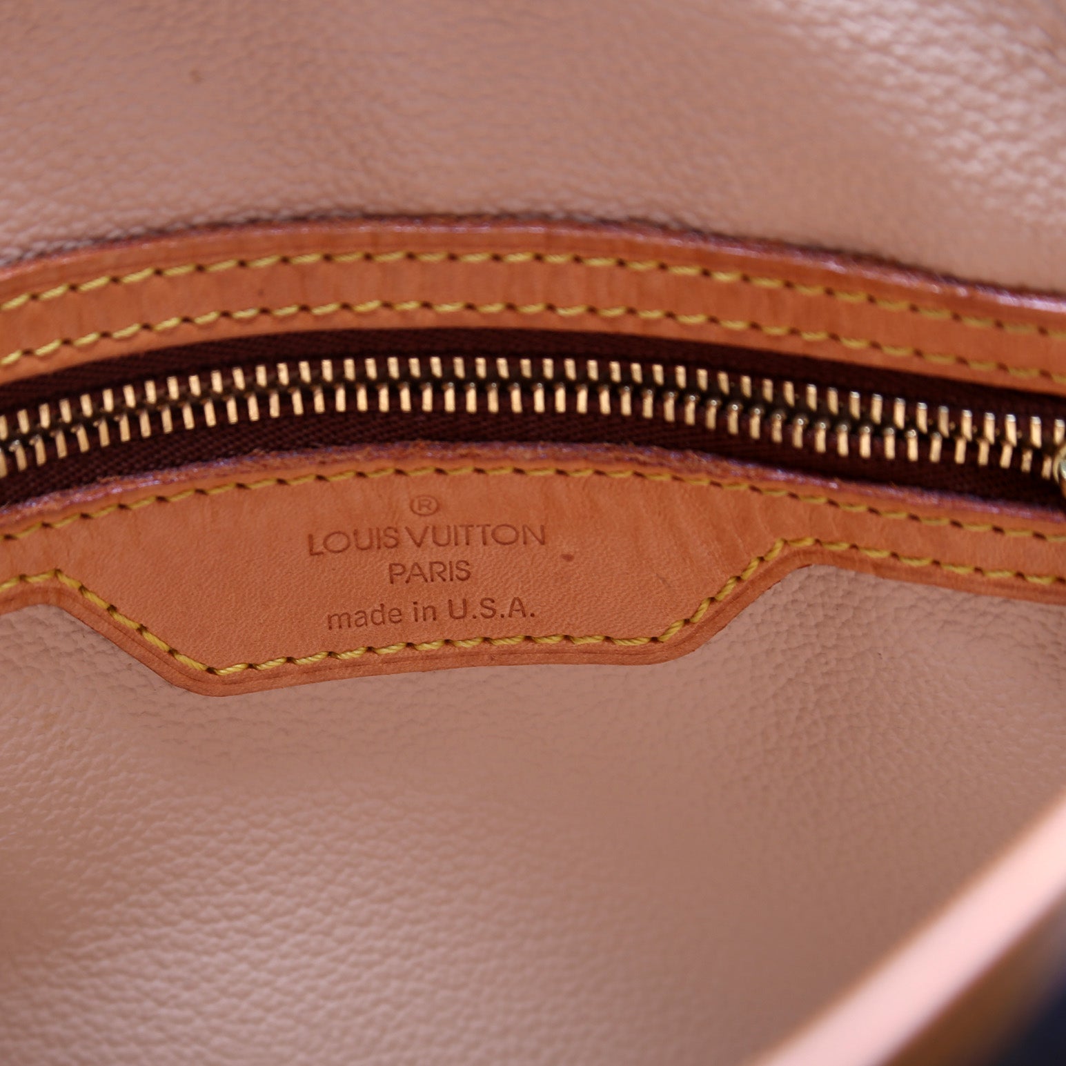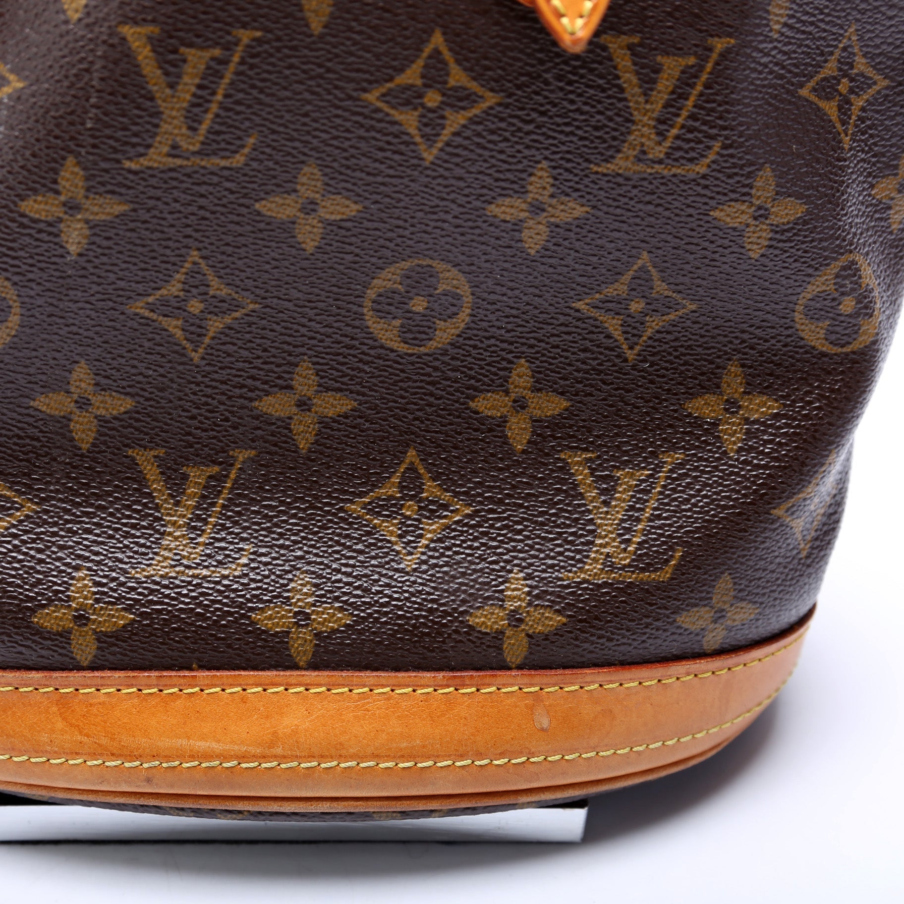 Exterior: The exterior Monogram coated canvas has minor scuffs. The leather trim shows wear and discoloration.