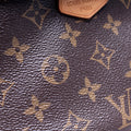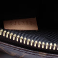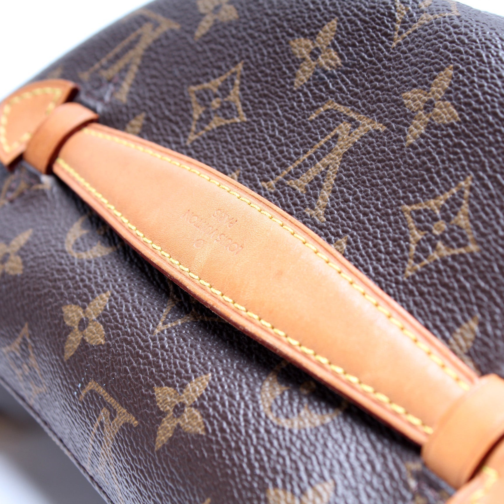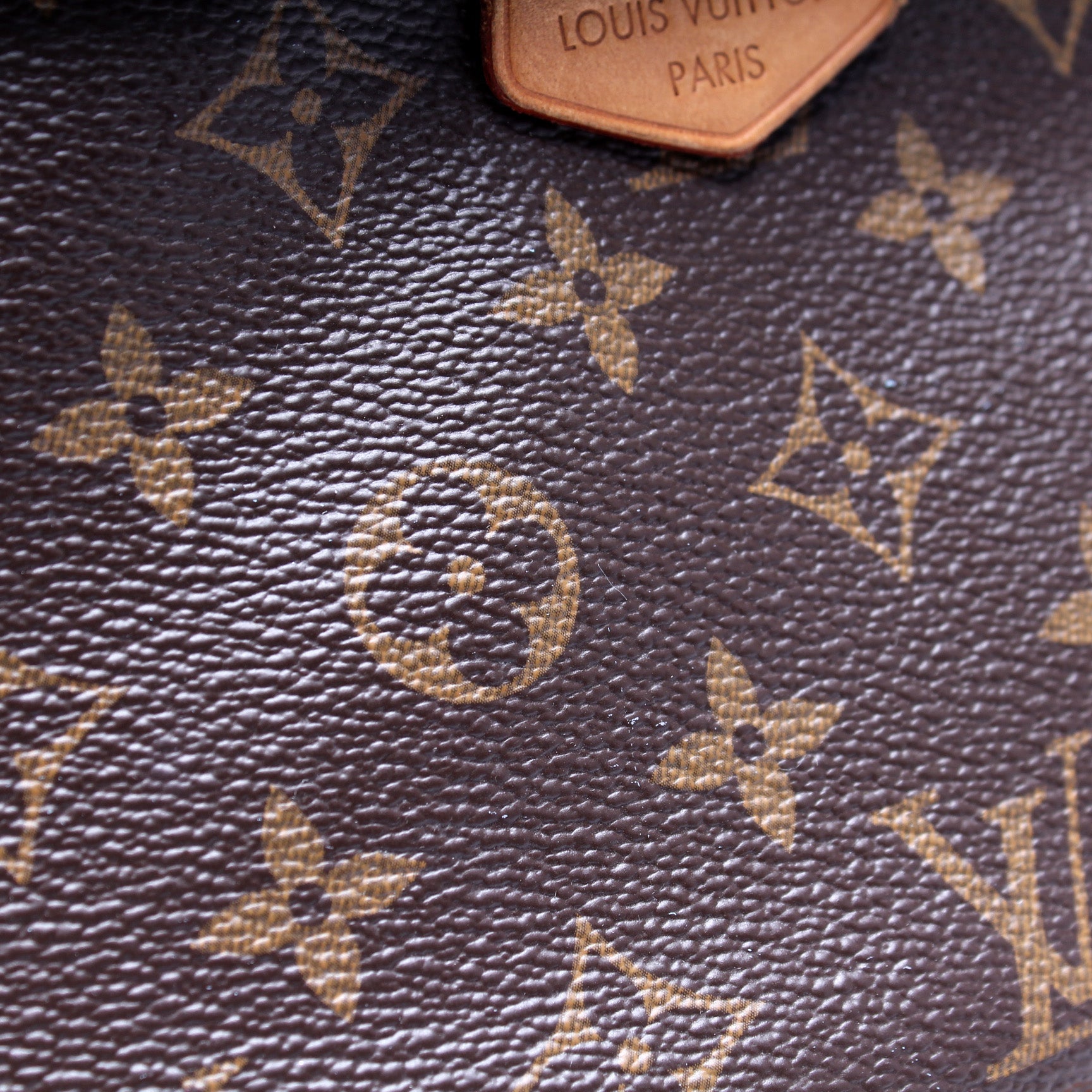 Exterior: The exterior coated canvas is free of any rips or cracks, there are light marks throughout. The leather tabs show minor wear and discoloration. The exterior features one zip closure back pocket.