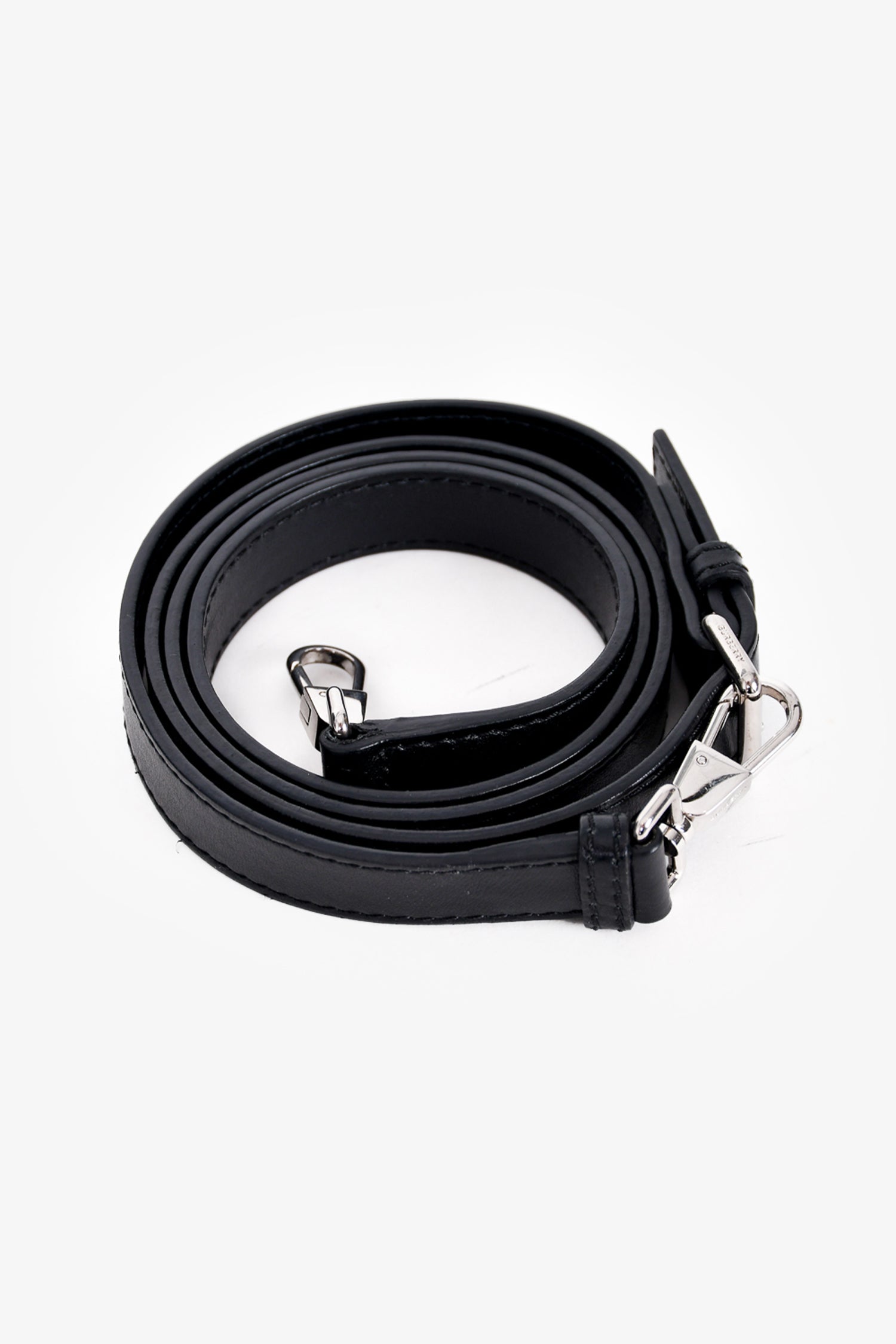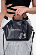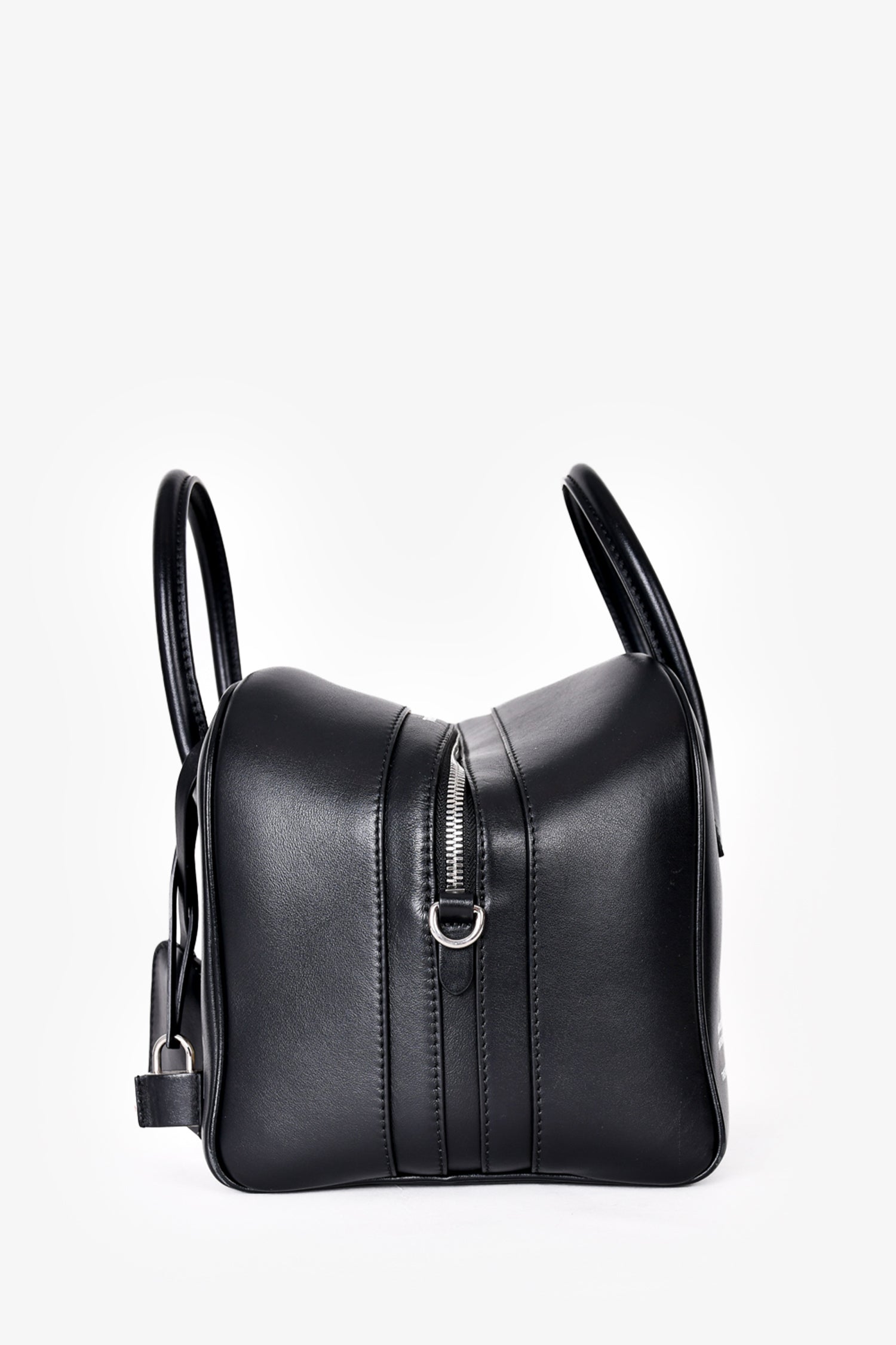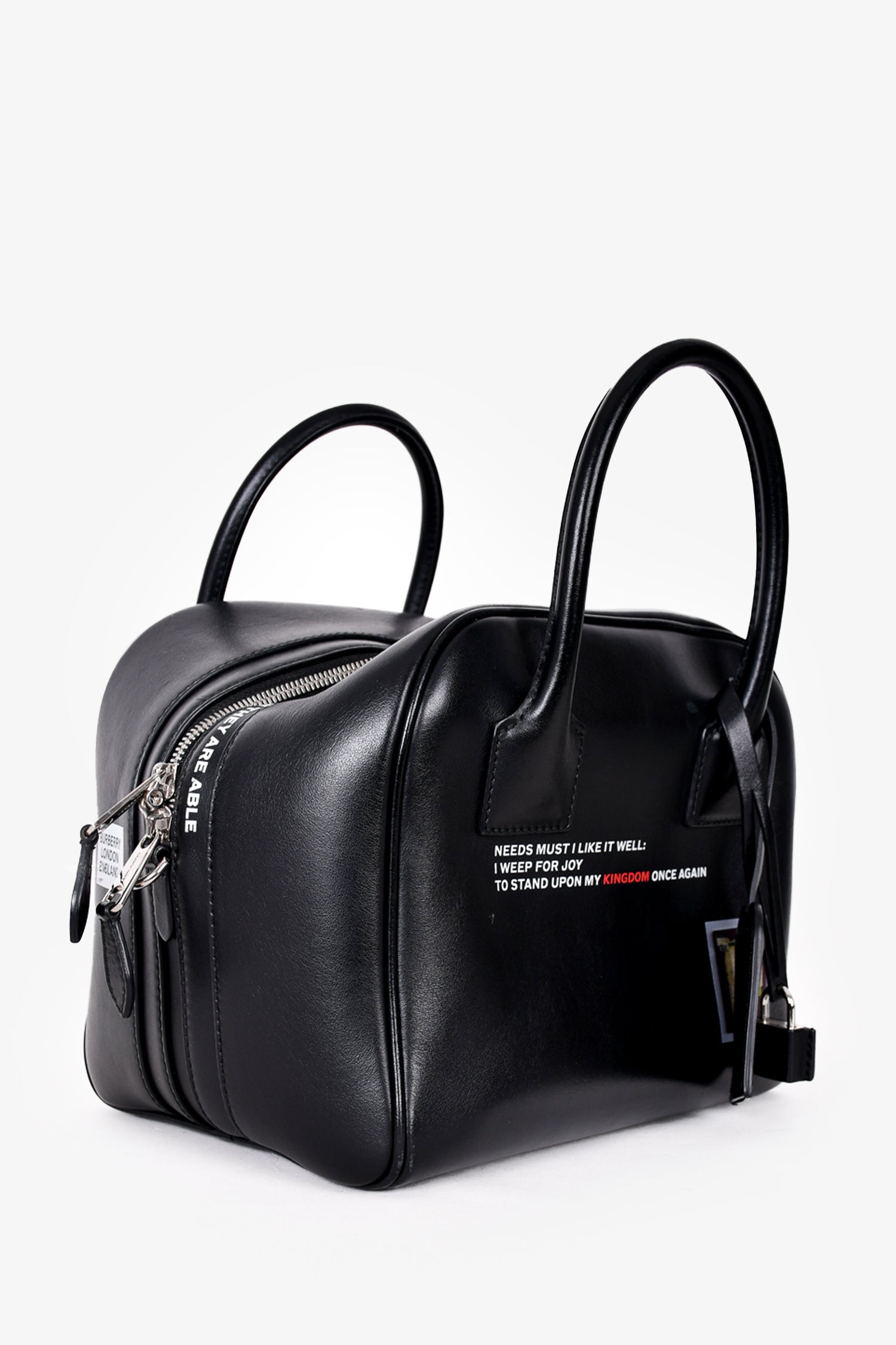 Burberry Black Leather Graphic Bowler Bag With Strap. Silver-tone hardware. Top handle. Top zipper closure. Small lock and key detailing. Small interior pocket. Small decorative writing. Tonal stitching.