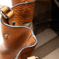 Condition Notes: Visible scuffs and wear to exterior bottom corners. Light creasing and minor scuffs throughout exterior. Light cracking and wear throughout exterior top casing. Light darkening throughout handles. Light surface scratches to hardware. Ink marks throughout interior.