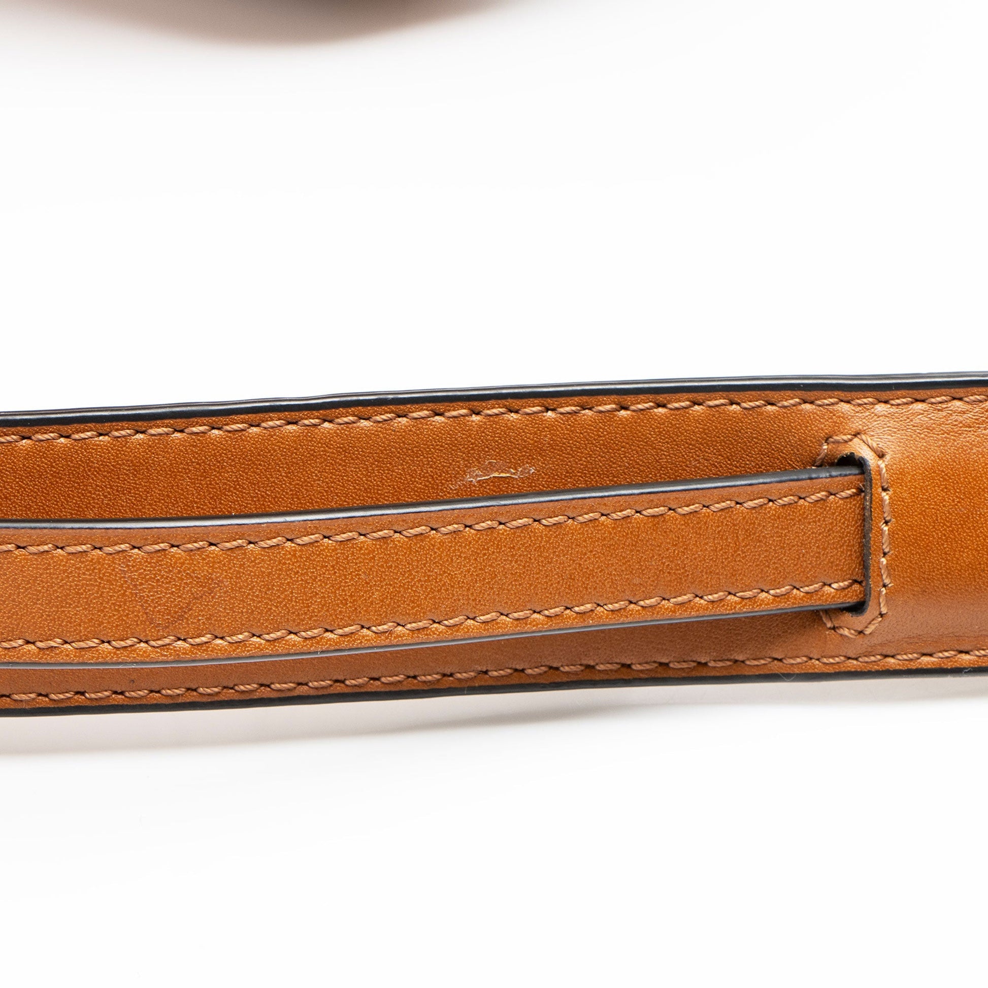 Condition Notes: Light scuffs and wear to exterior bottom corners. Scuffs and light darkening throughout handles. Light marks and scuffs throughout shoulder strap. Light surface scratches to hardware.