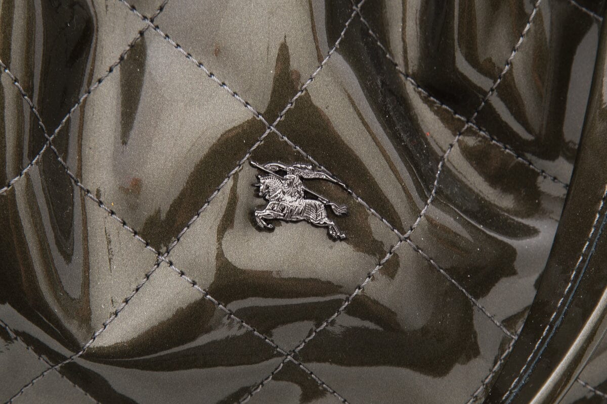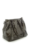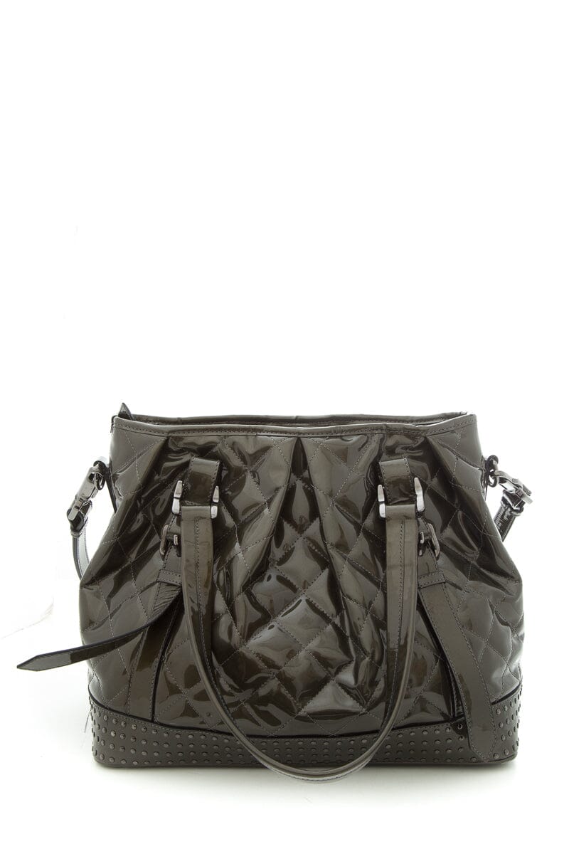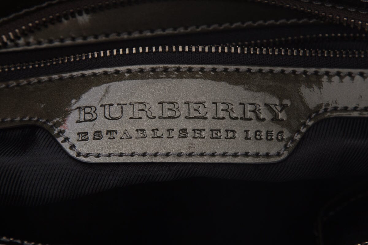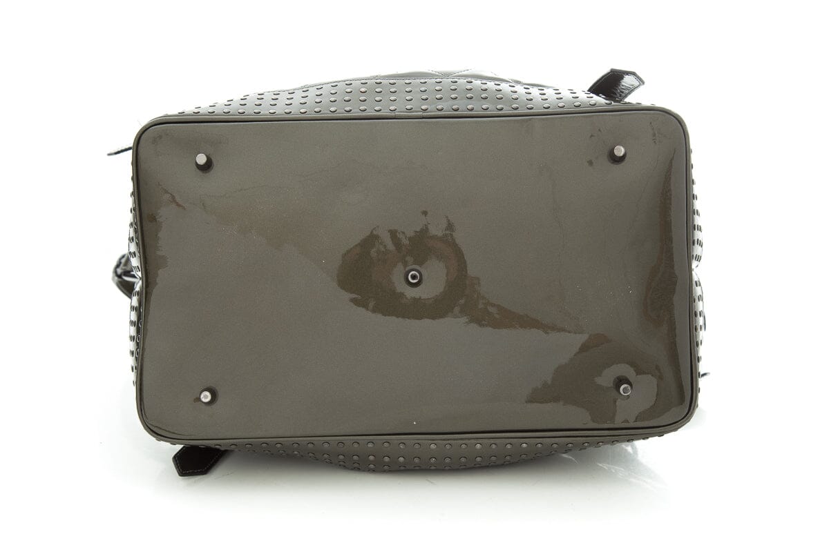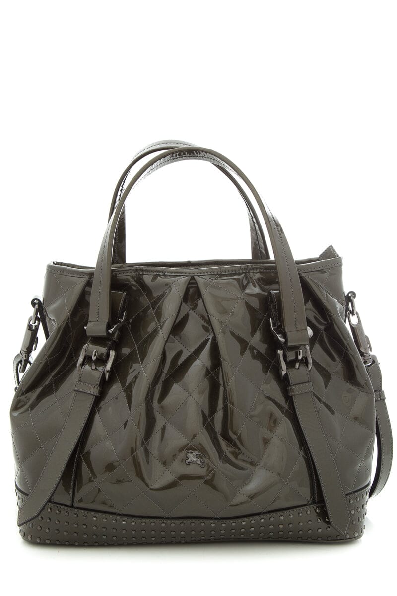 Burberry Green Patent Leather Lowry Studded Tote. This item is in good condition; some slight discoloring on piping.