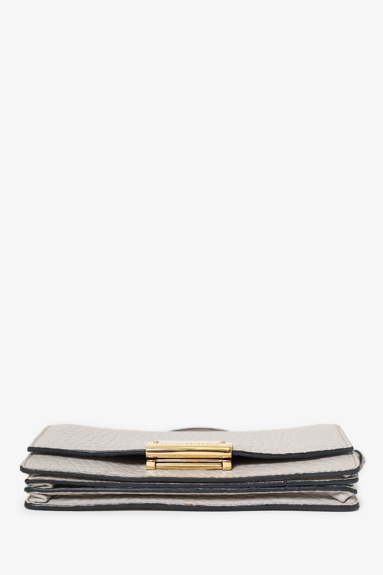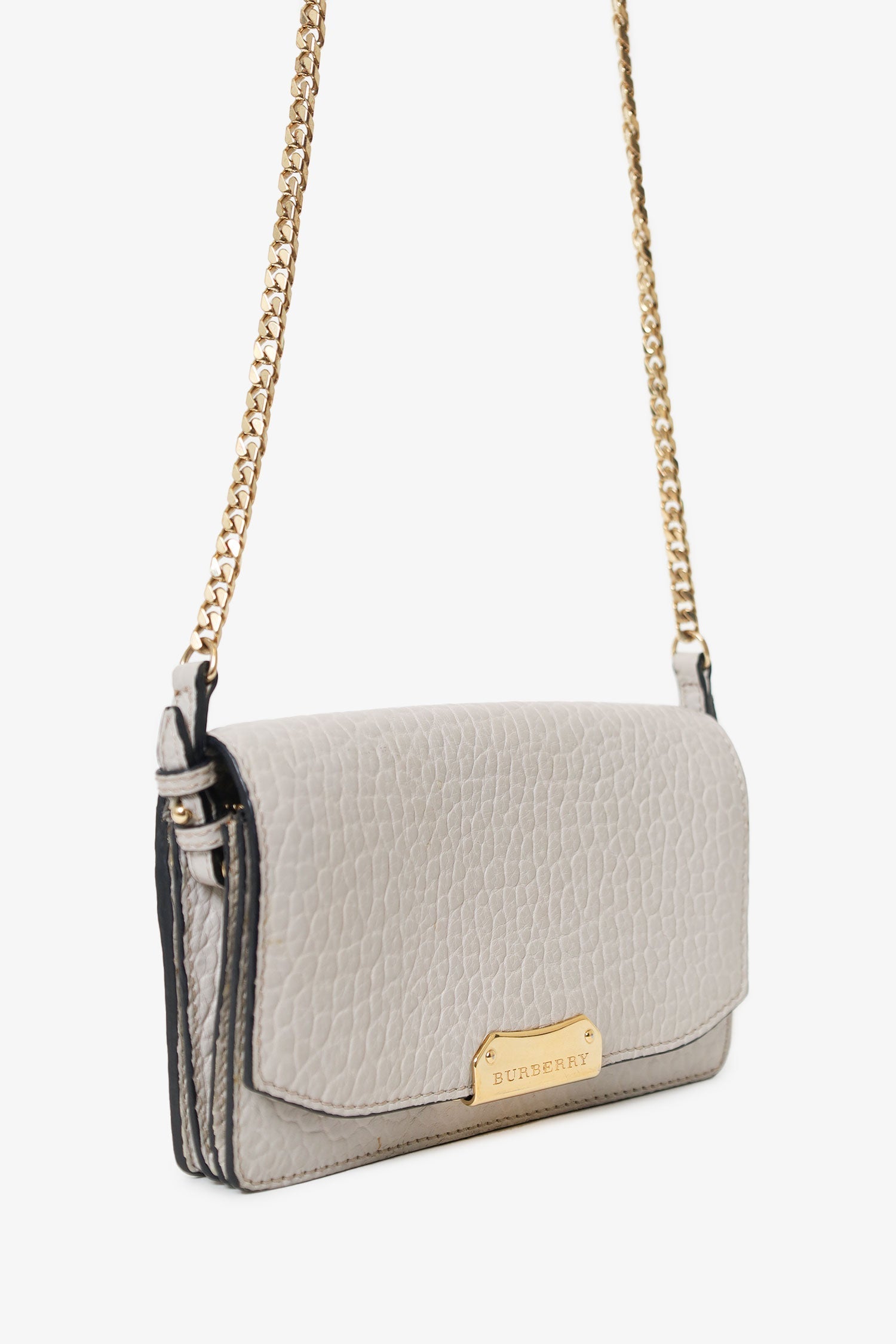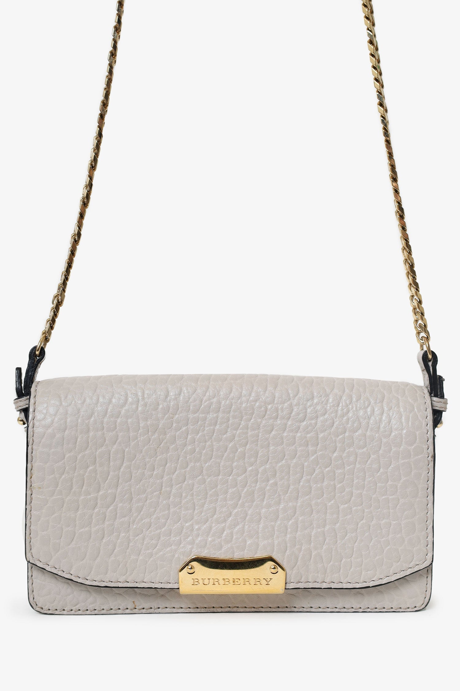 Burberry Grey Grained Calfskin Madison Wallet on Chain. Fold-over flap with push button closure. 2 interior compartments separated by a zip closure pocket. 5 slip pockets in rear compartment. Gold-tone hardware. Tonal stitching.