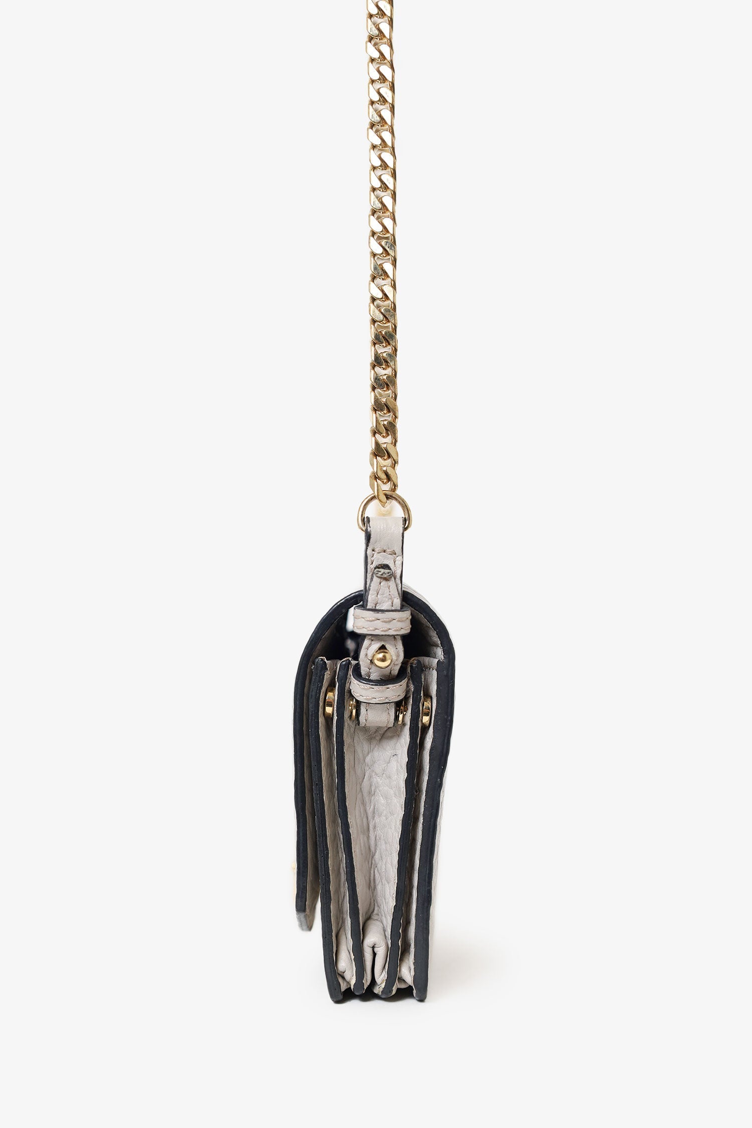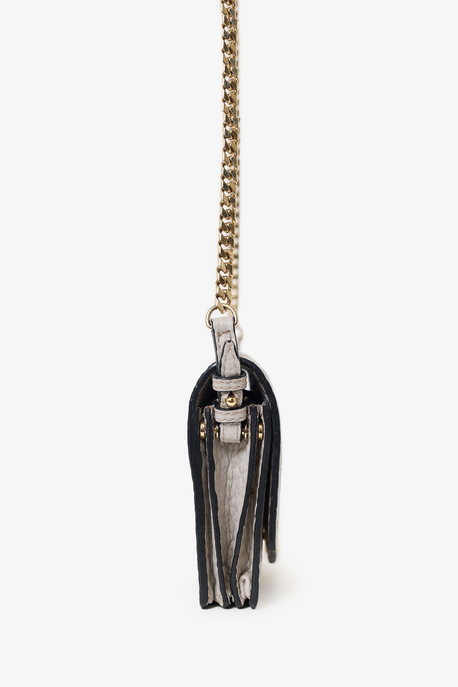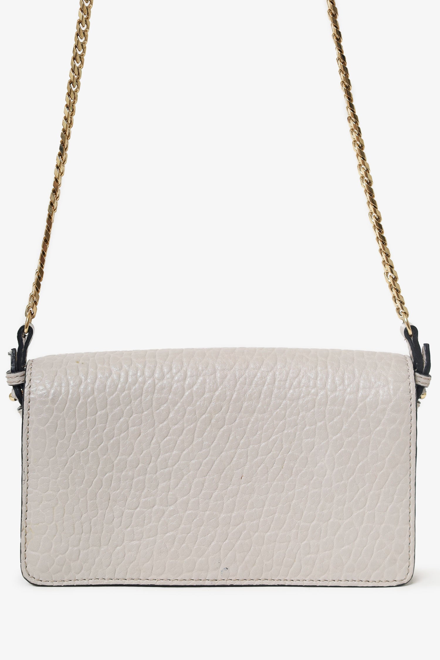 Burberry Grey Grained Calfskin Madison Wallet on Chain. Fold-over flap with push button closure. 2 interior compartments separated by a zip closure pocket. 5 slip pockets in rear compartment. Gold-tone hardware. Tonal stitching.