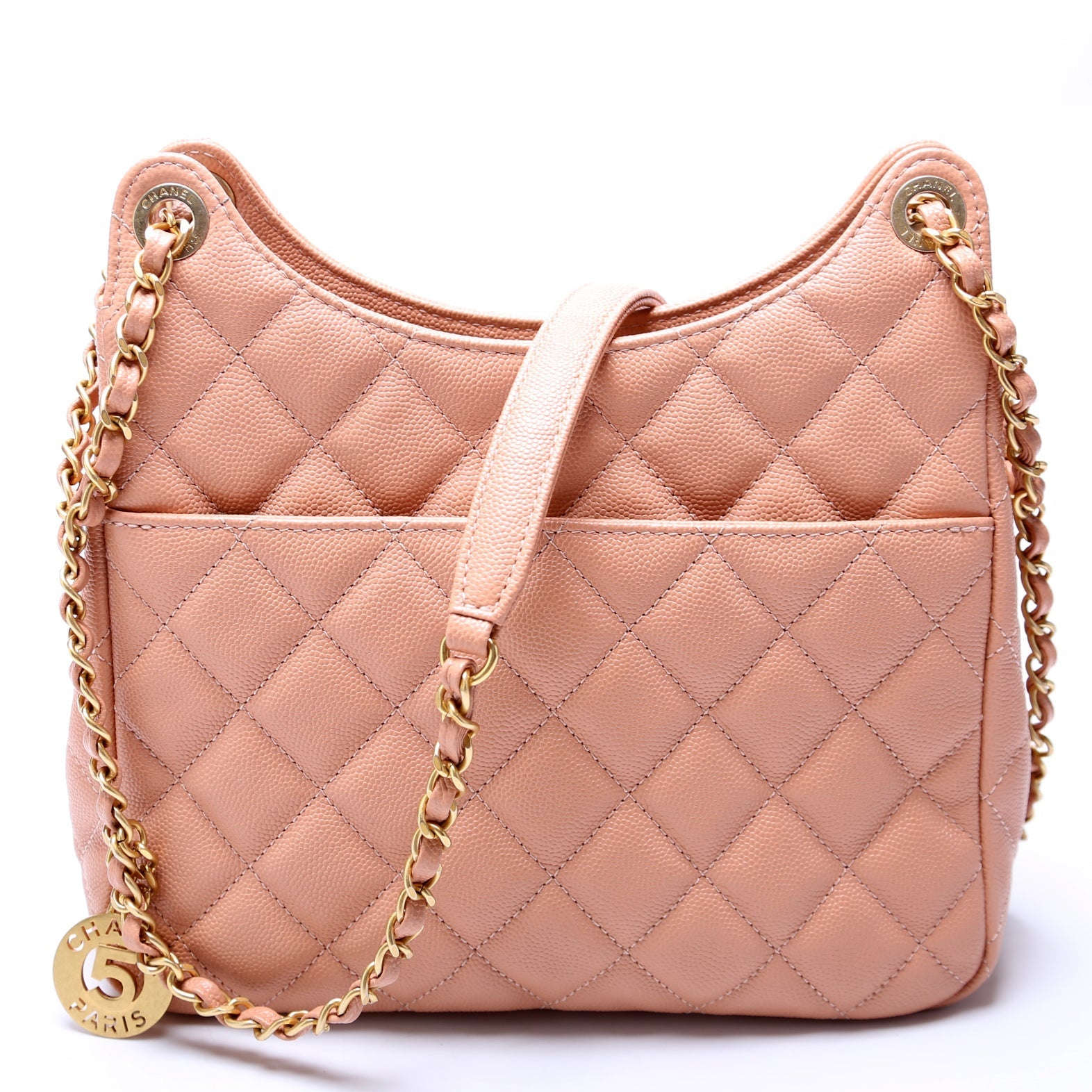 This Chanel C Wavy Hobo Quilted Caviaris eye catching bag. The exterior is in the classic caviar leather.