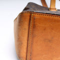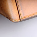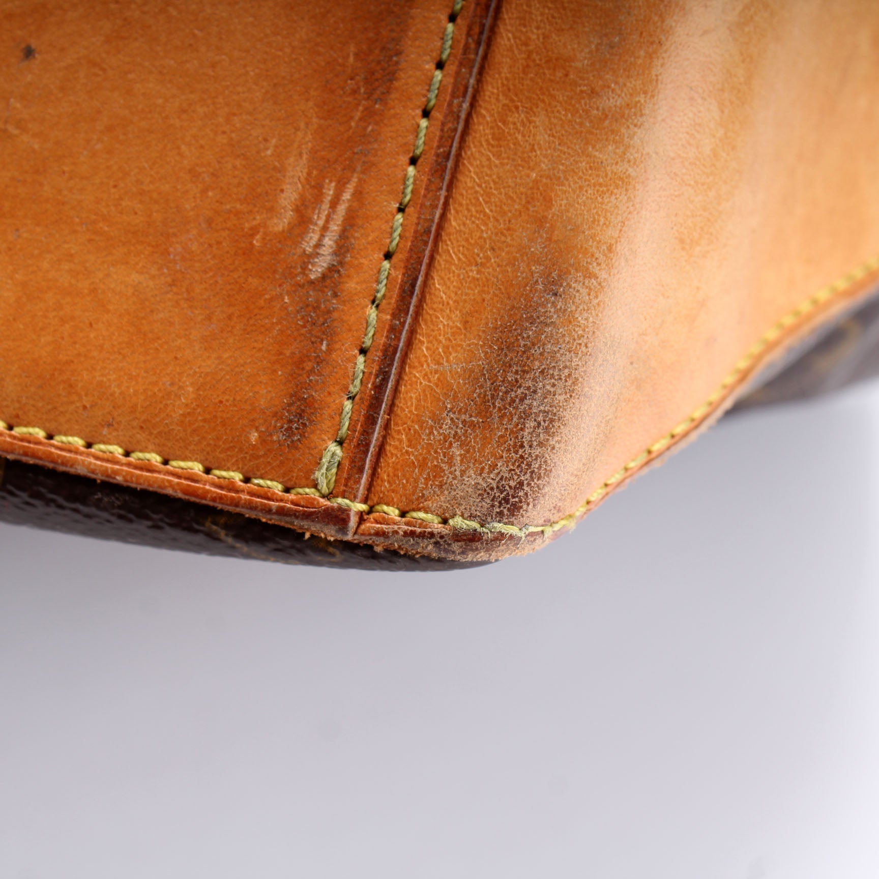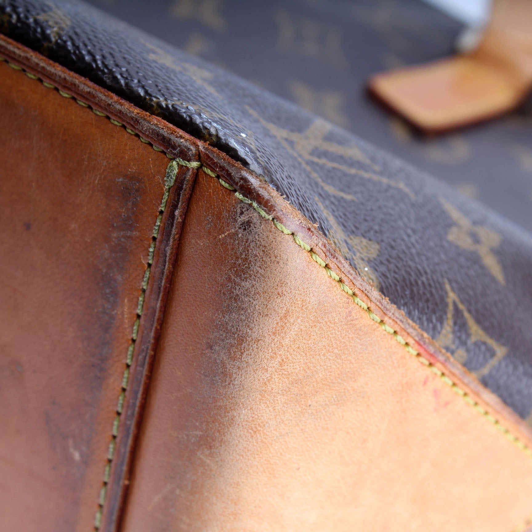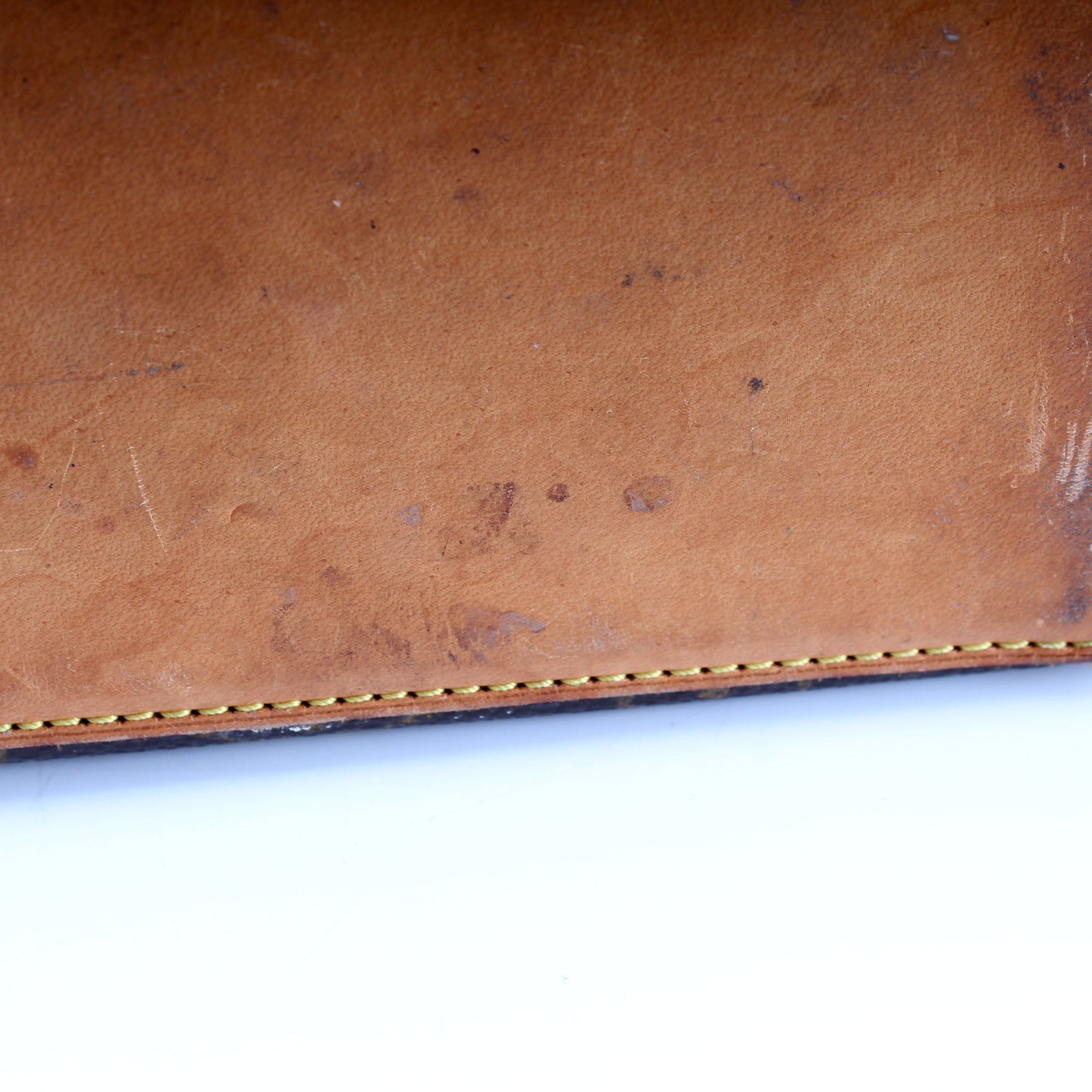 Exterior: The exterior coated canvas is free of any rips or cracks. The corners, leather base, and leather details show wear and discoloration.