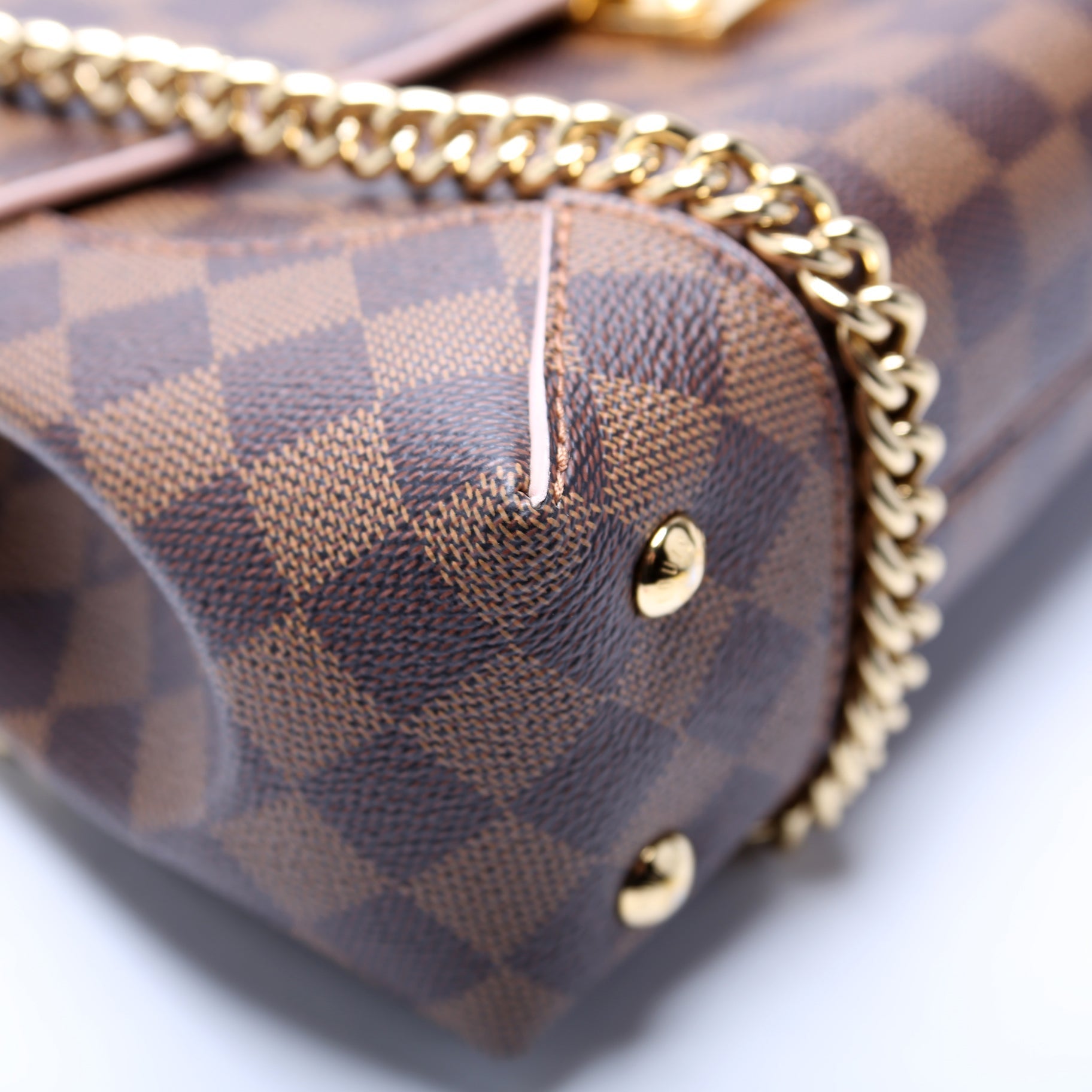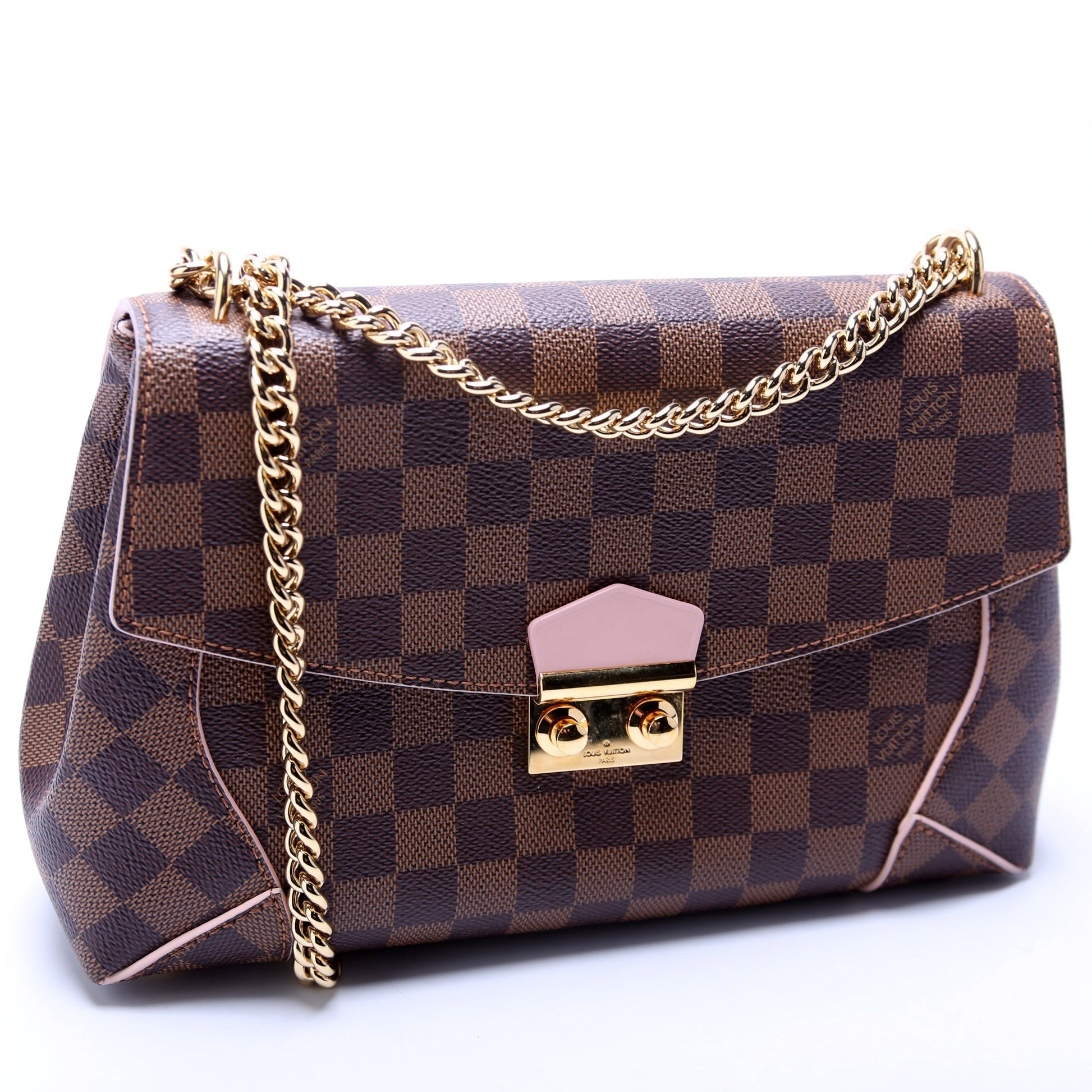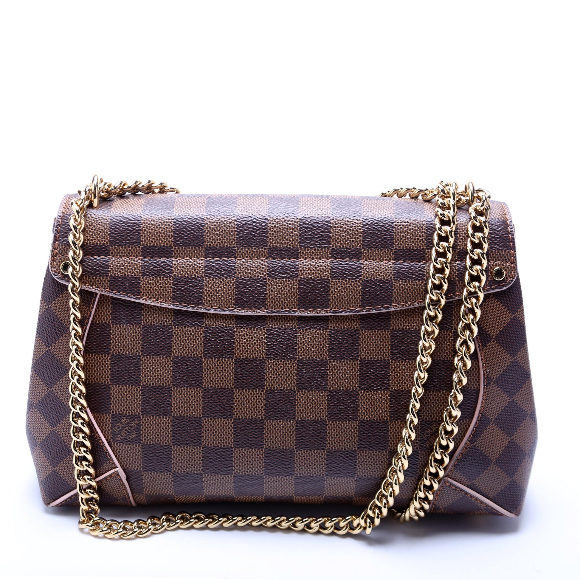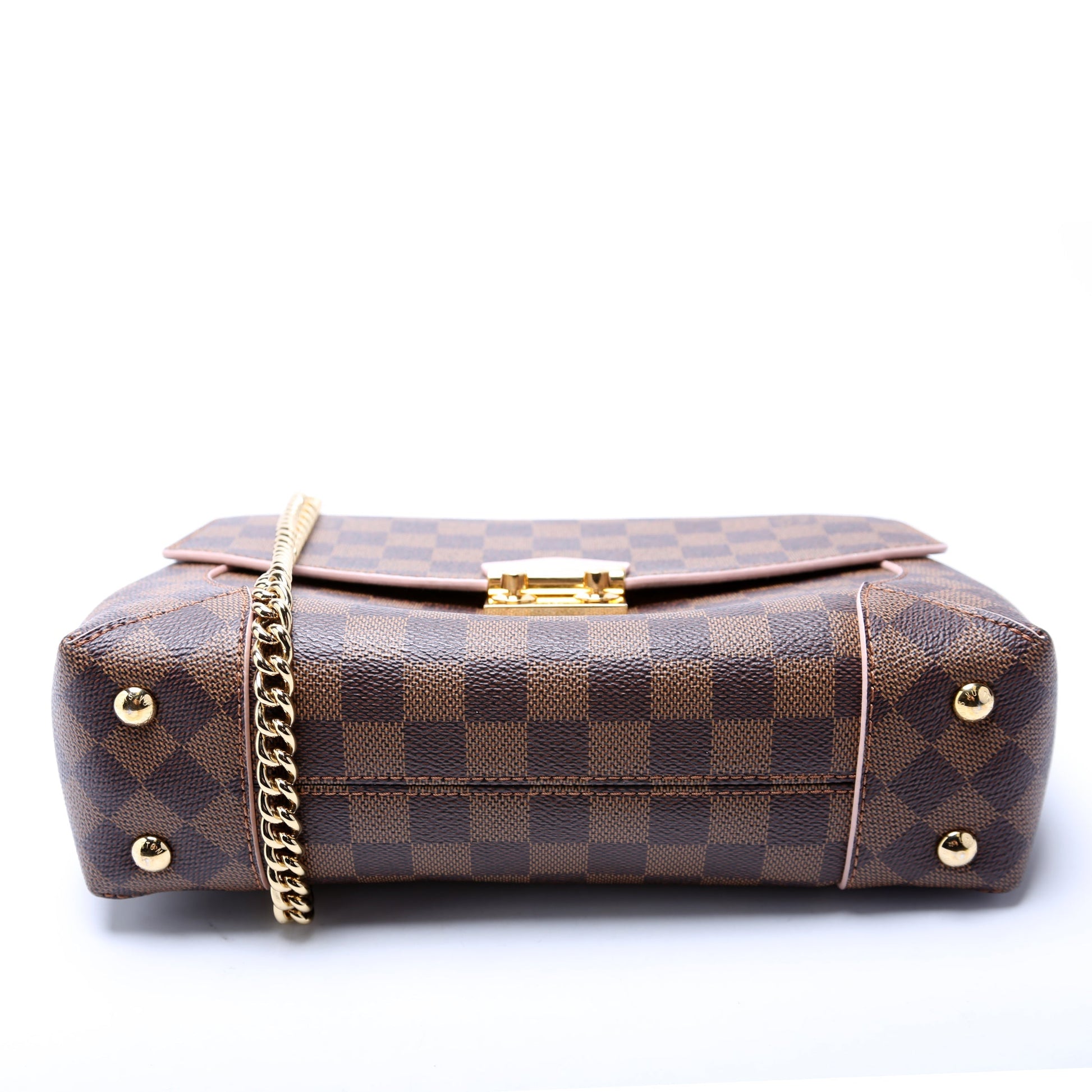 This Louis Vuitton Caissa Chain Clutchis eye catching bag. The exterior is in the classic Louis Vuitton Damier Ebene coated canvas.