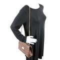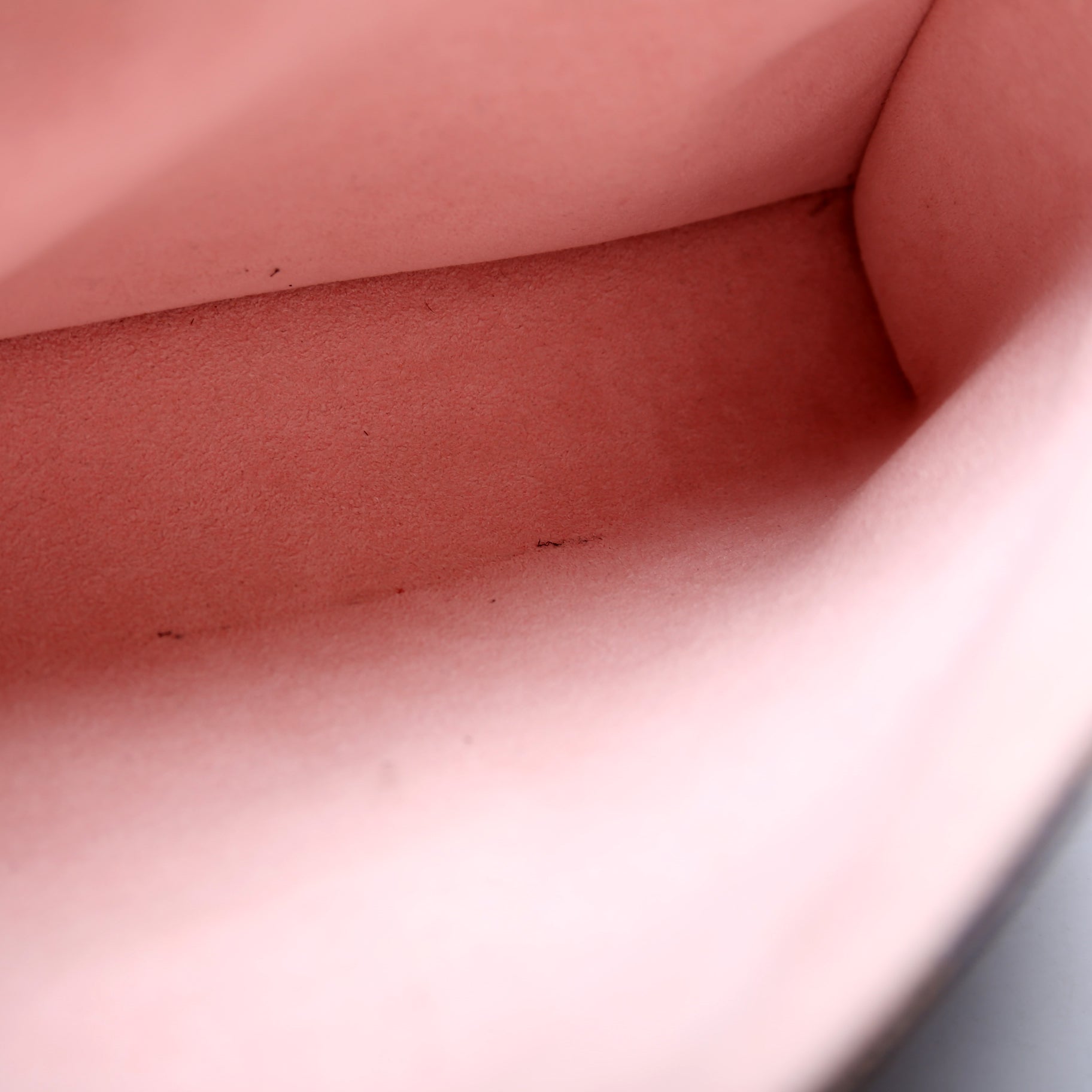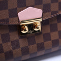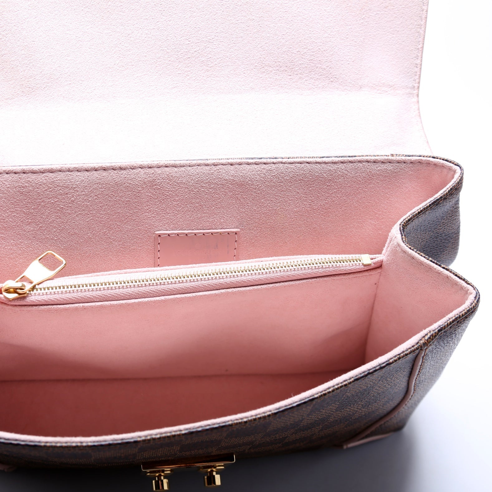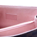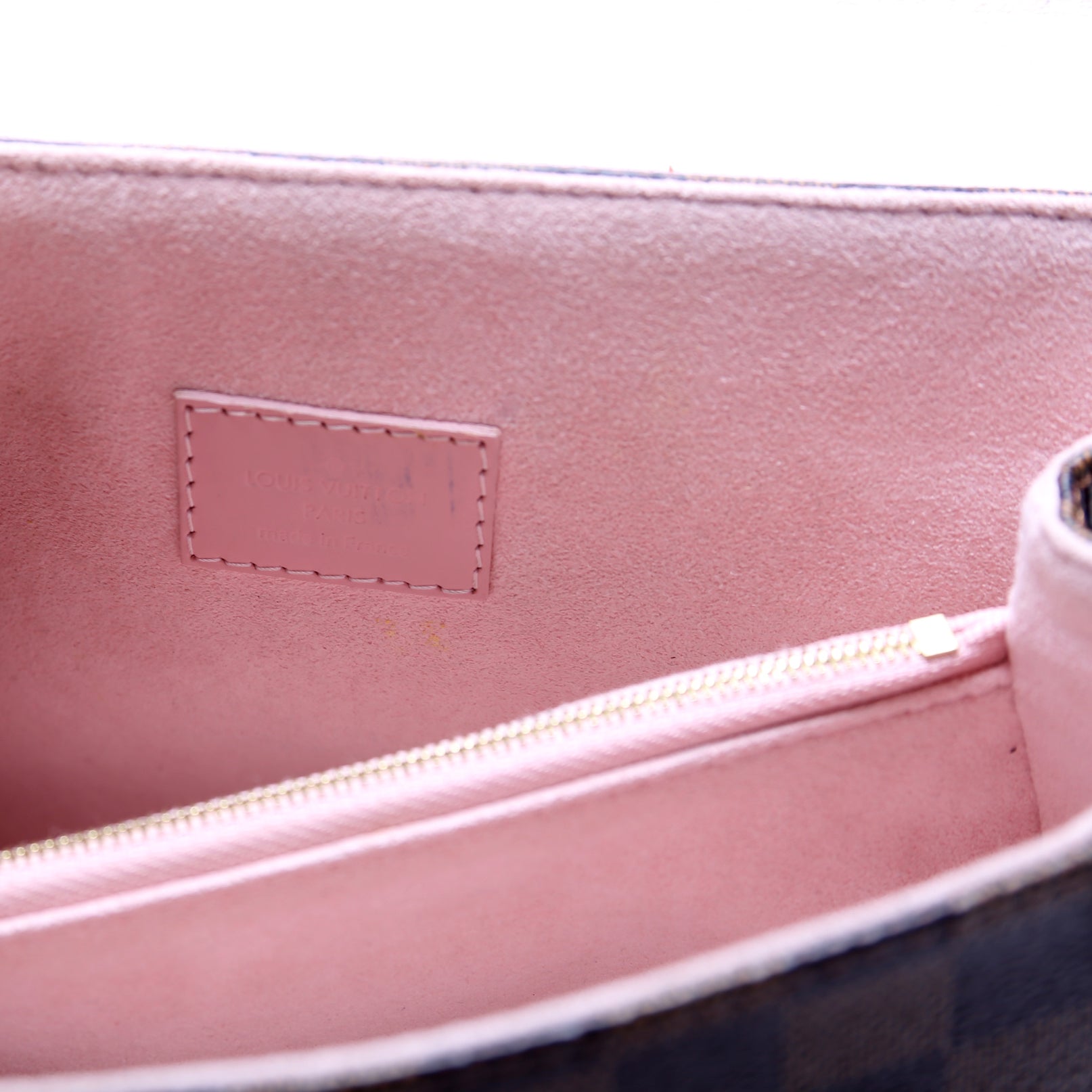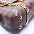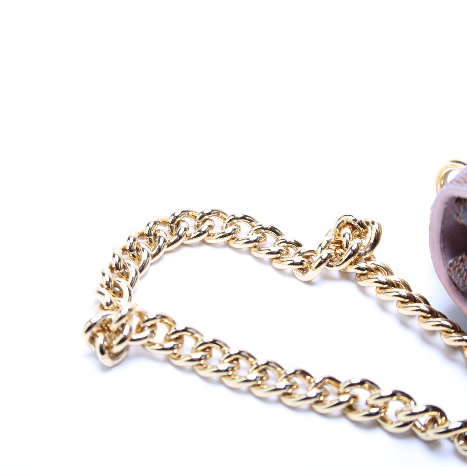 This Louis Vuitton Caissa Chain Clutchis eye catching bag. The exterior is in the classic Louis Vuitton Damier Ebene coated canvas.