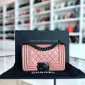 Chanel's Calfskin Boy Small Quilted in Coral Blush is a stunning piece that effortlessly blends elegance with a touch of modern edge. The rare black hardware adds a unique contrast, making this bag a coveted find for collectors. Perfectly compact, yet spacious enough for essentials, this piece is a testament to Chanel's timeless craftsmanship. A must-have for those who appreciate luxury with a distinctive flair.