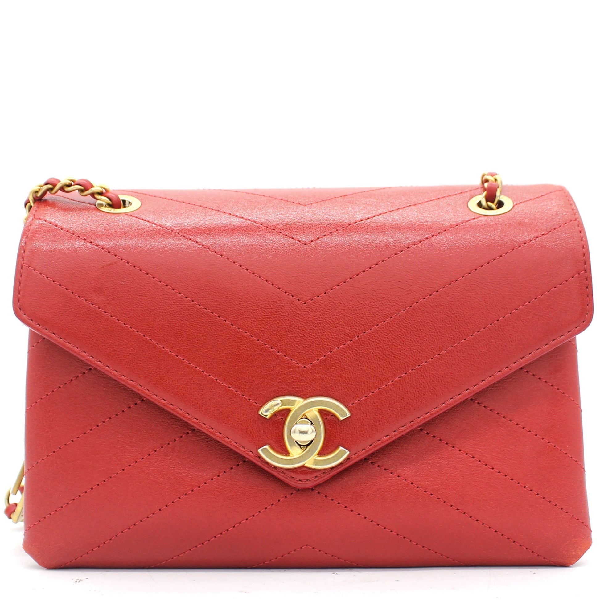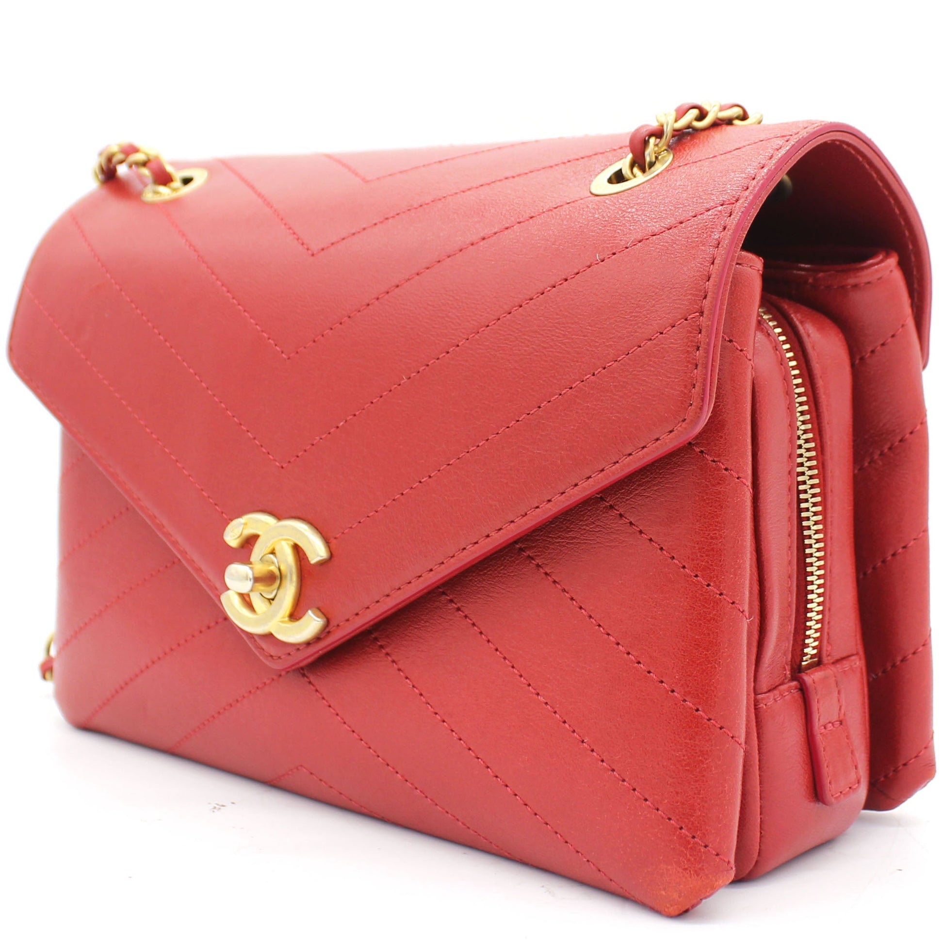 | This stylish bag is finely crafted of chevron-quilted smooth calfskin leather in red. The bag features a gold chain link and leather strap and an envelope flap opening with a gold Chanel CC turn lock. This opens to a beige fabric interior. | Material: Leather Lining: Leather Hardware: Gold-tone Hardware Accessories: Dust Bag; Box; Card Measurement: Serial Number: 25783740 Bought Year: 2018 | ![]() |