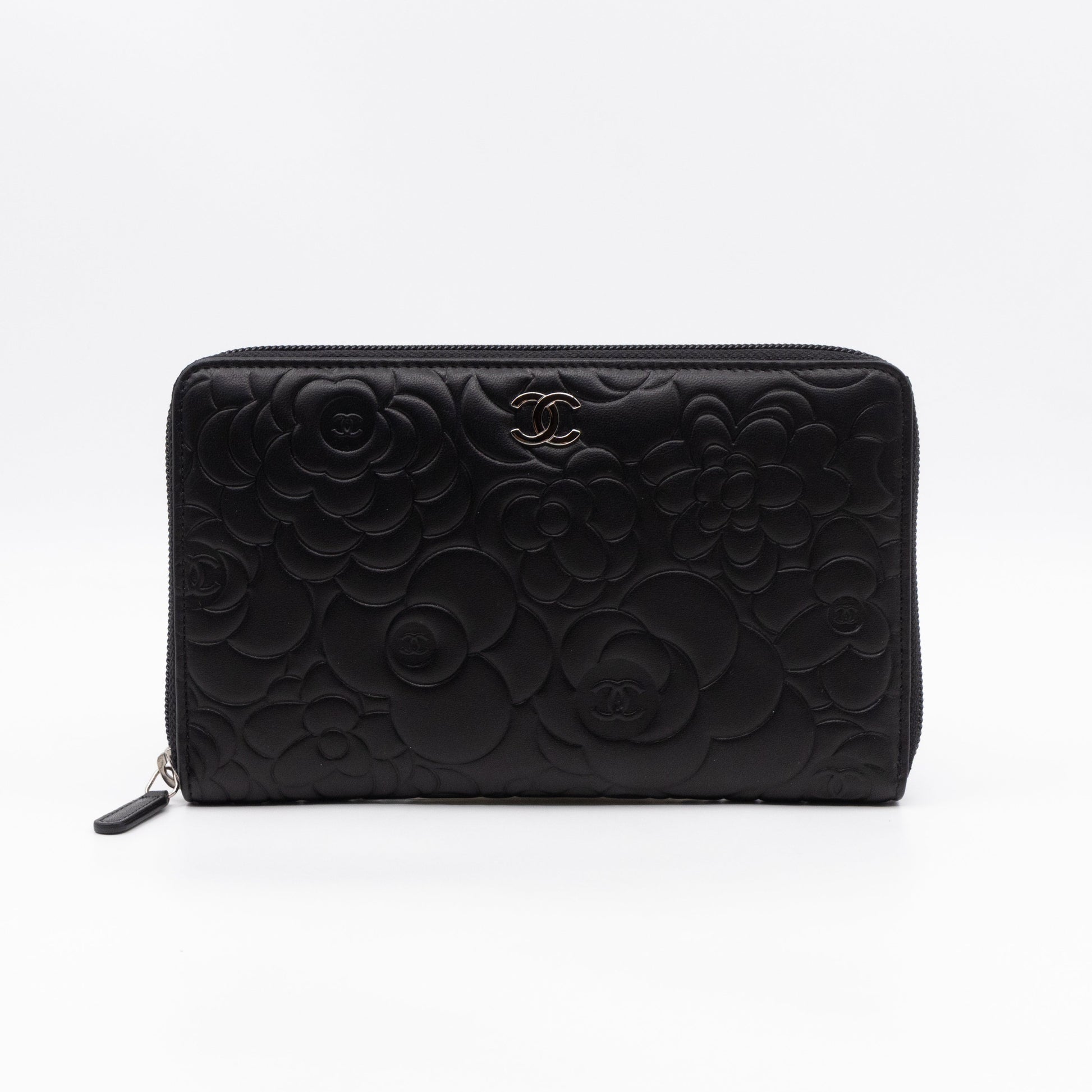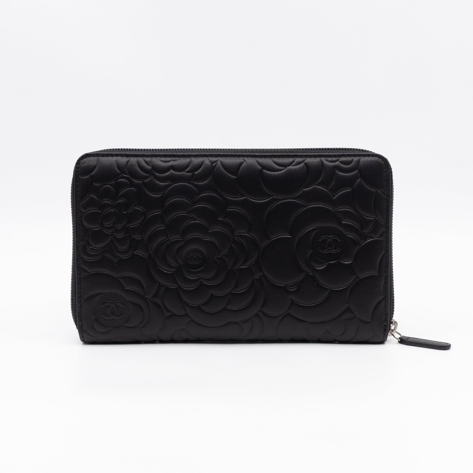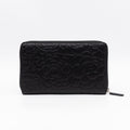 Camellia Embossed Zip Around Organizer Wallet Black Lambskin