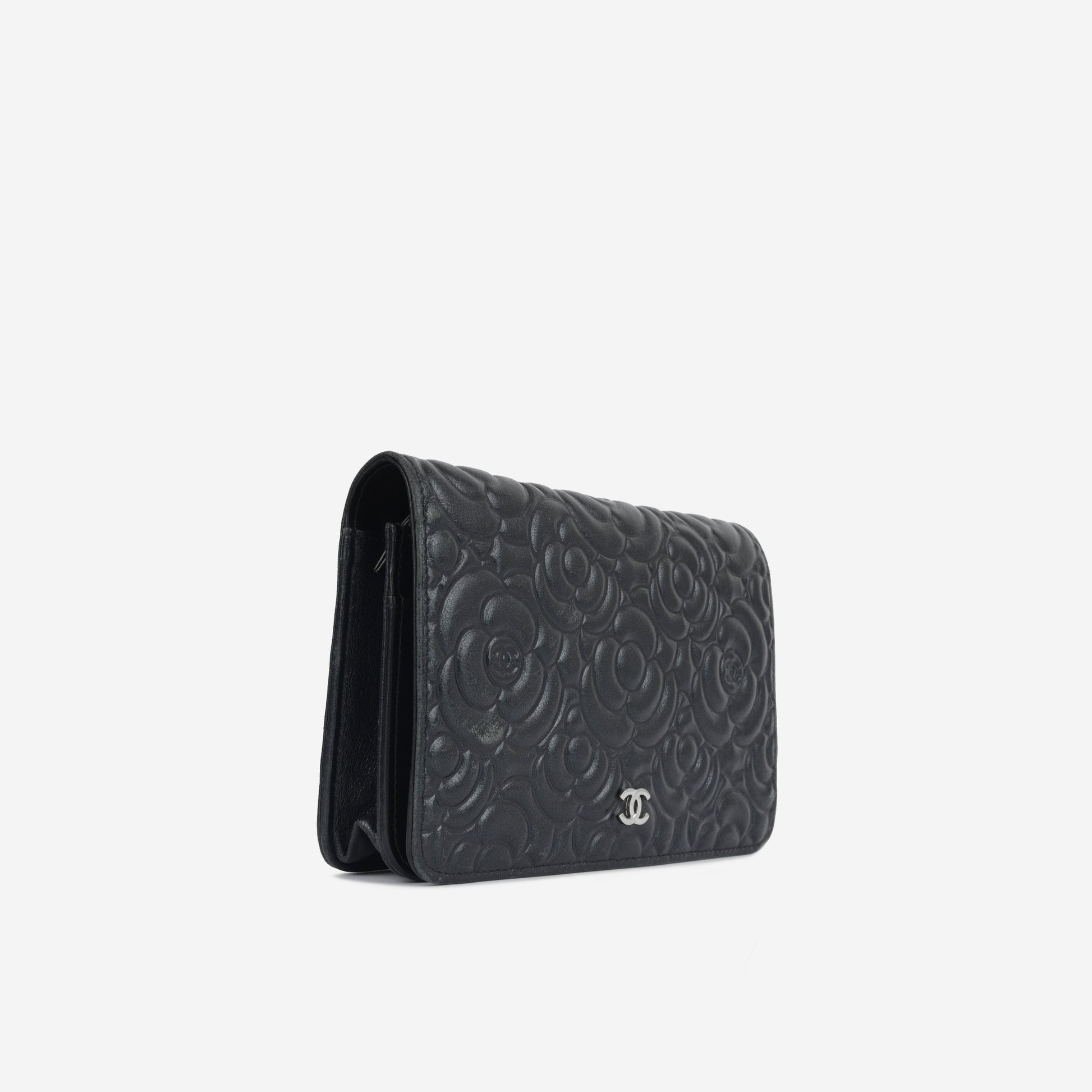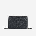 Introducing a stunning Black Camellia Chanel Wallet on Chain, crafted from luxurious lambskin and featuring the iconic quilted camellia pattern. This collectible piece pays homage to Chanel's signature style, inspired by a bouquet of camellias presented to Gabrielle "Coco" Chanel by her lover Boy Capel. Practical, elegant, but effortlessly edgy and timeless but ideal for the modern woman at all the same time.