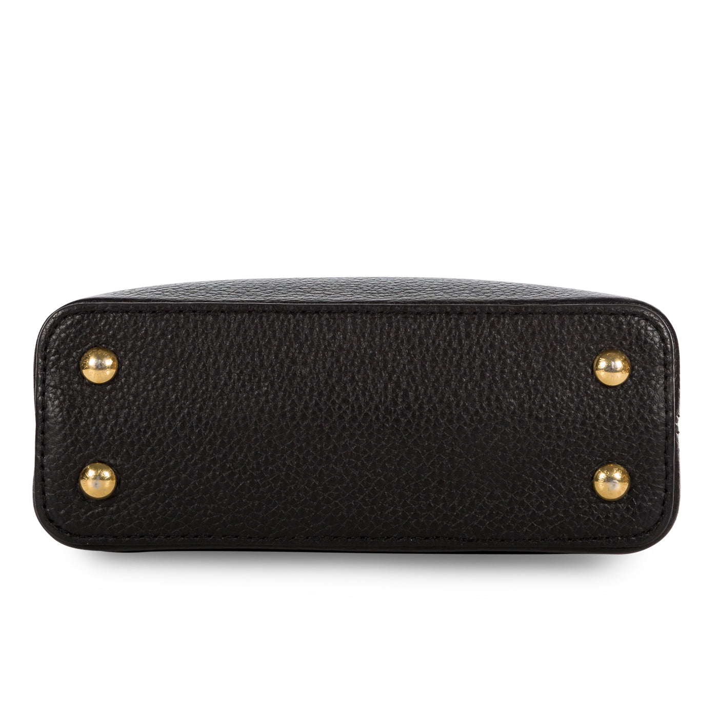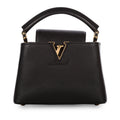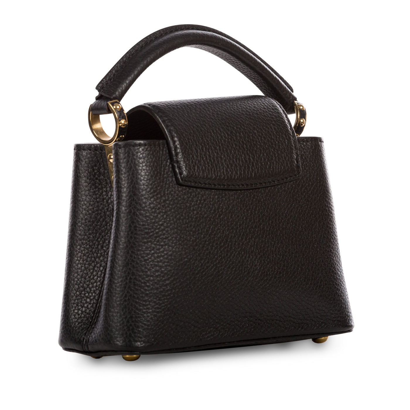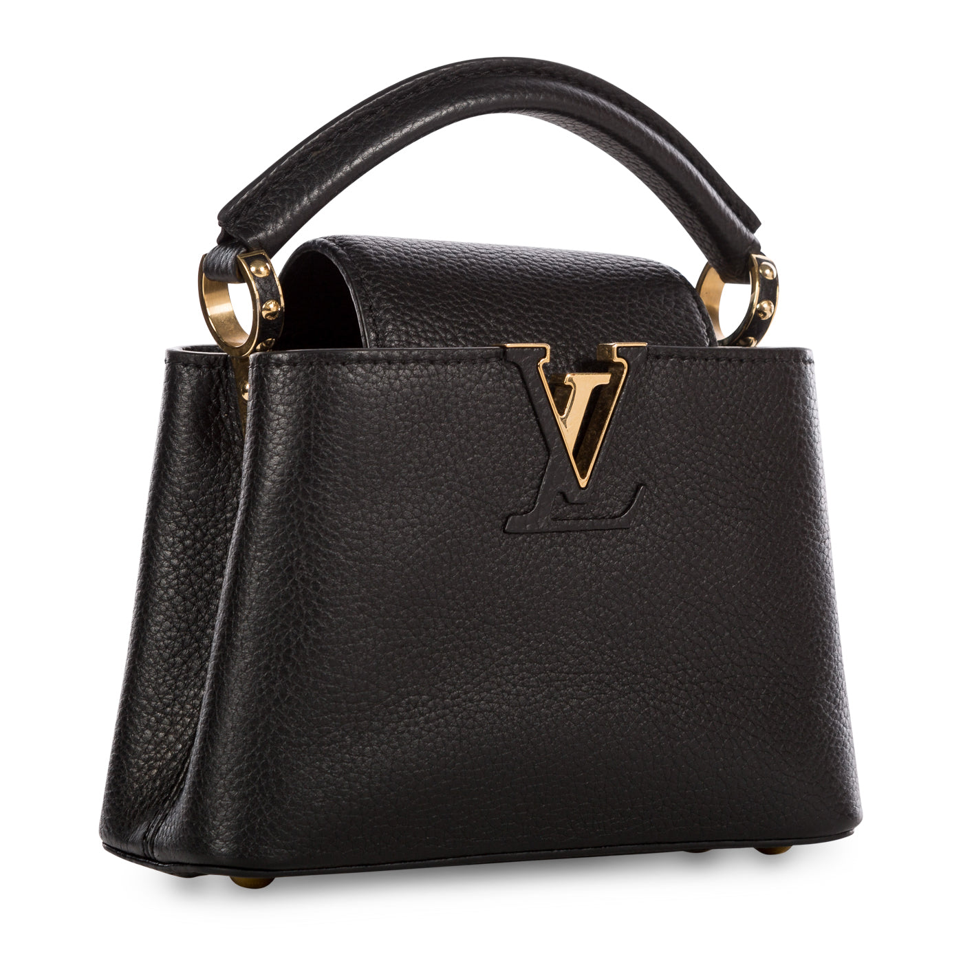 The Capucines Mini Bag by Louis Vuitton is the perfect city chic bag and is the smallest in the Capucines Collection. With modern lines and bold hardware, this will stand out from the crowd. The BB is compact and easy to wear as it adds a glamourous touch to any outfit. The Capucines line takes its name from the Rue des Capucines in Paris, where Louis Vuitton opened his first store in 1854. Wear the flap on the outside to show the monogram flower, or tuck the flap into the top compartment to reveal the LV initials in stunning gold hardware.