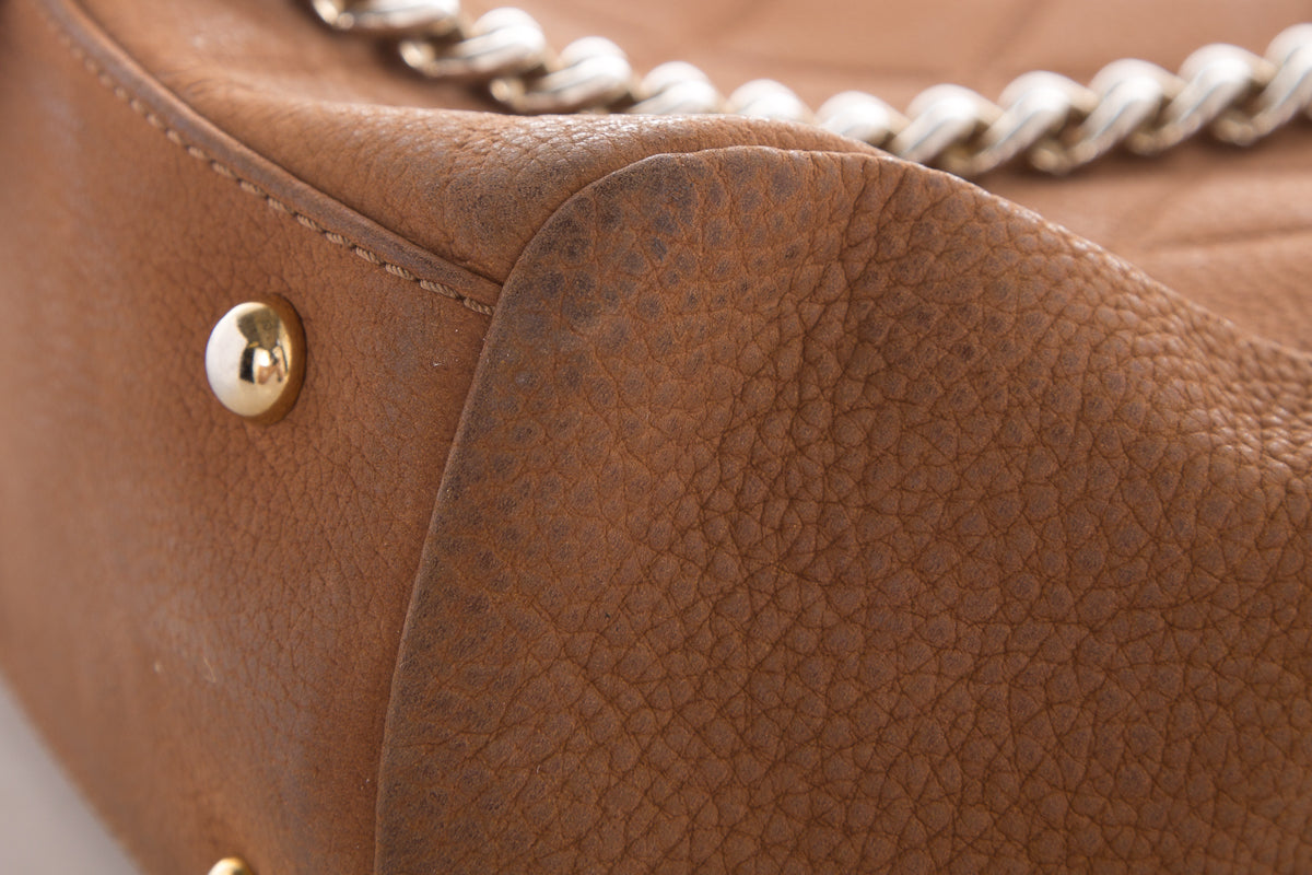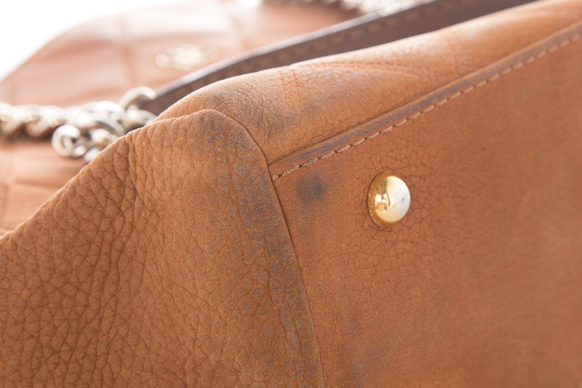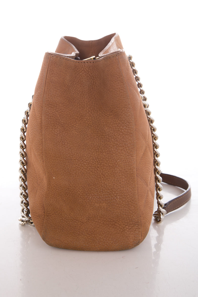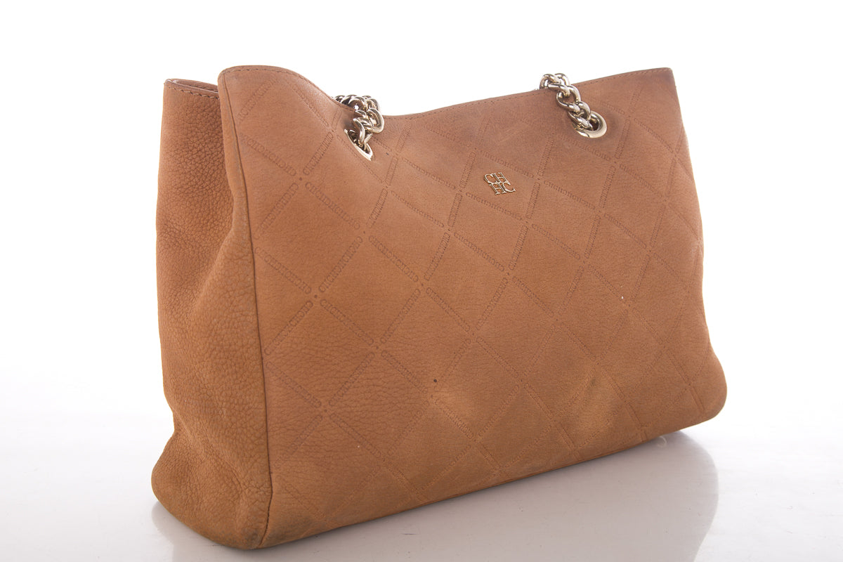 Carolina Herrera Camel Suede Quilted Shoulder Bag with chain link dual strap, gold hard ware. This item is gently loved with some wear to edges, discoloring and marks to leather on back.