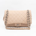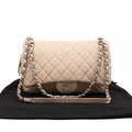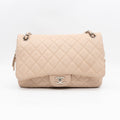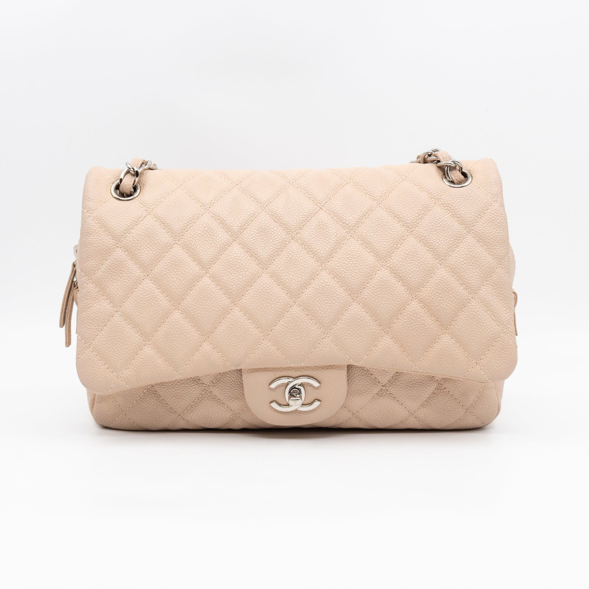 This is the Chanel Casual Journey flap bag. This stylish shoulder bag is made with diamond quilted beige caviar leather and silver-tone hardware. This bag features a polished silver chain link leather threaded shoulder strap with a leather shoulder pad. The flap opens to a top zipper that opens to a fabric interior with zipper and patch pockets. With this bag you can carry all your daily in a timeless fashion.