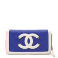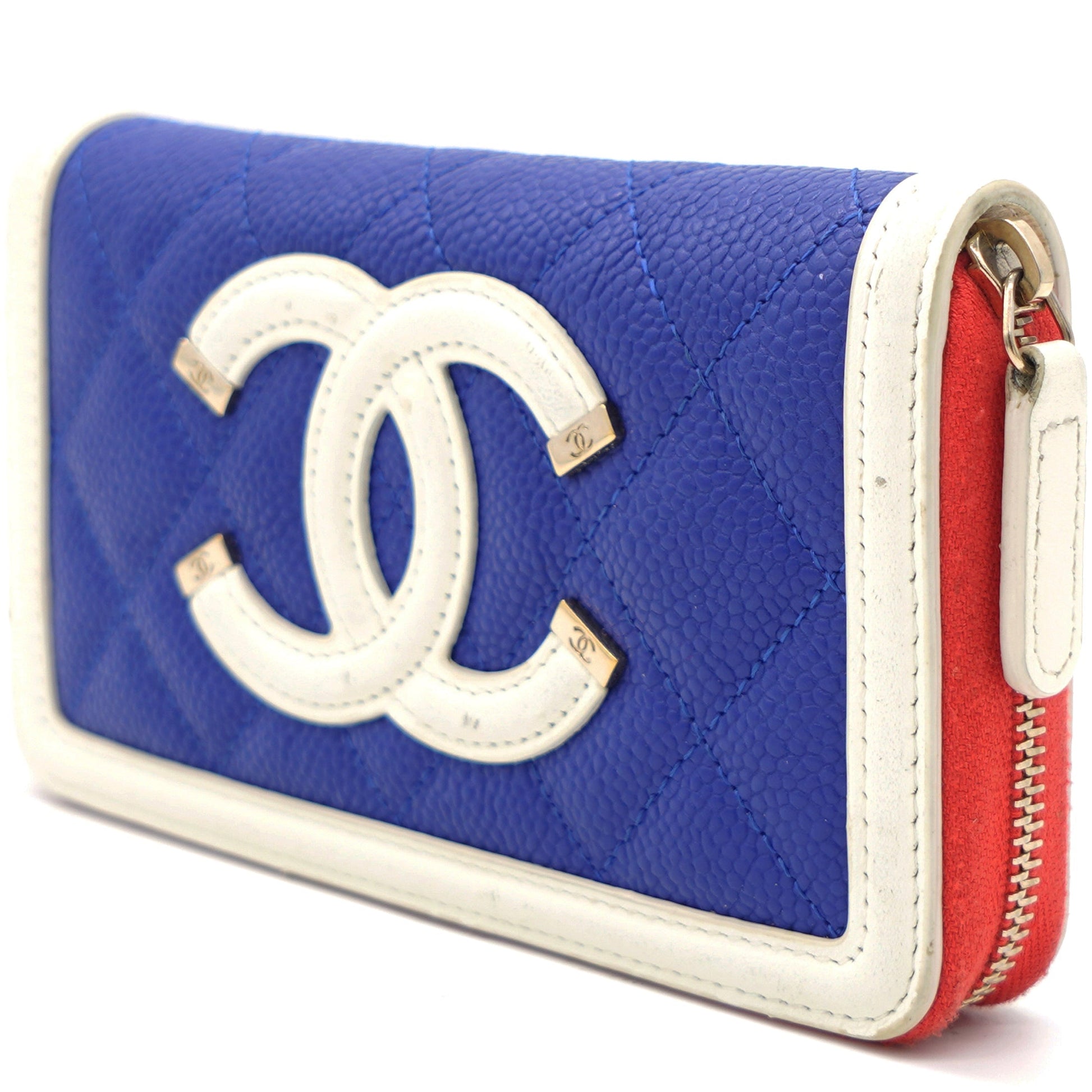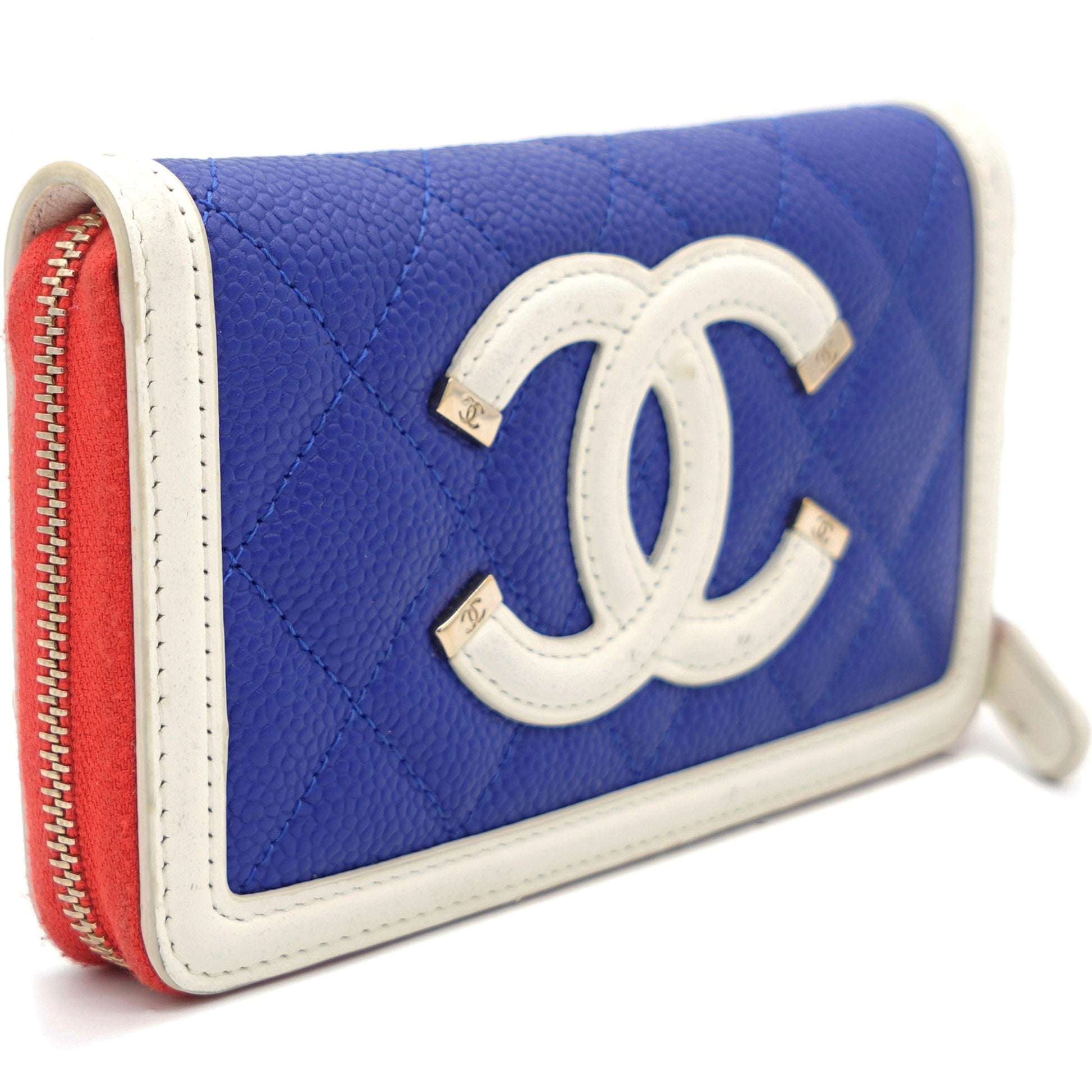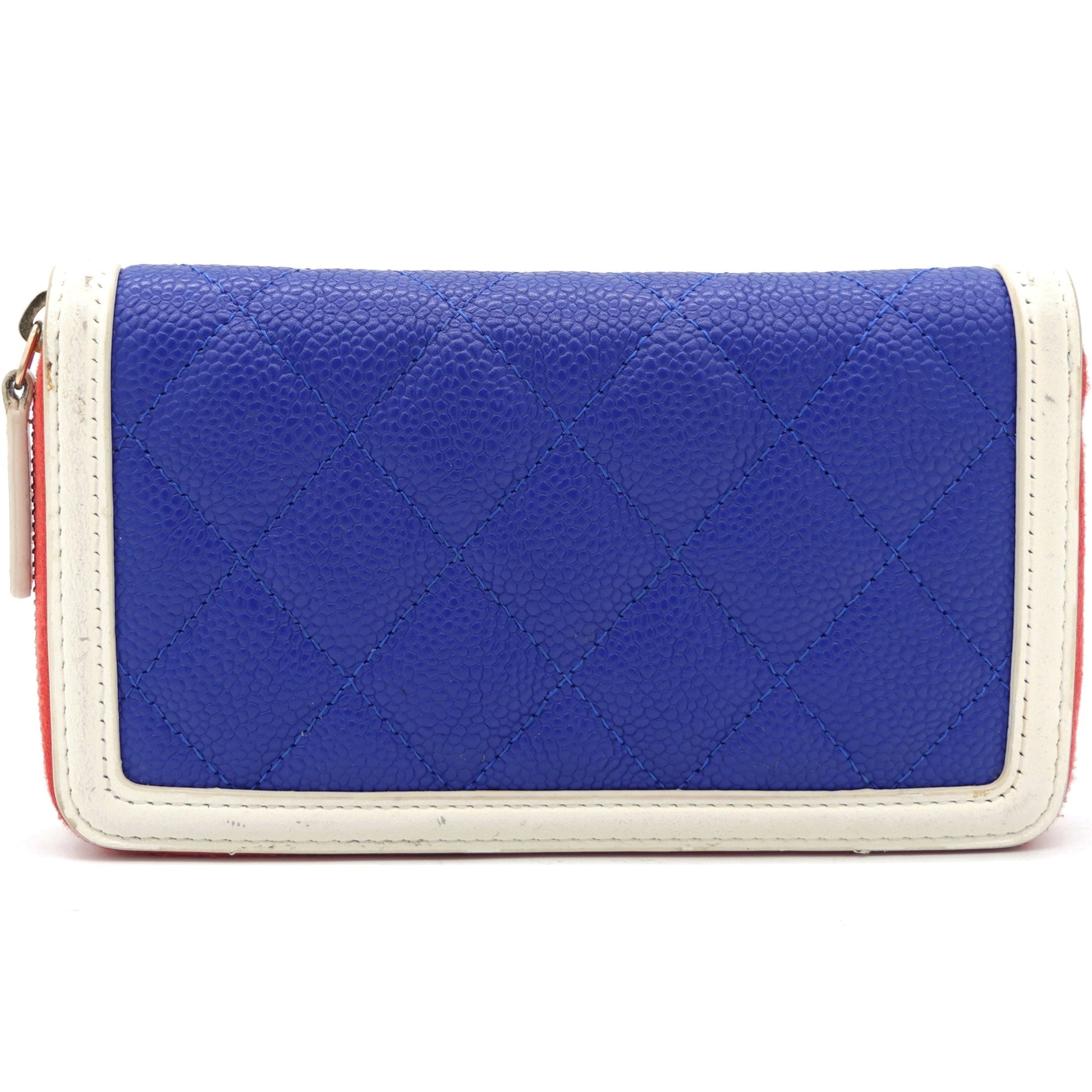 | This chic clutch wallet is crafted of diamond quilted caviar leather in blue detailed with white leather trim and a small ruthenium Chanel CC embellishment. The zipper opens to a partitioned matching leather interior with four card slot panels and a central zippered compartment. | Material: Leather Lining: Leather Hardware: Silver Color Finish Metal Accessories:Dust Bag; Receipt; Card; Box Serial Number: 27160075 Production Year: 2019 | ![]() |