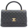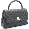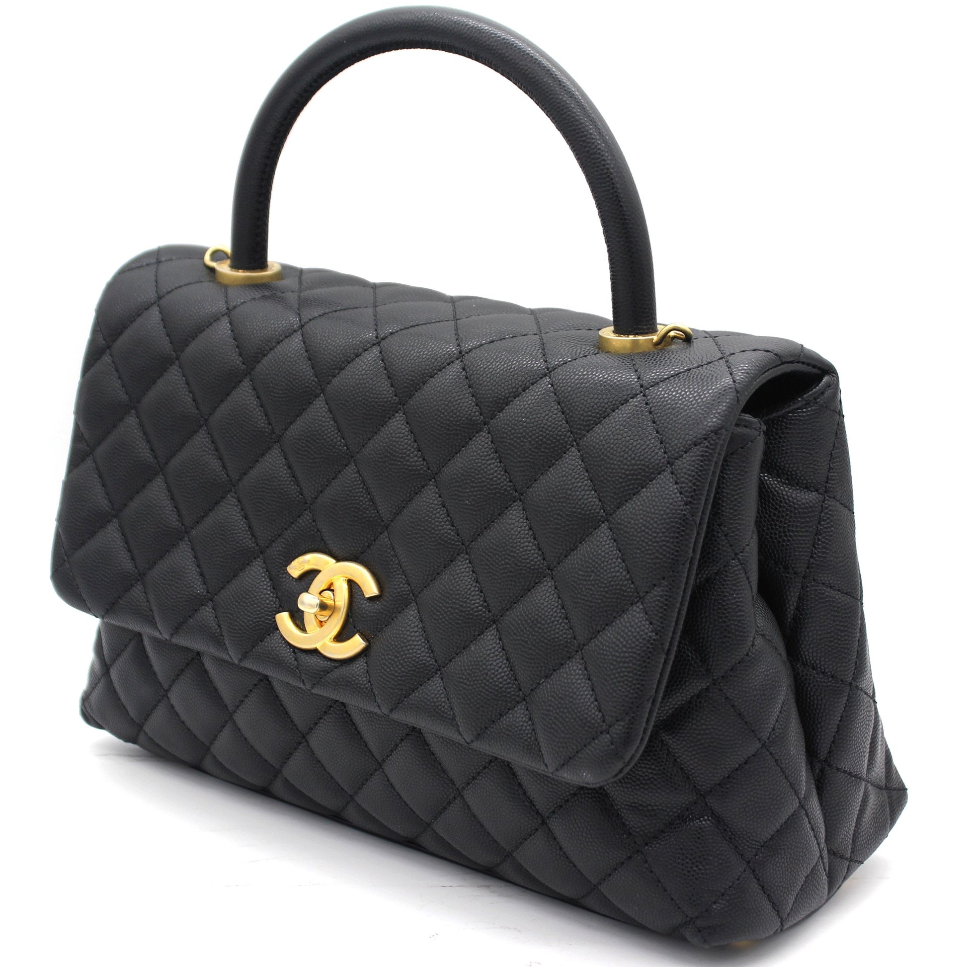 | Crafted of diamond-stitched grained caviar calfskin leather in black. The shoulder bag features a sturdy leather top handle, a gold chain link leather threaded shoulder strap with a shoulder pad, a rear patch pocket and a gold CC turn clock closure. This opens the flap to a partitioned fabric interior with a zipper pocket, patch pockets and a central dividing zipper compartment. | Exterior Material: Black Calfskin leather with leather top handles, a gold chain link leather threaded shoulder strap, a rear patch pocket and a gold CC turn clock closure. Interior Material: Fabric lining with two main compartment divided by a central zipped pocket, a zipper pocket and patch pockets. Accessories: Dust Bag; Receipt; Card; Serial Number: 24214921 Bought Year: 2017 | ![]() |