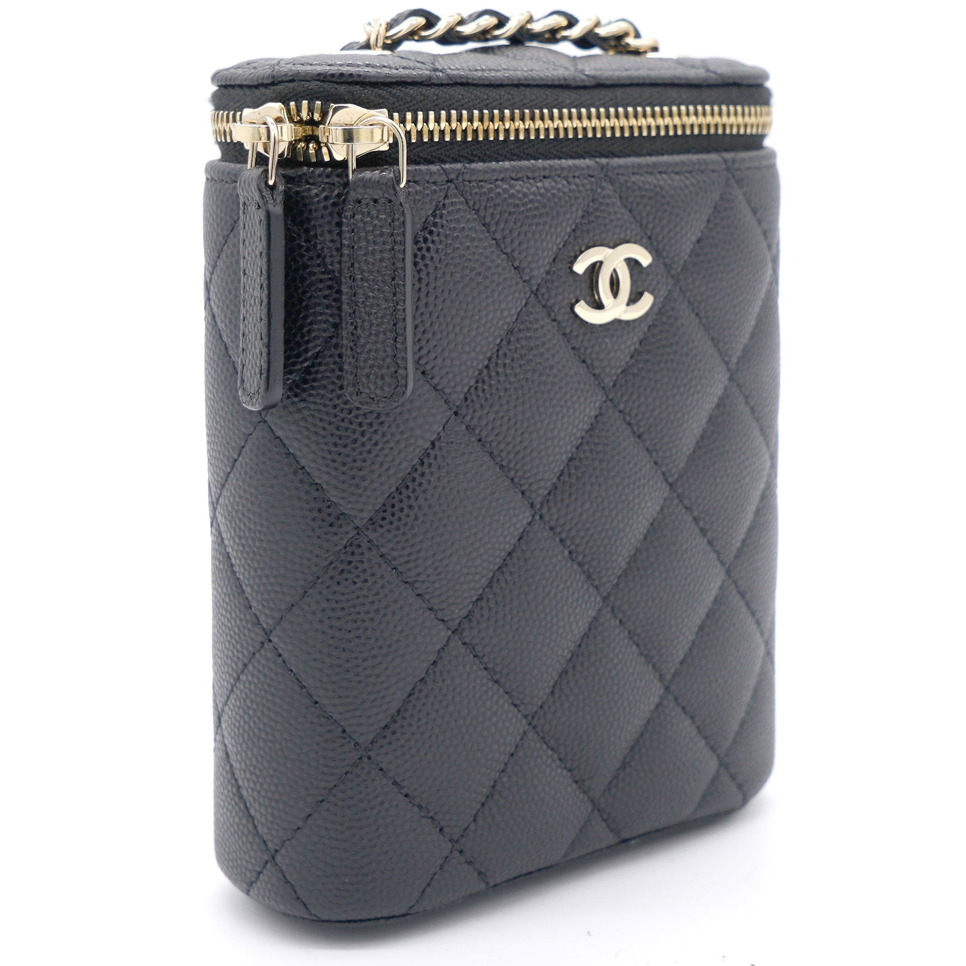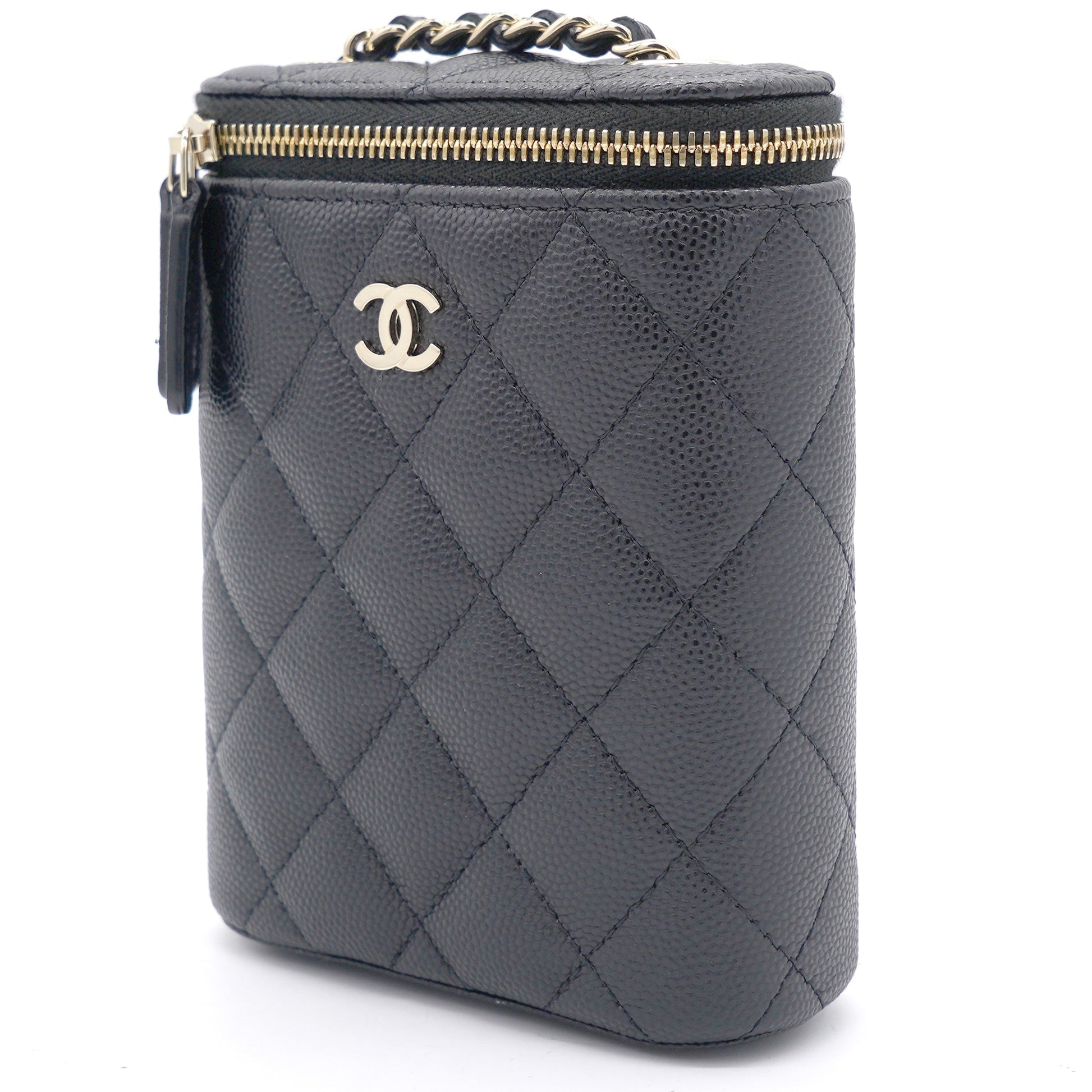Chanel Caviar Quilted Nano Vertical Coco Beauty Vanity Case With Chain Black