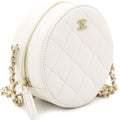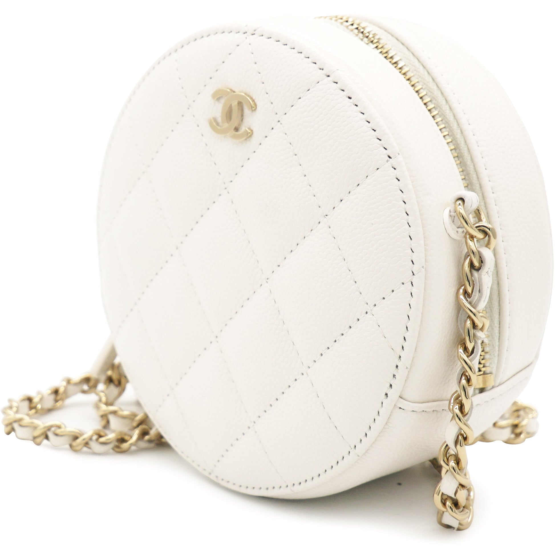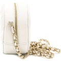 | This stylish crossbody bag is crafted of luxurious caviar leather in White. The bag features light gold tone link leather threaded shoulder strap and a light gold tone Chanel CC logo on the front. This crossbody bag opens with a top zipper to a matching white fabric interior. | Material: Leather Lining:Textile Hardware:Gold-Color Finish Metal Accessories:Dust Bag; Card Serial Number:30822456 Production Year:2020 | ![]() |