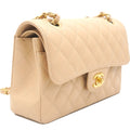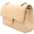 | Made in Italy, this small double flap chain shoulder bag was fashioned from beige colour caviar leather, finished with a diamond quilt. It features a leather shoulder strap, adorned with a gold-tone chain, and a main foldover top that is closed by a CC turnlock. As it opens, it leads to a second, smaller flap, fastened by a snap button. It presents us to a luxurious beige interior, embellished with a stitched logo and a classic logo stamp. The compartment has two slip pockets and an internal logo stamp. Functional, the accessory displays a front slip pocket, hidden under the double flaps, and another one open on the back. | Material: Leather Lining: Leather Hardware: Gold Color Finish Metal Accessories:Dust Bag; Box; Receipts Serial Number: NA6LHEX9 Production Year: 2022 | ![]() |