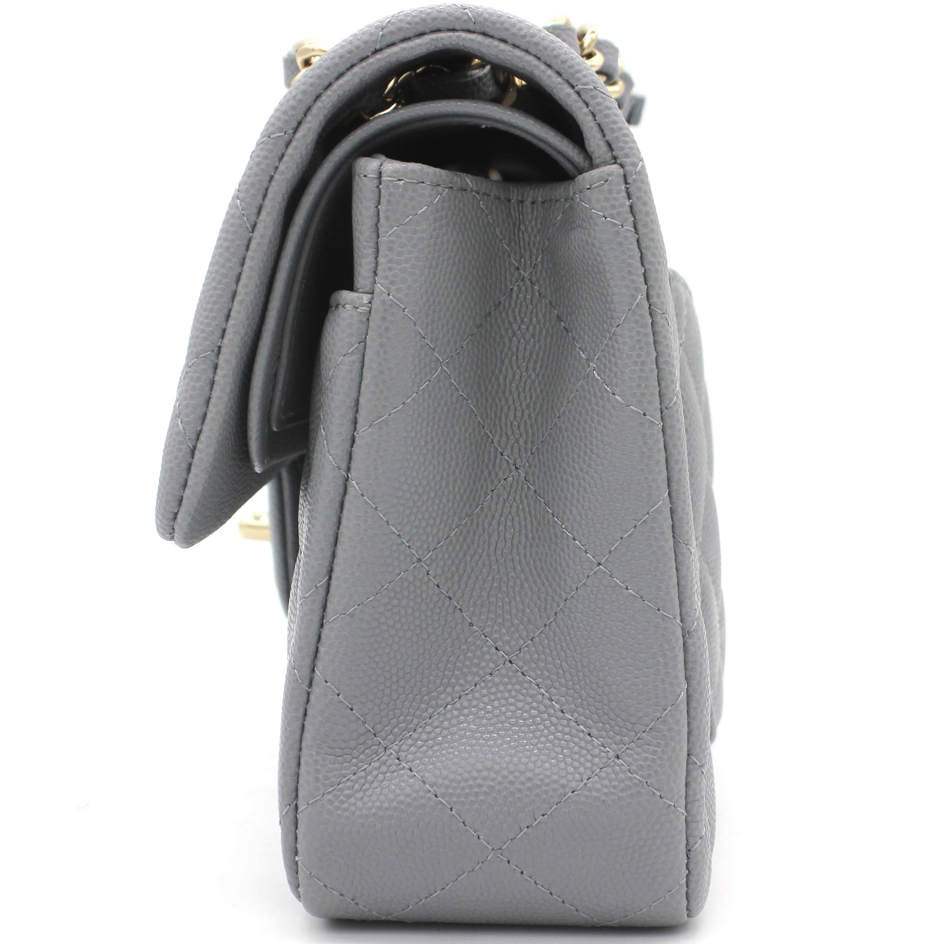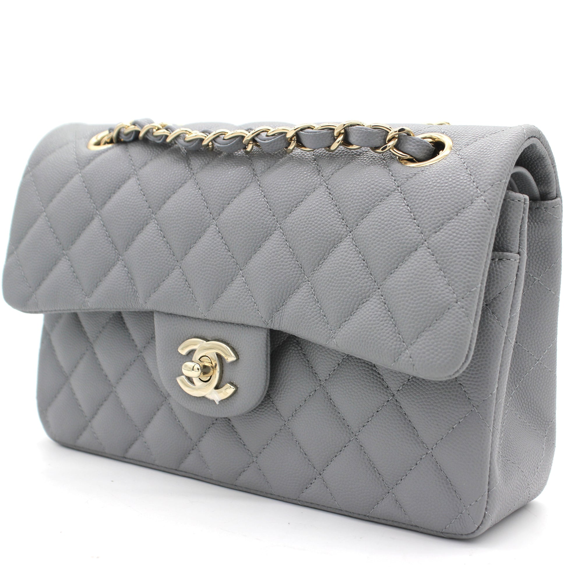 | Made in Italy, this small double flap chain shoulder bag was fashioned from 2020 limited colour grey caviar leather, finished with a diamond quilt. It features a leather shoulder strap, adorned with a gold-tone chain, and a main foldover top that is closed by a CC turnlock. As it opens, it leads to a second, smaller flap, fastened by a snap button. It presents us to a luxurious grey interior, embellished with a stitched logo and a classic logo stamp. The compartment has two slip pockets and an internal logo stamp. Functional, the accessory displays a front slip pocket, hidden under the double flaps, and another one open on the back. | Material: Leather Lining: Leather Hardware: Gold-tone Accessories: Dust Bag; Card; Receipt; Box Measurement: Bought Year: 2020 | ![]() |