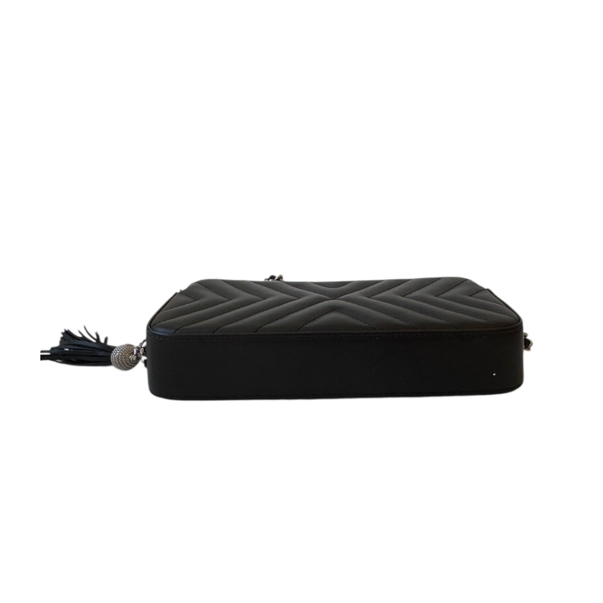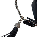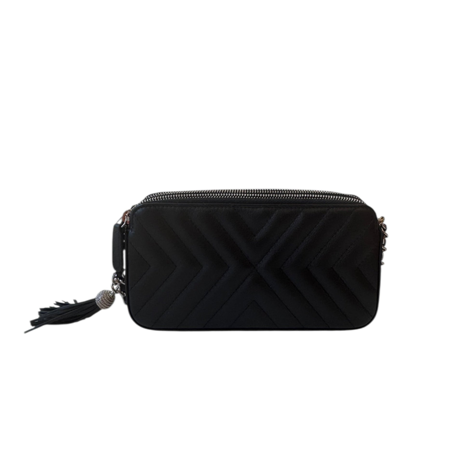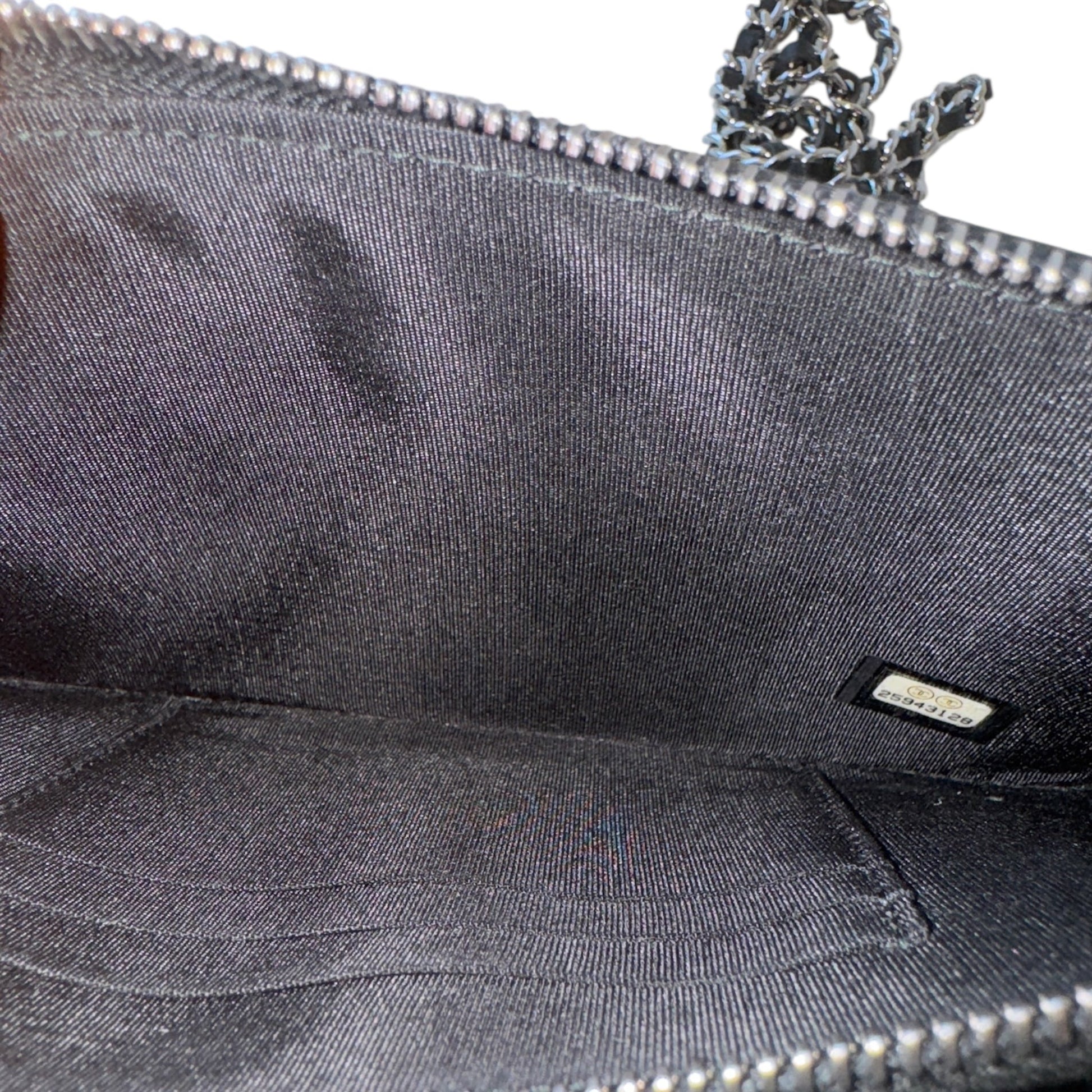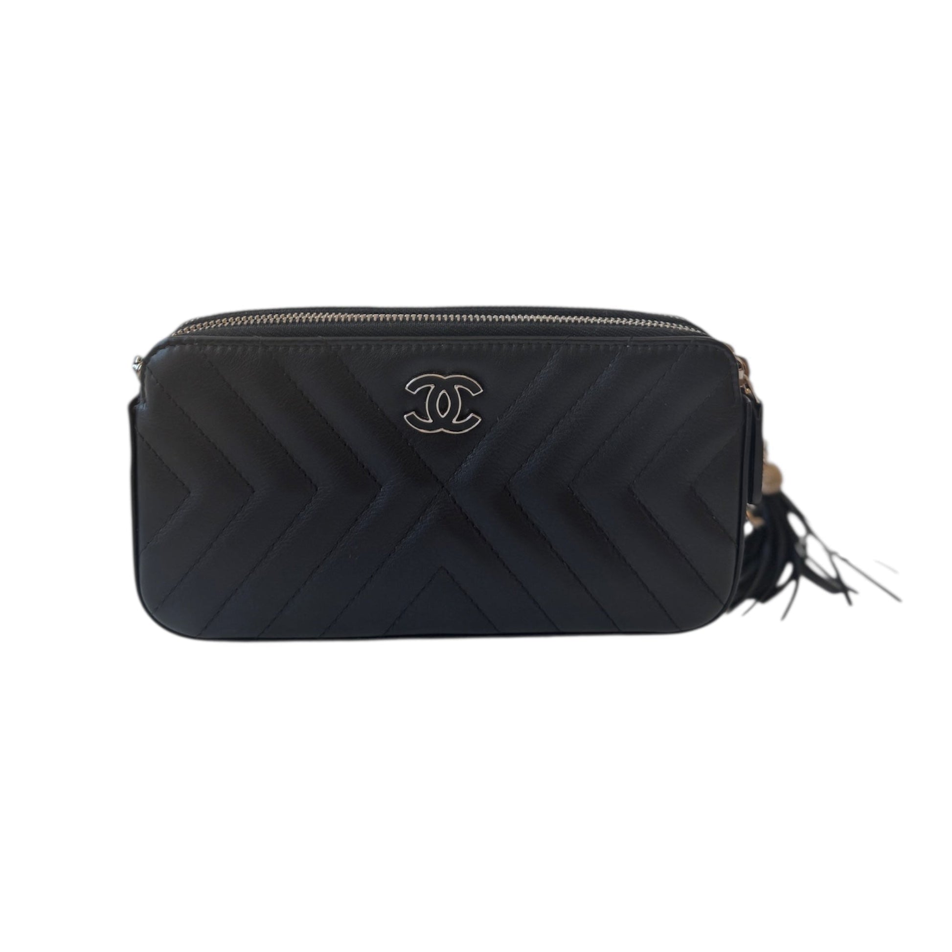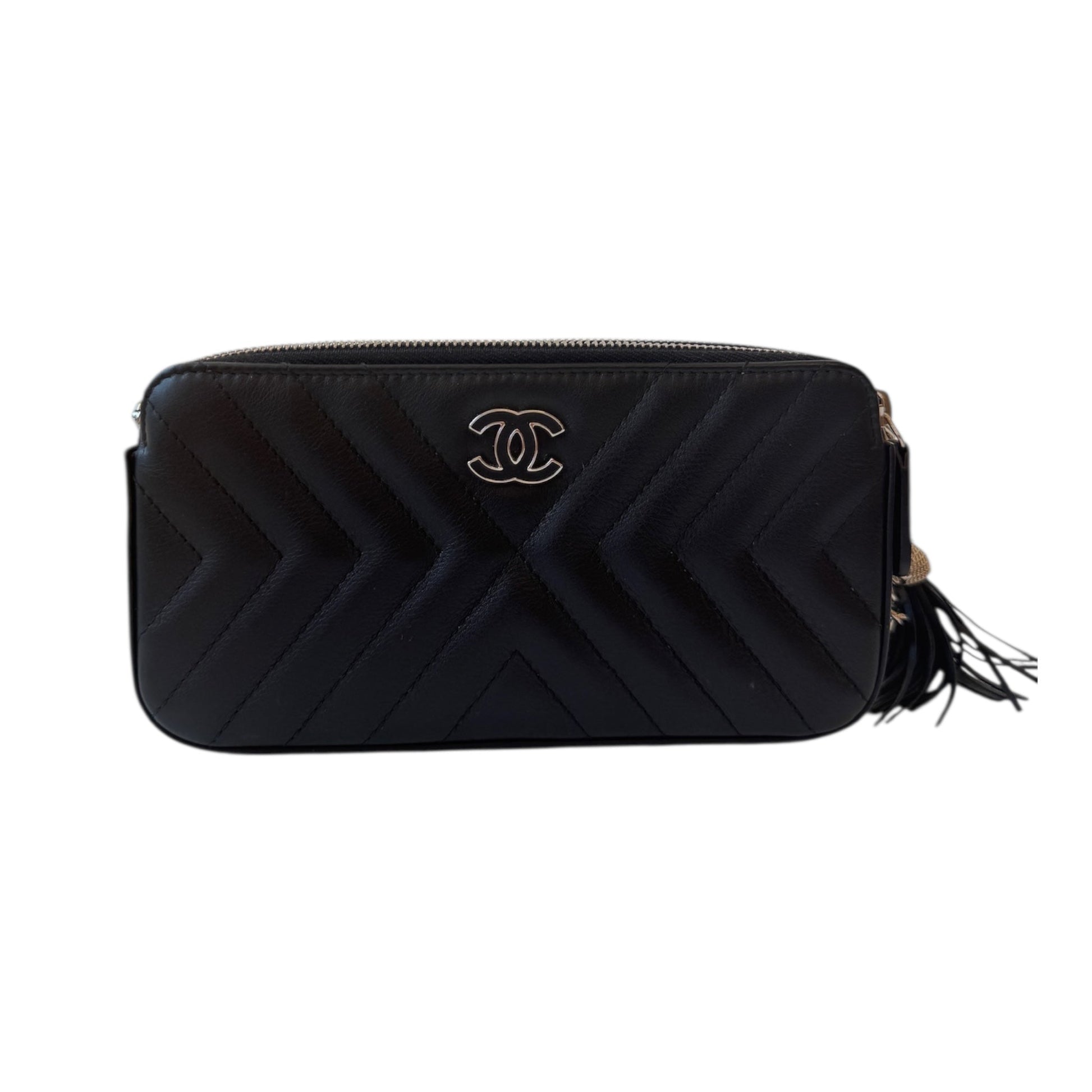 The clutch showcases a sleek black color with a distinctive chevron pattern. It has a zipper closure for secure storage. The iconic CC logo is prominently displayed, ensuring brand recognition. The tassel adds a chic, playful element to the design.