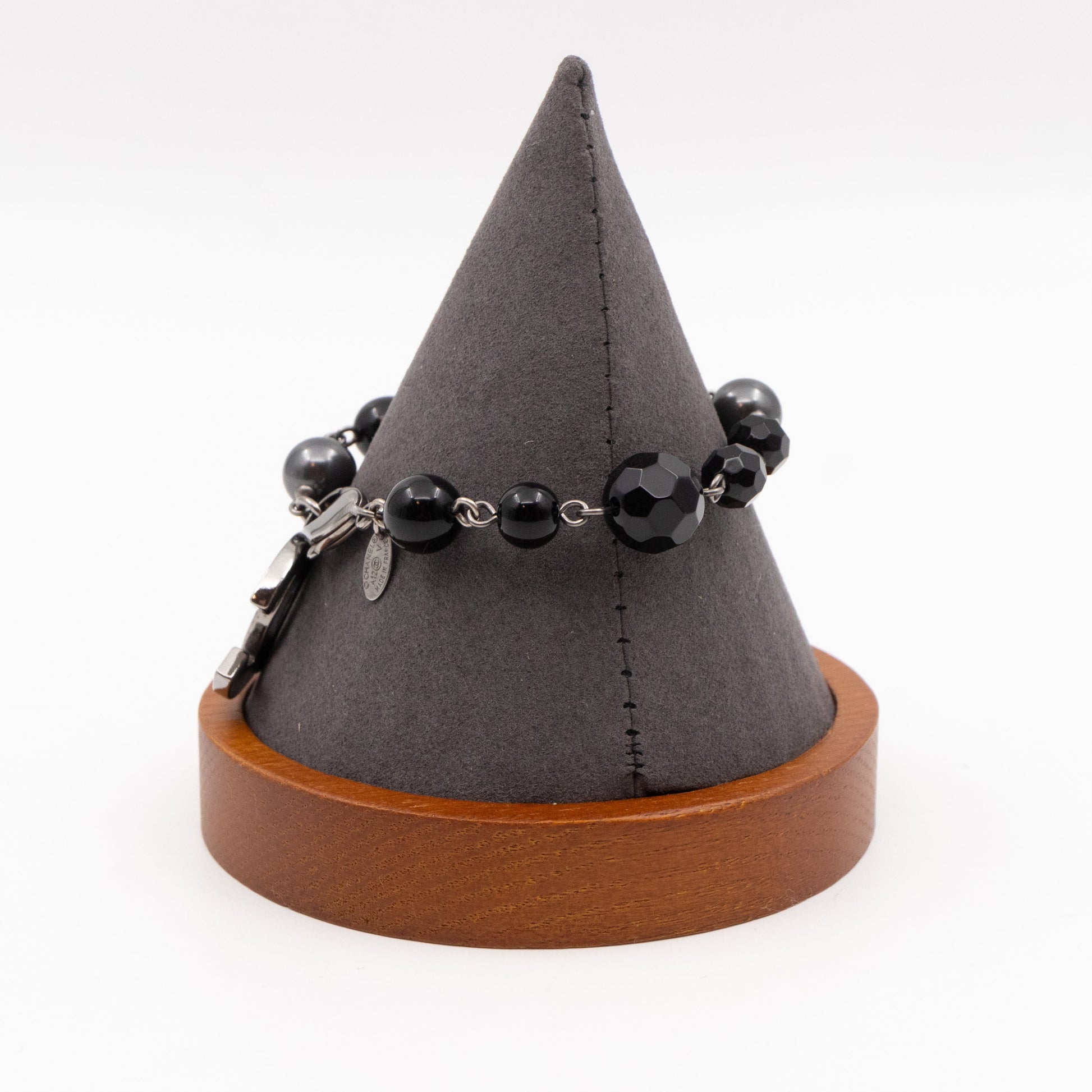 This is a Chanel CC Coco mark bracelet. This bracelet is made of black beads and ruthenium hardware. Features with a large CC logo pendant. This bracelet can also use it like a charm. Total wearable length is 18.7 cm.