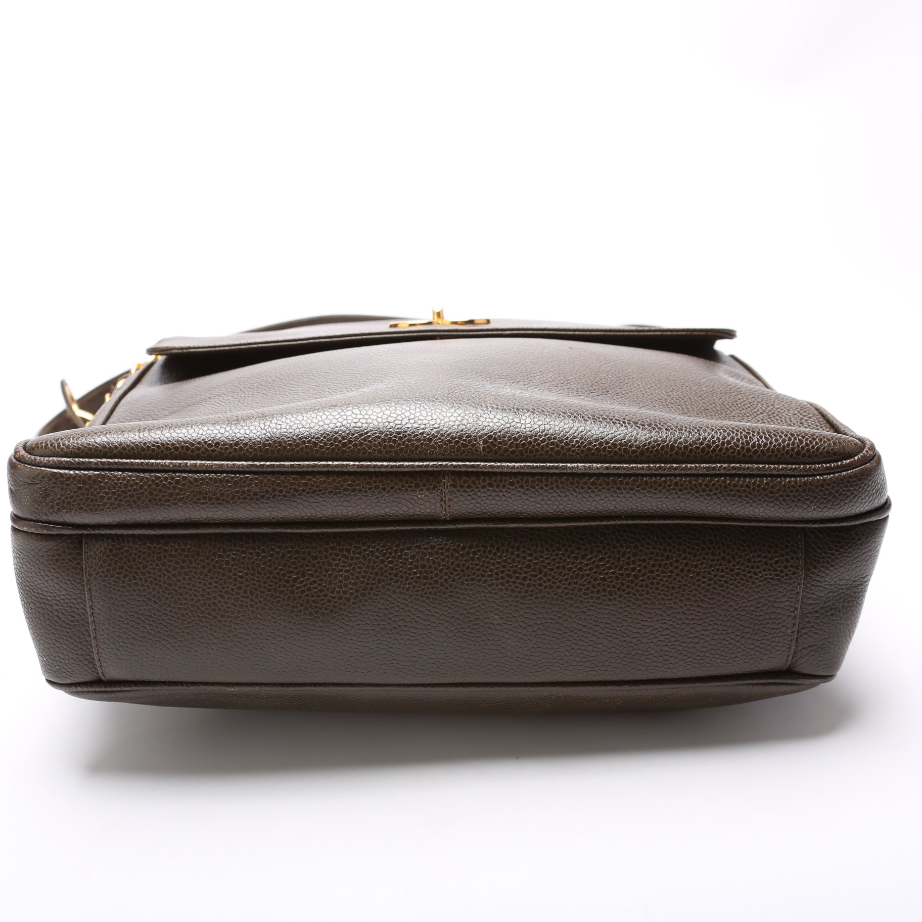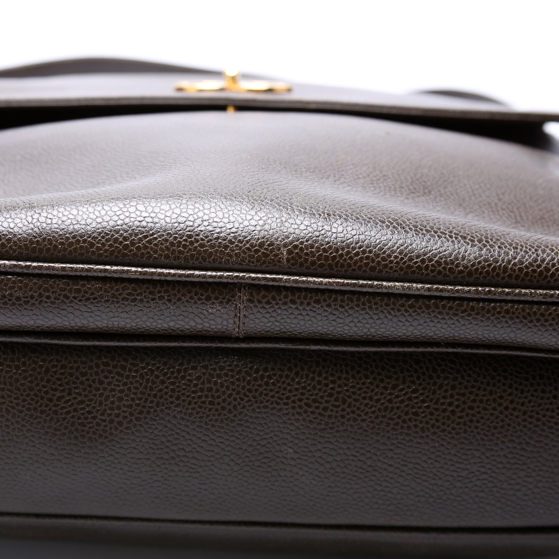 Exterior: The exterior caviar leather shows minor scuffs and wear throughout. The exterior features one open pocket and one cc lock closure pocket.
