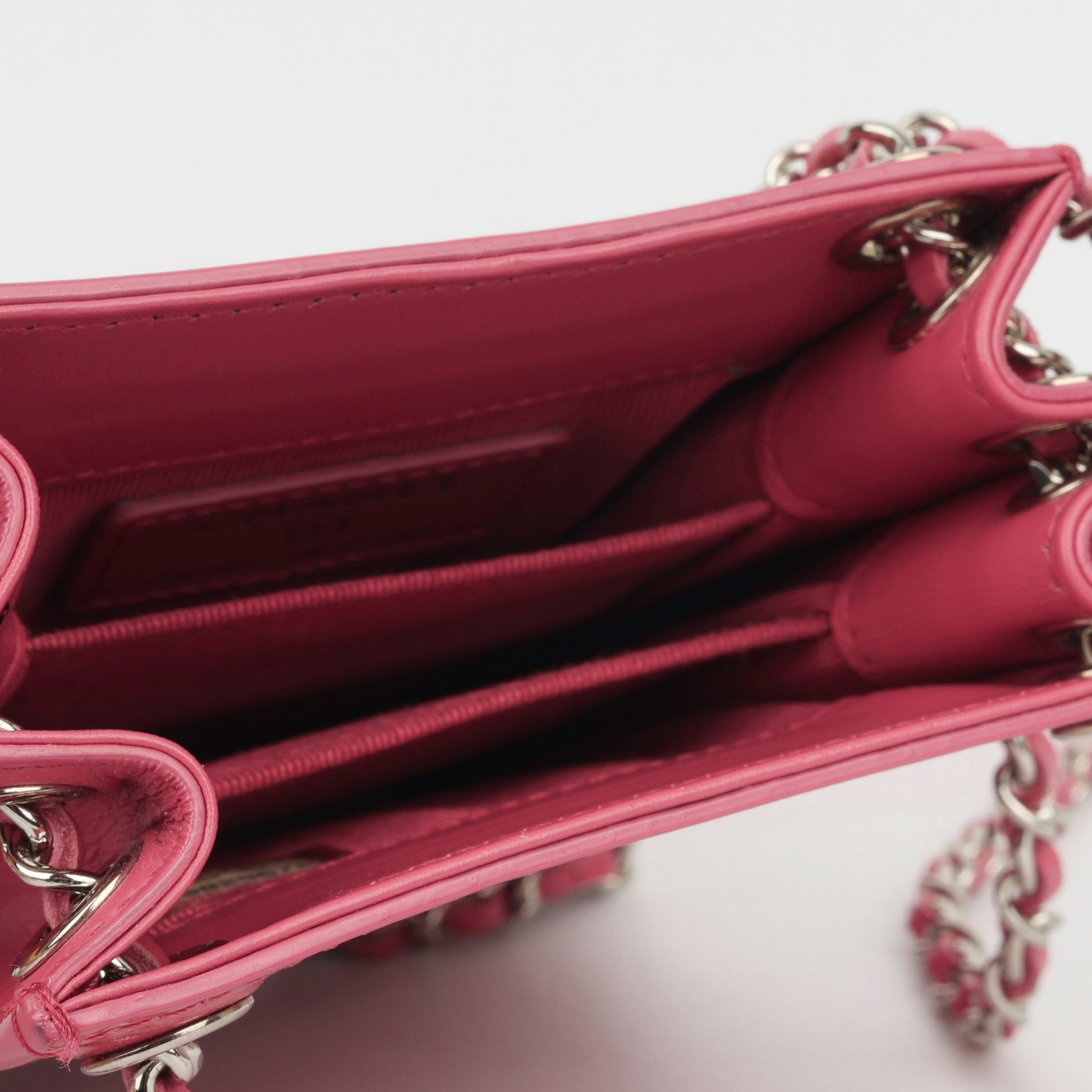 The Chanel Chain Around Phone Holder Crossbody Bag is the perfect accessory to complete any outfit. The raspberry pink lambskin leather bag features a stitched interlocking CC logo with the classic leather interwoven chain strap which can also be worn crossbody or doubled up and worn on your shoulder. This bag is an easy, efficient way to carry your phone and be completely handsfree. This stunning little gem is a well-worthy addition to your handbag collection.