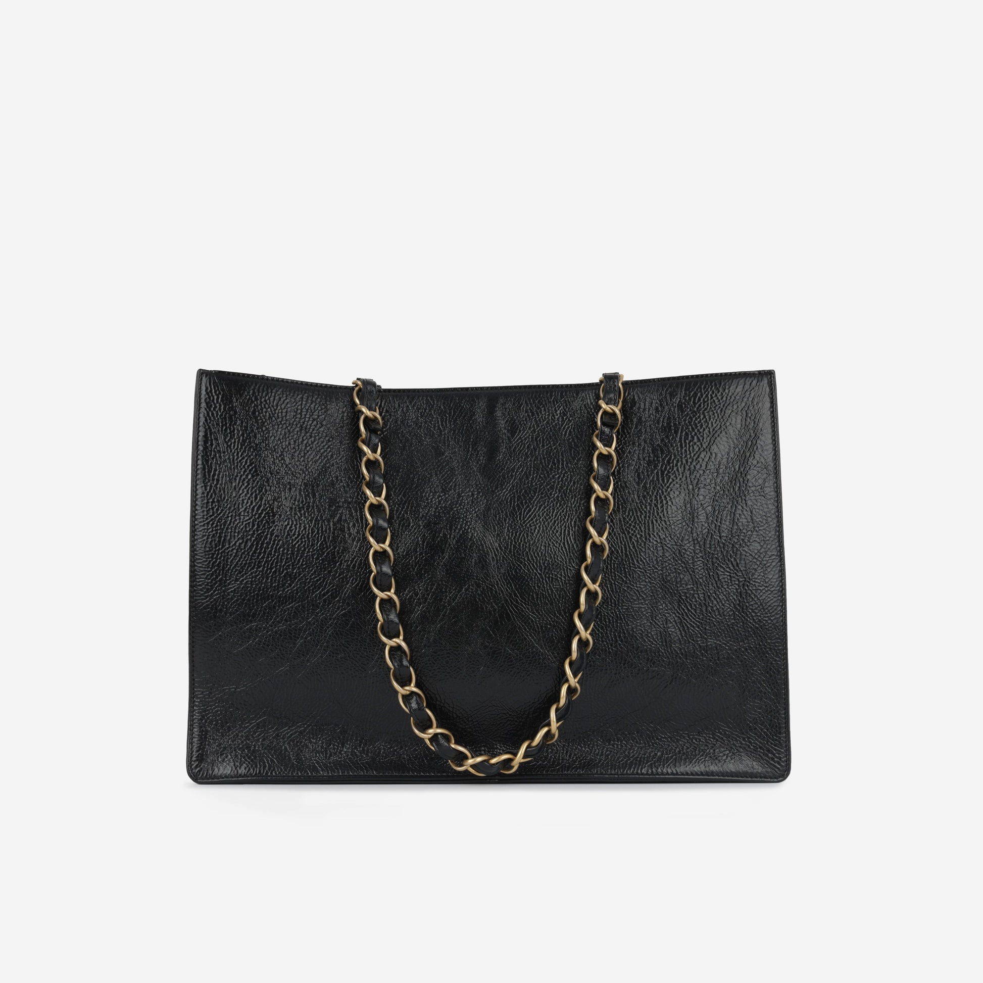 Carefully crafted from black glazed calfskin, this Chanel tote is an absolute must-have. The ideal bag for a woman with a love for luxury and a soft spot for Chanel, this CC Tote is also the perfect companion if you like to carry your whole world with you wherever you go.