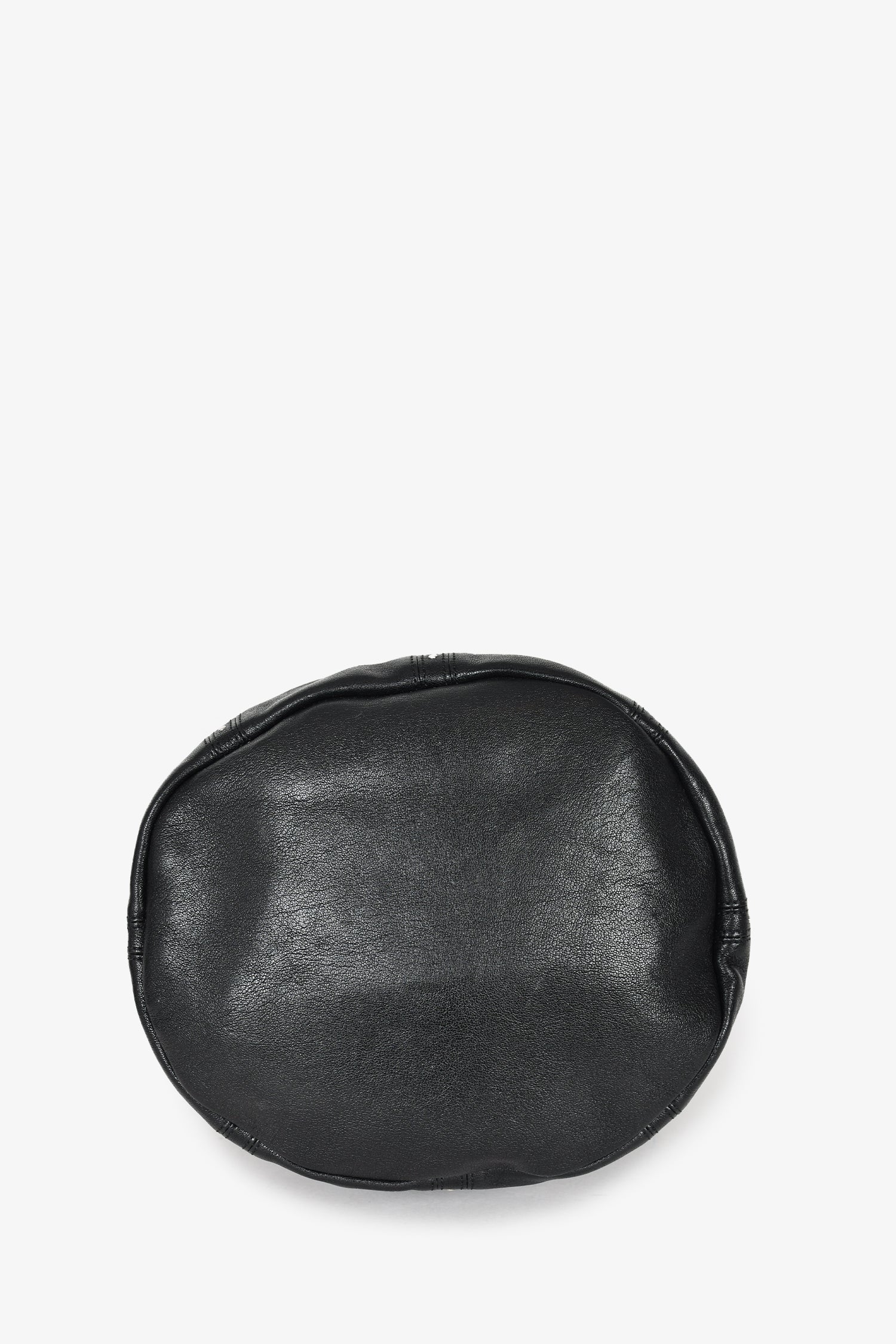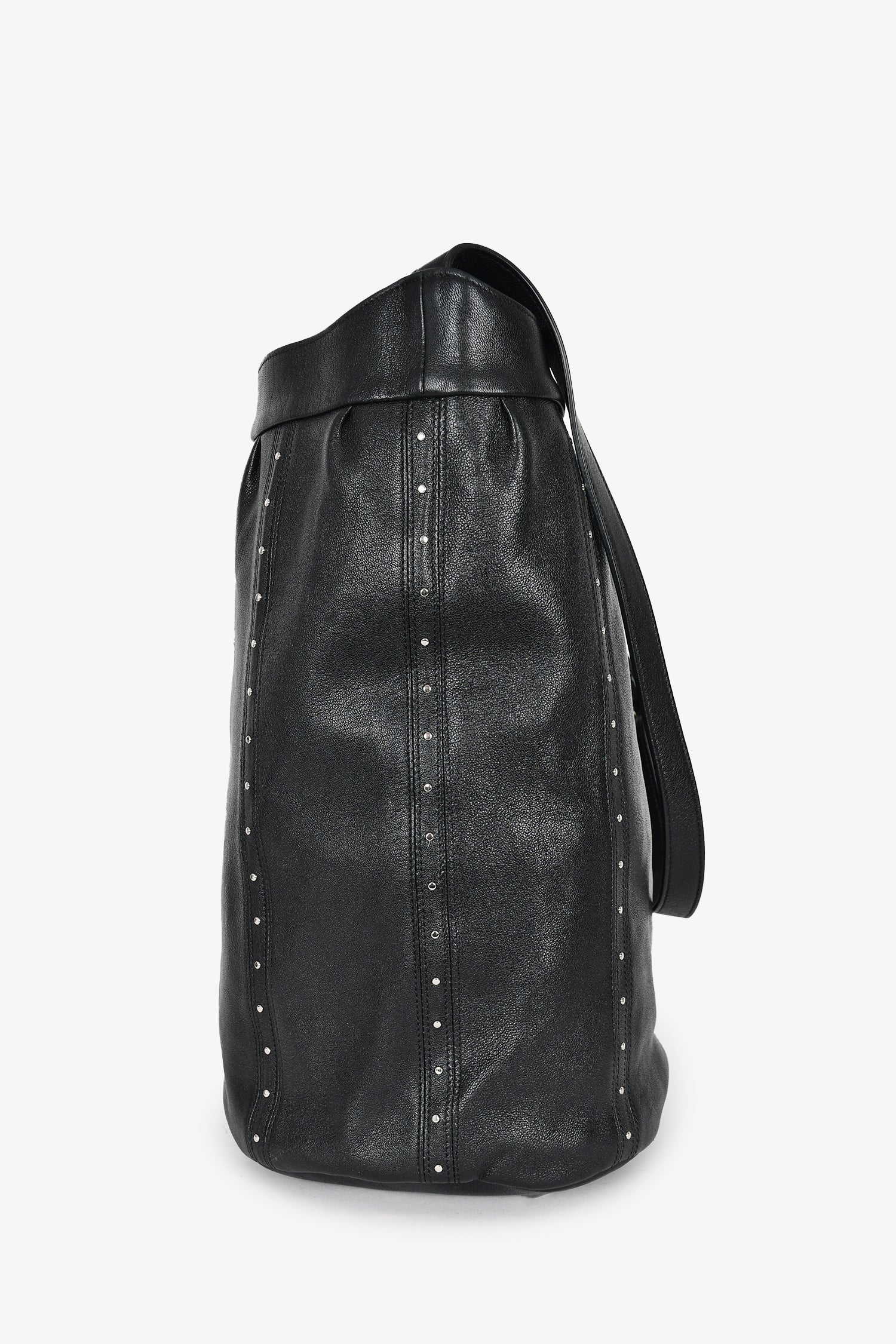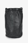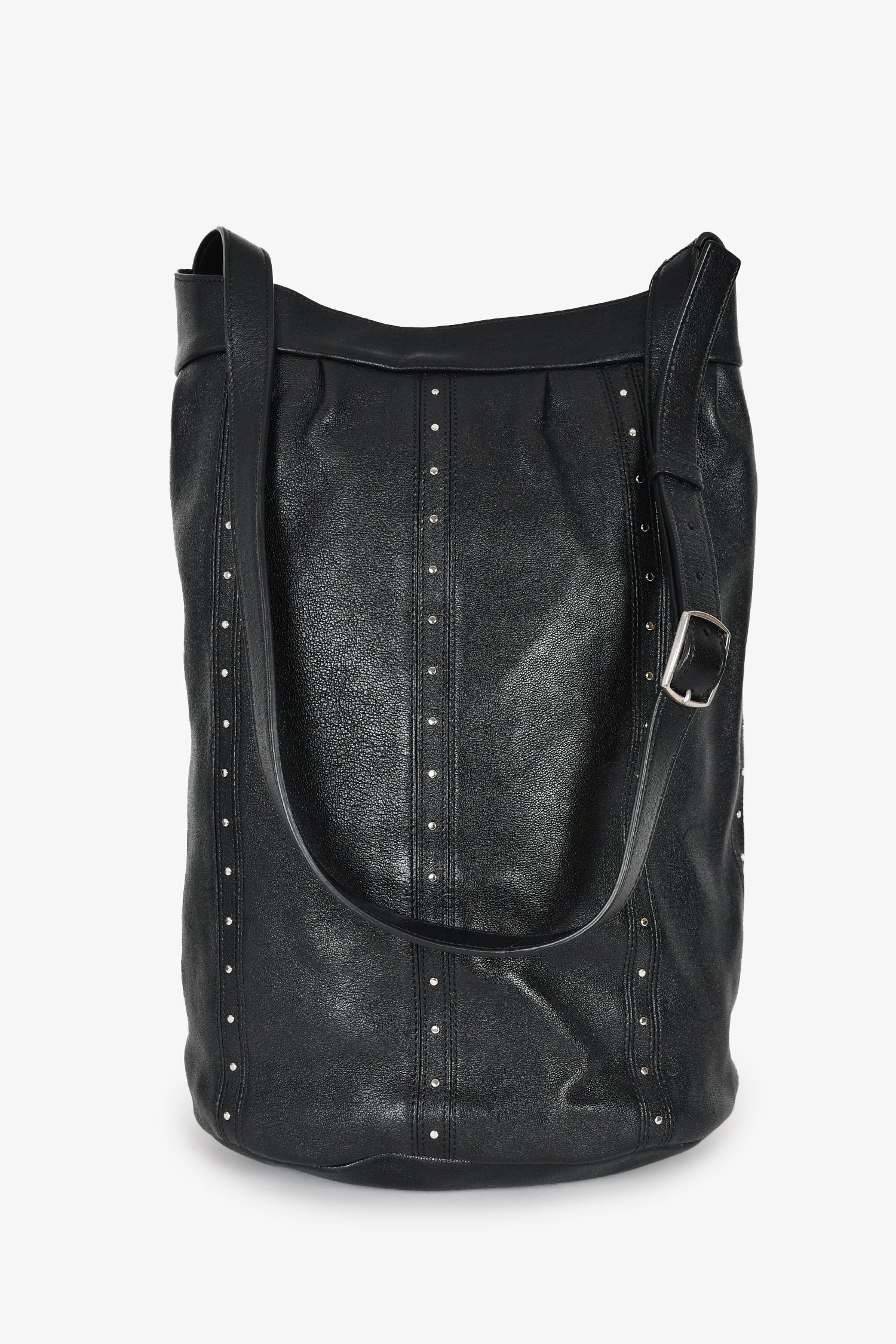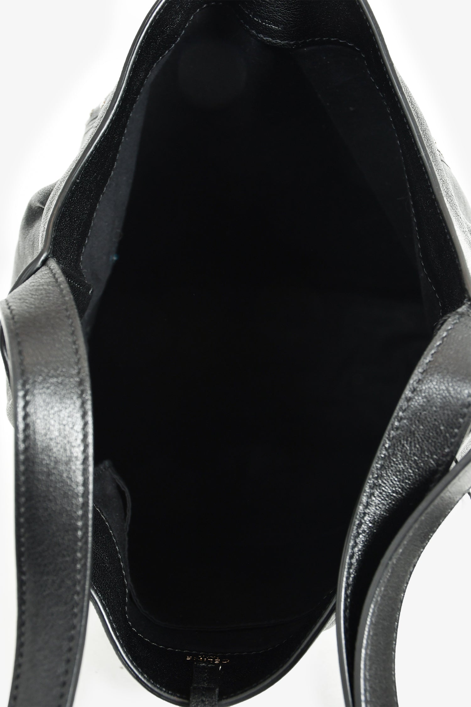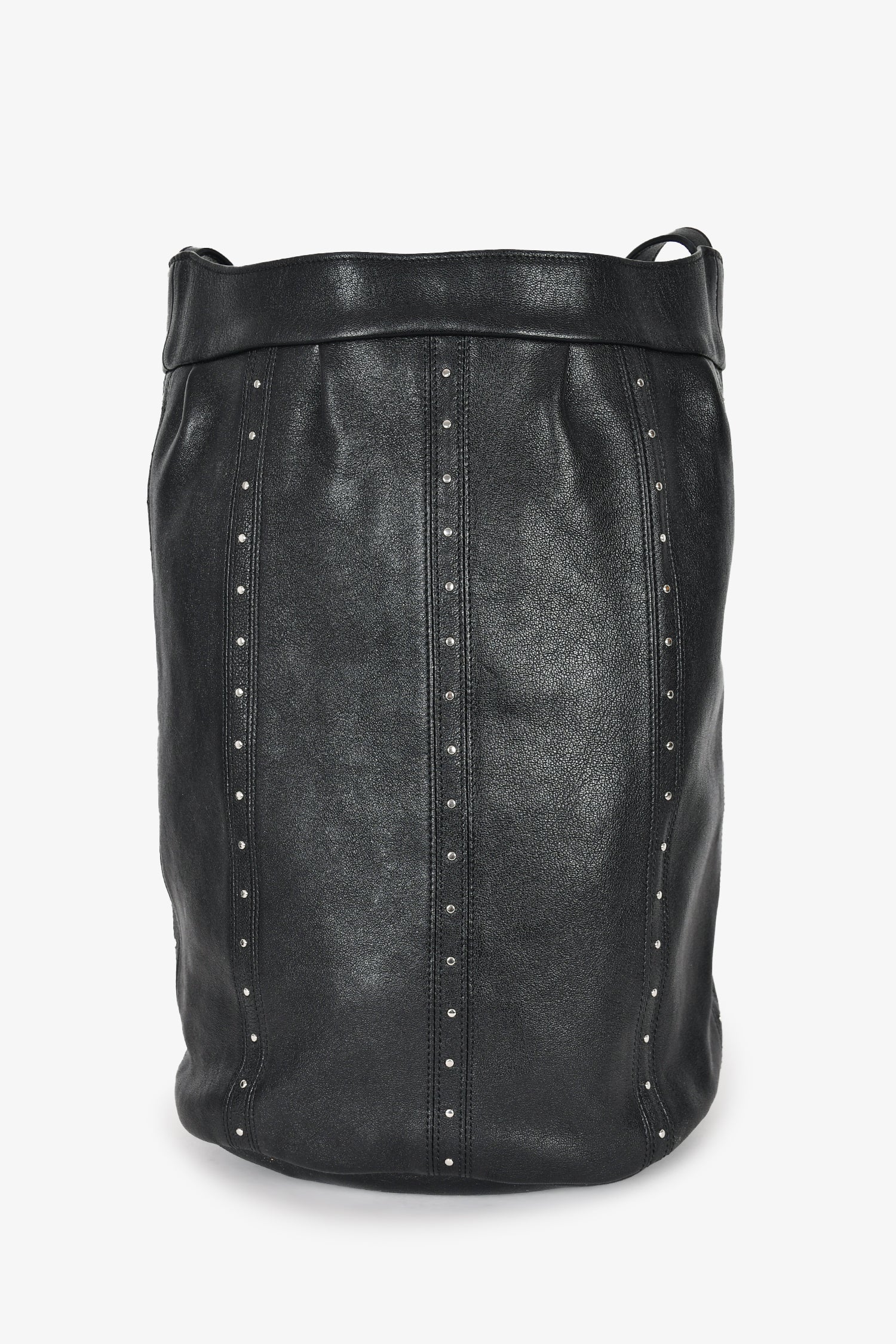 Celine 2019 Black Leather Studded Medium Bucket 16 Bag. Silver-tone hardware. Stud detailing across. Interior tie-up closure. One strap. Tonal stitching.